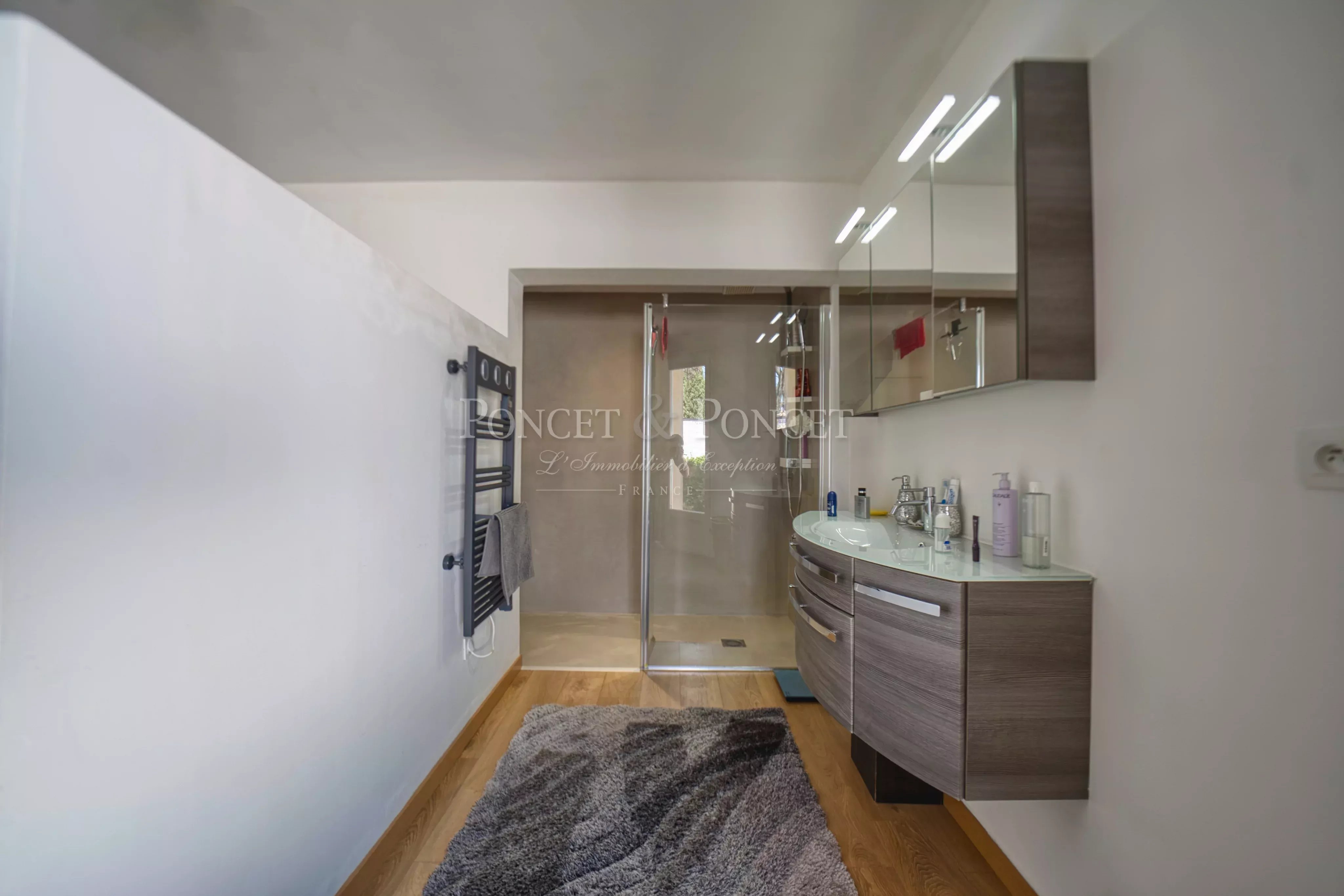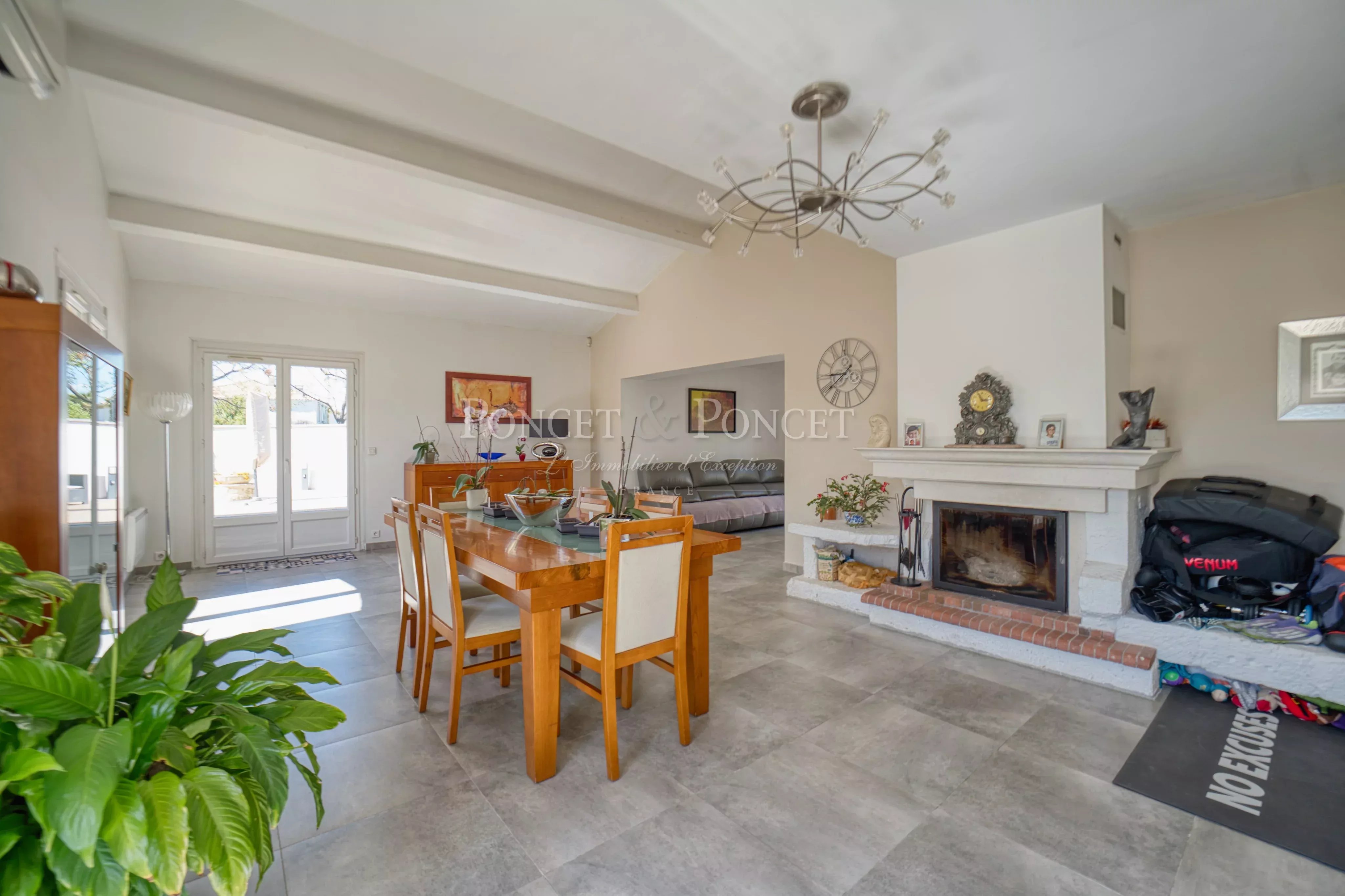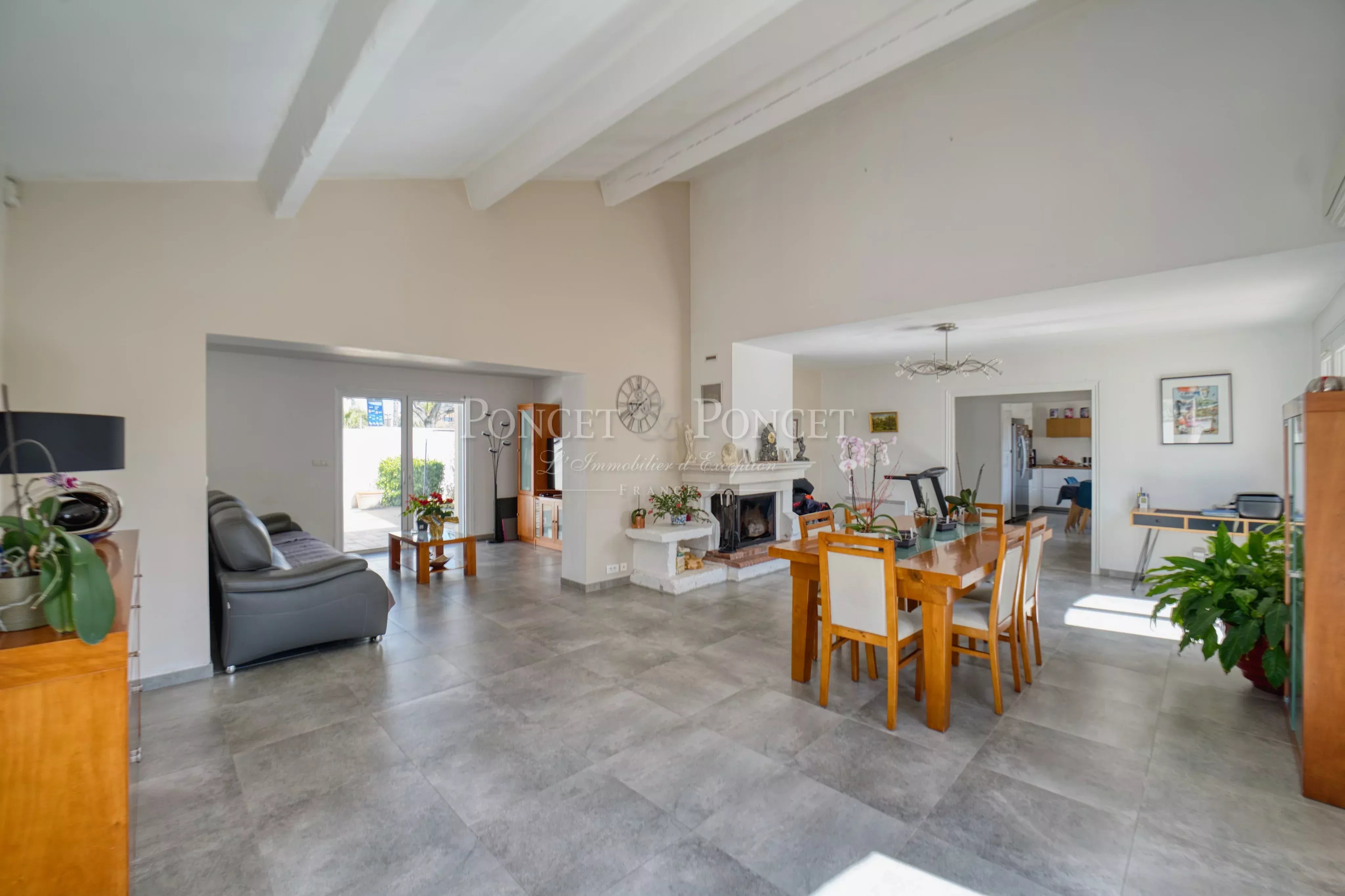 Développant 247 m² sur un terrain arboré de 780 m², la villa séduit par sa pièce de vie de 70 m², baignée de lumière, avec belle hauteur sous plafond et cheminée, ouverte sur la terrasse et la piscine au sel (8x4 m), à l’abri des regards.