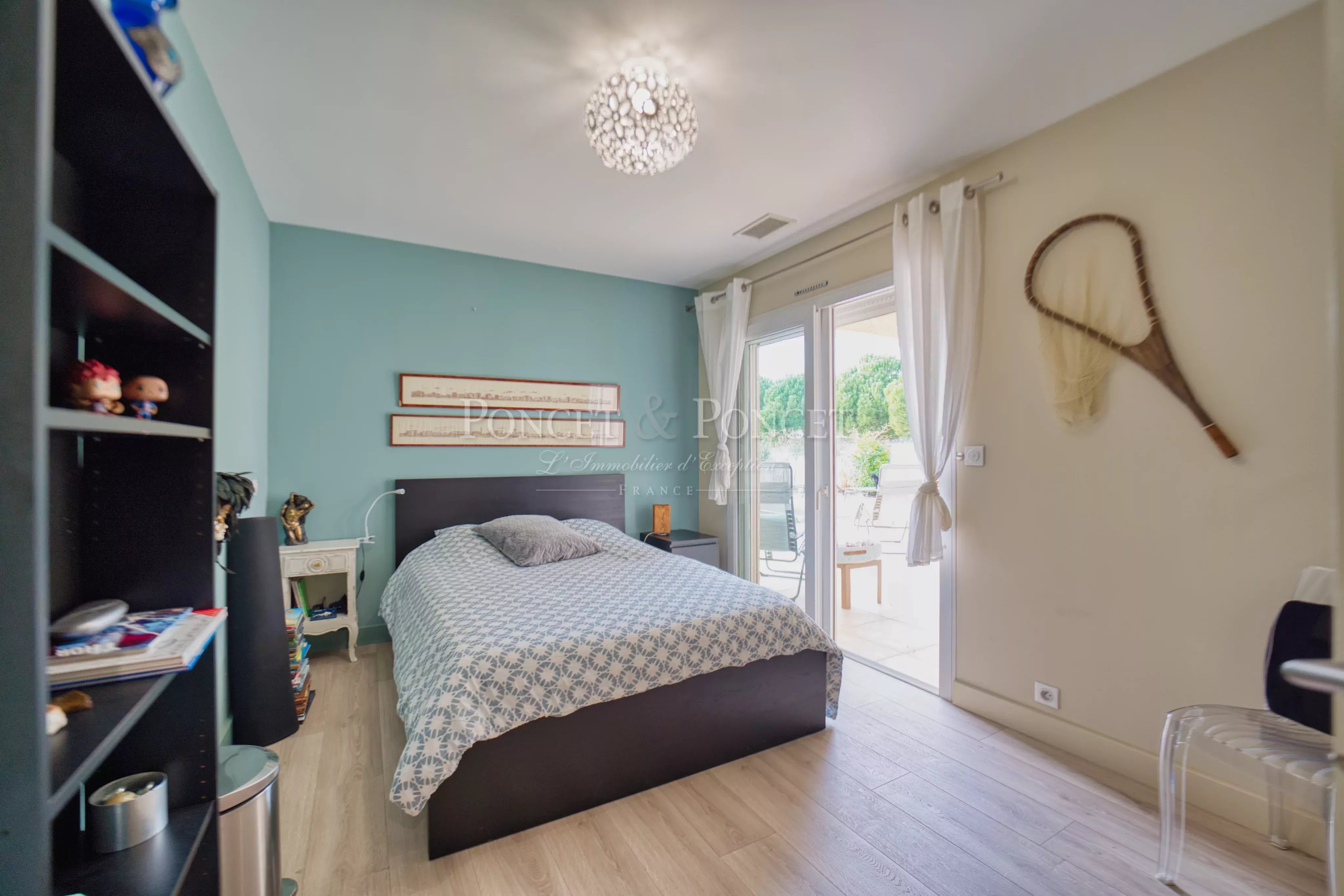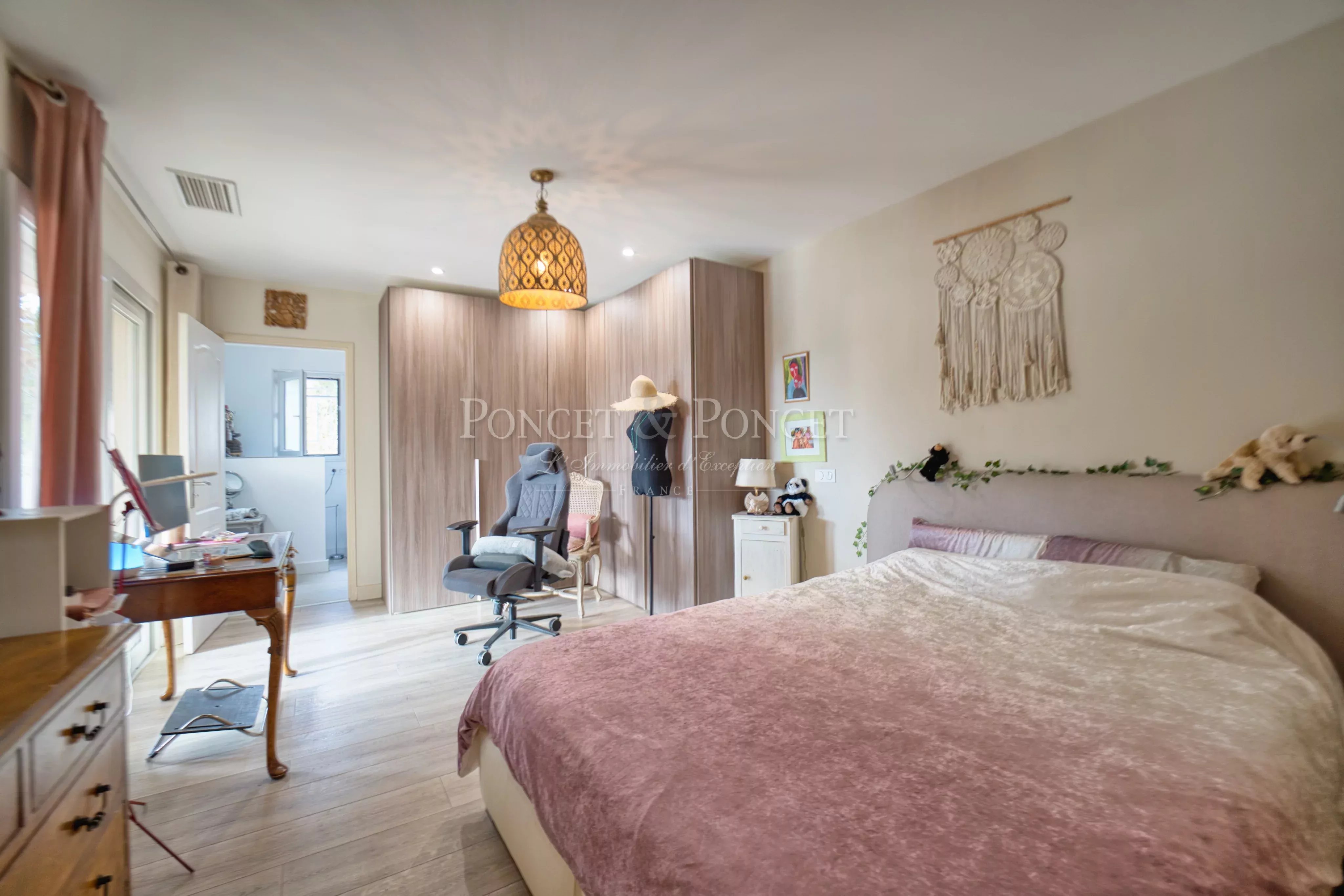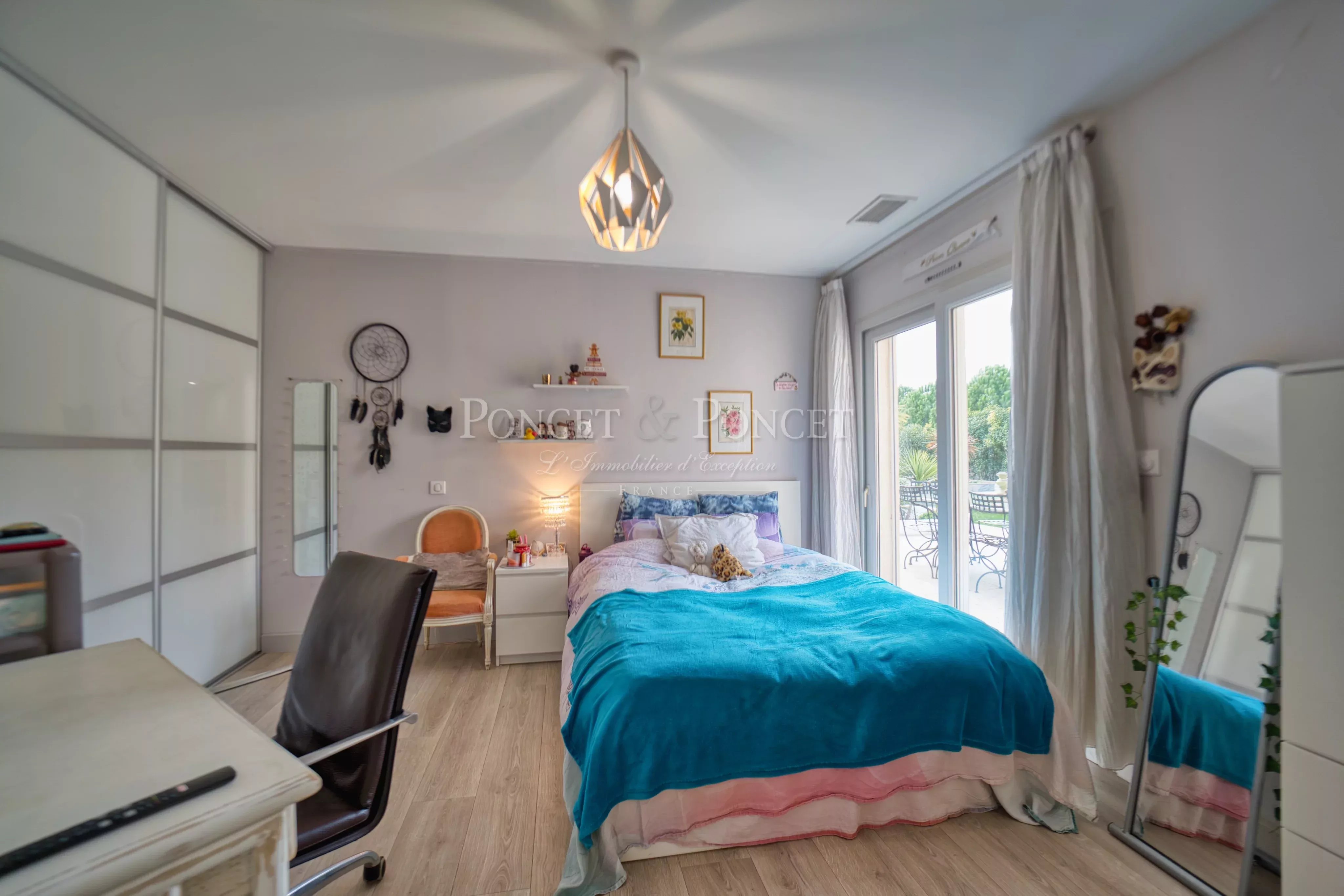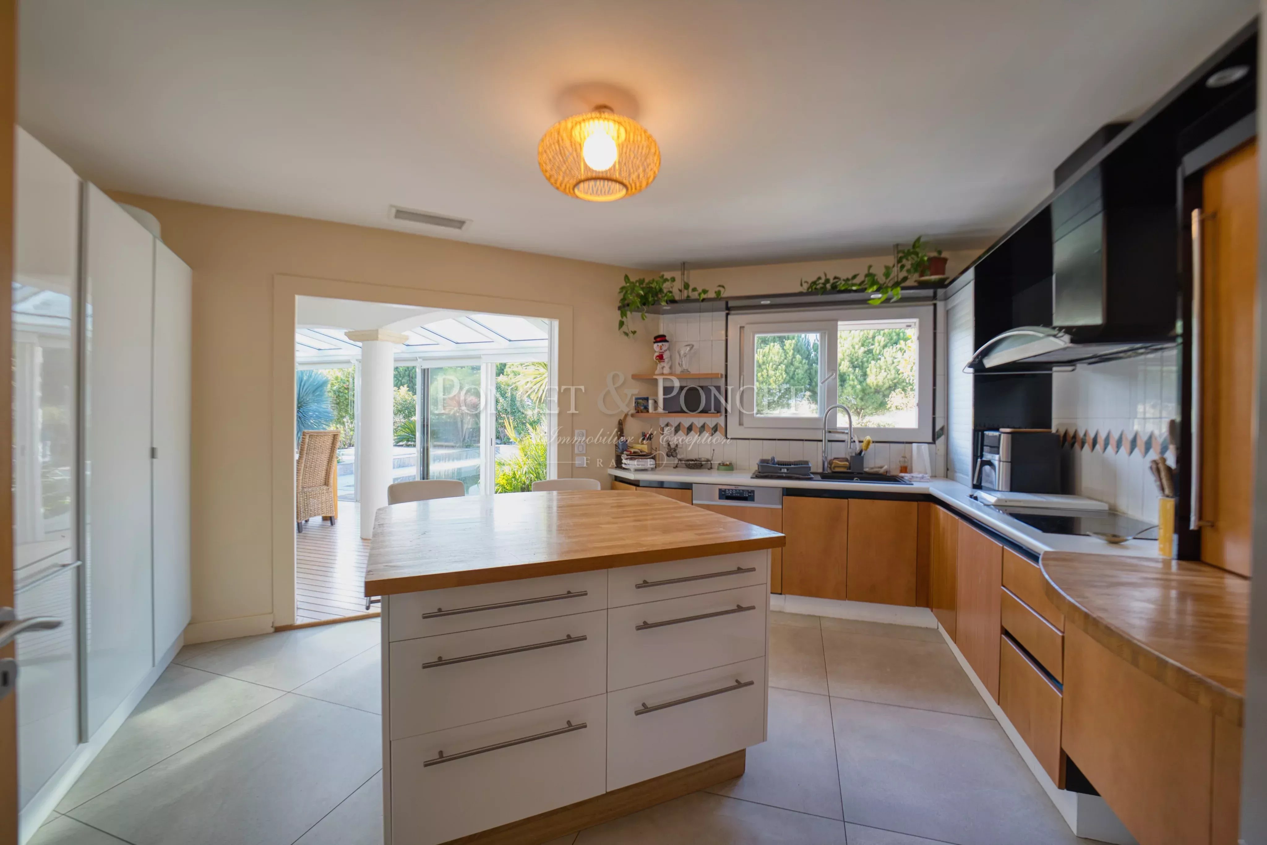 Set on a beautifully landscaped 904 sqm plot with complete privacy, the villa offers 237 sqm of single-storey living space and complies with PMR (reduced mobility) standards. Its location is ideal, with the town centre and tramway reachable within a 15-minute walk and a secondary school nearby.