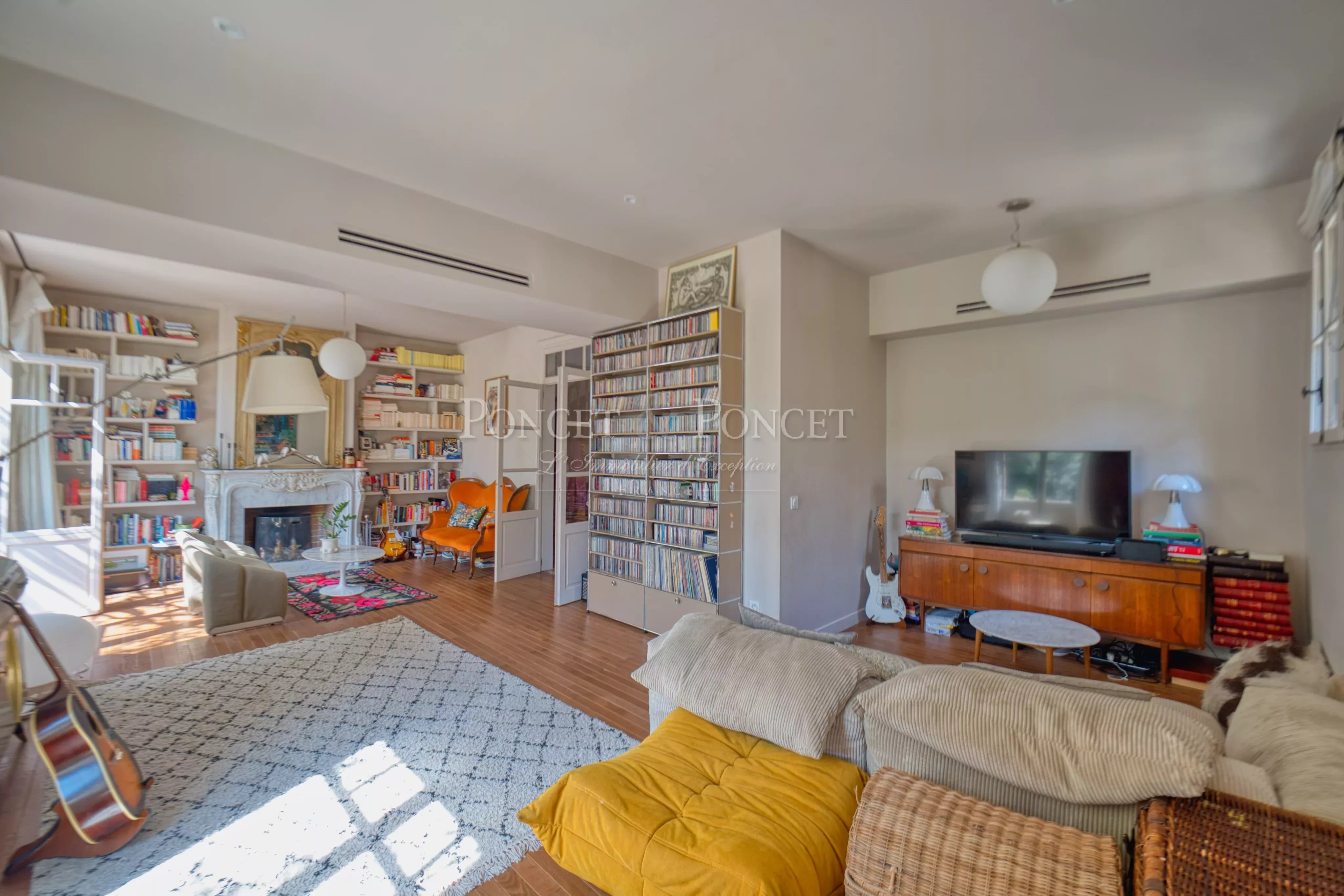 The generously proportioned living room is arranged around a functional fireplace and a bespoke built-in library, creating an atmosphere that is both intimate and sophisticated.