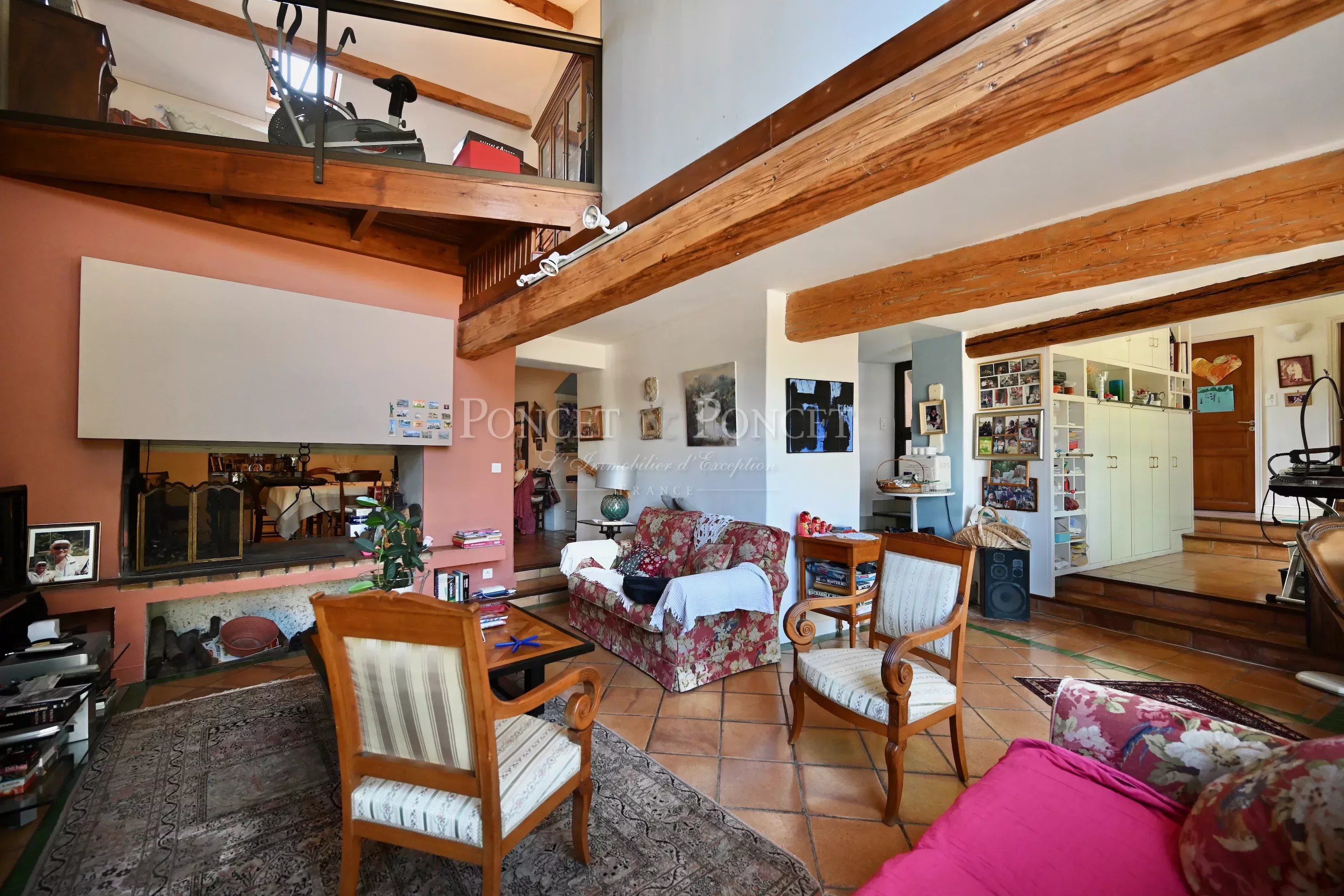 The first floor is accessed via a comfortable staircase in a covered, plant-filled patio. The landing leads to a 22m2 bedroom with en-suite shower room, a 20m2 bedroom with en-suite bathroom and a large mezzanine study above the lounge that could easily become a 3rd large bedroom. A wooden staircase gives access to an extra room for storage or a spare bedroom.