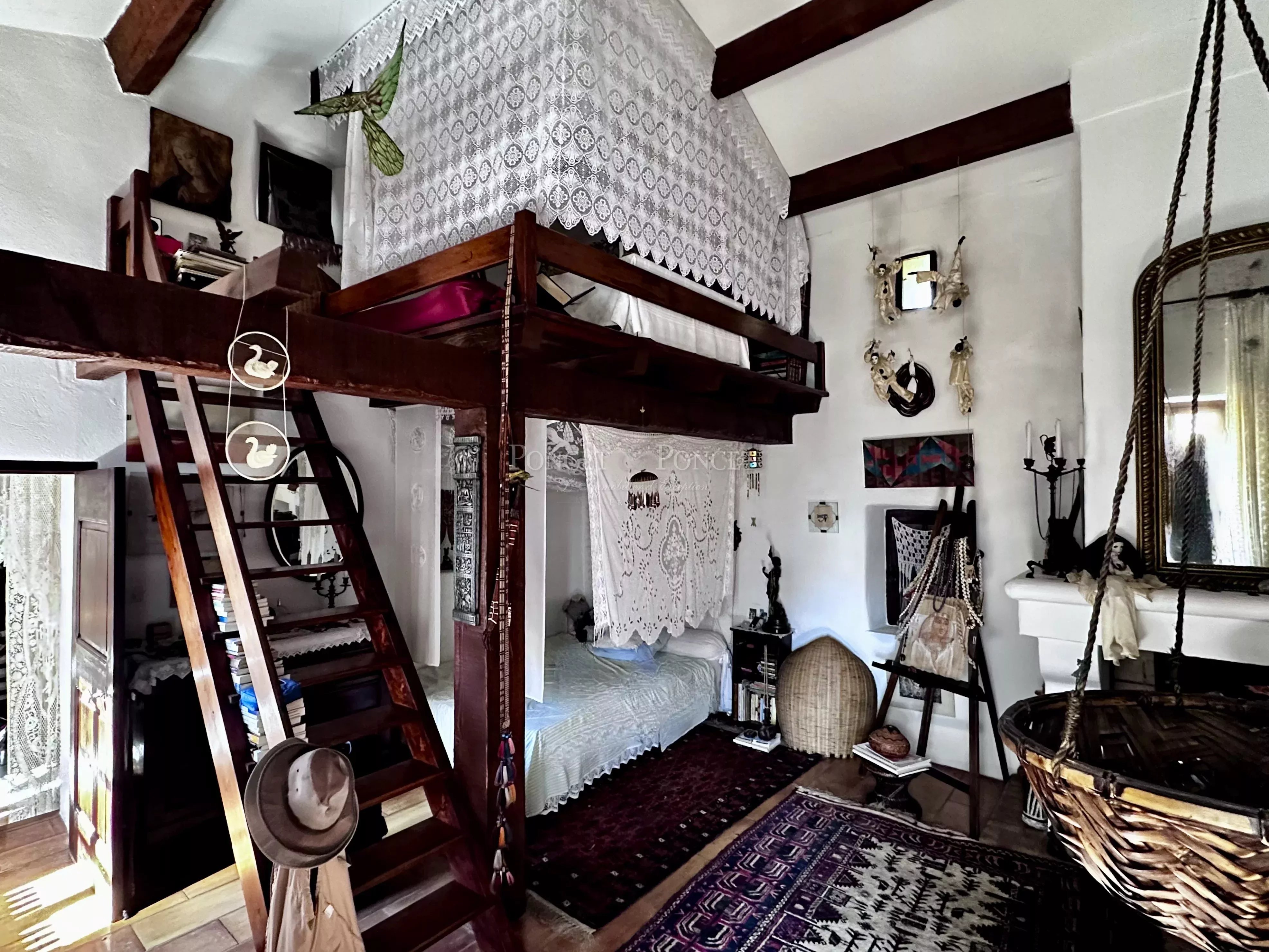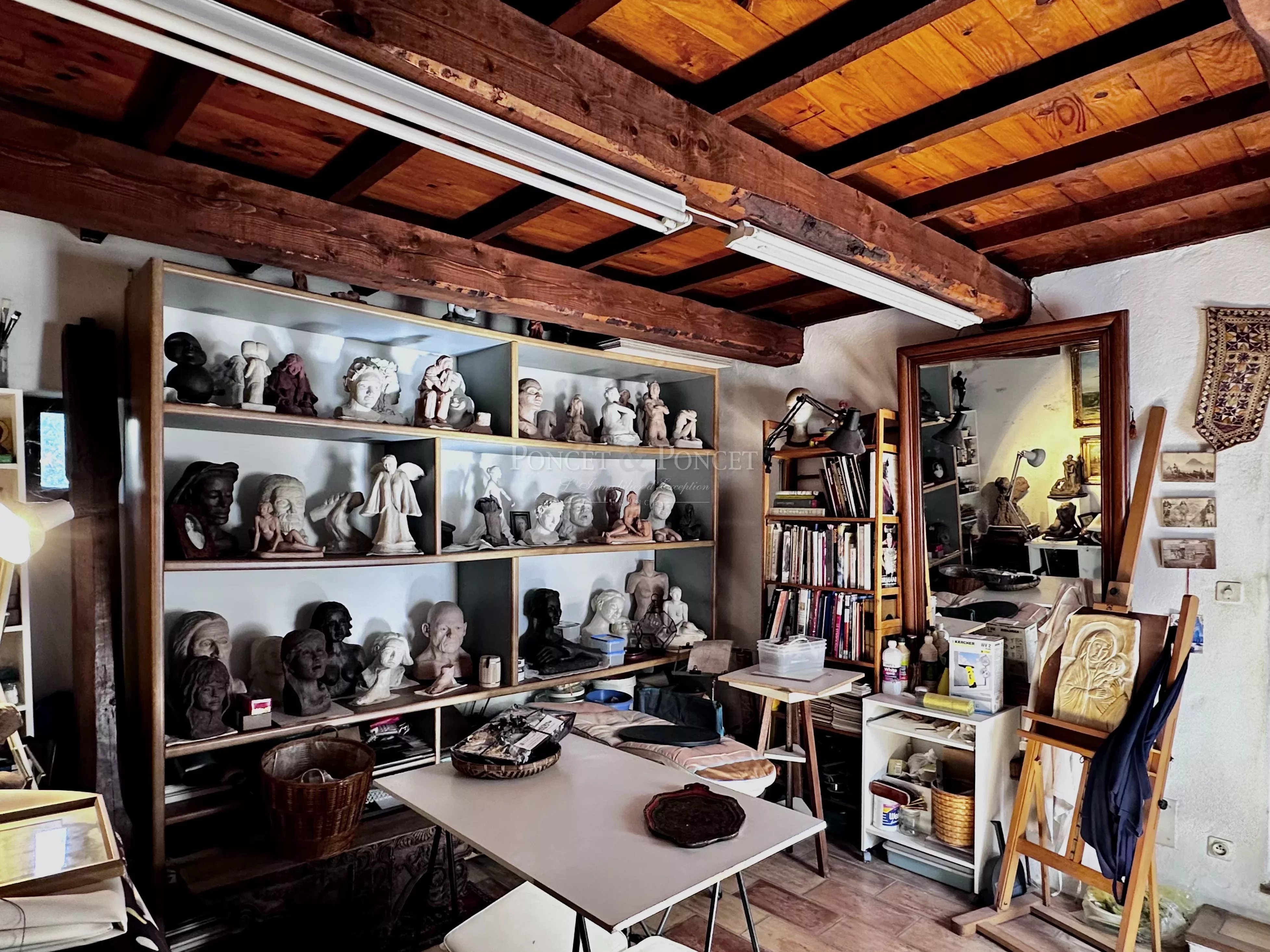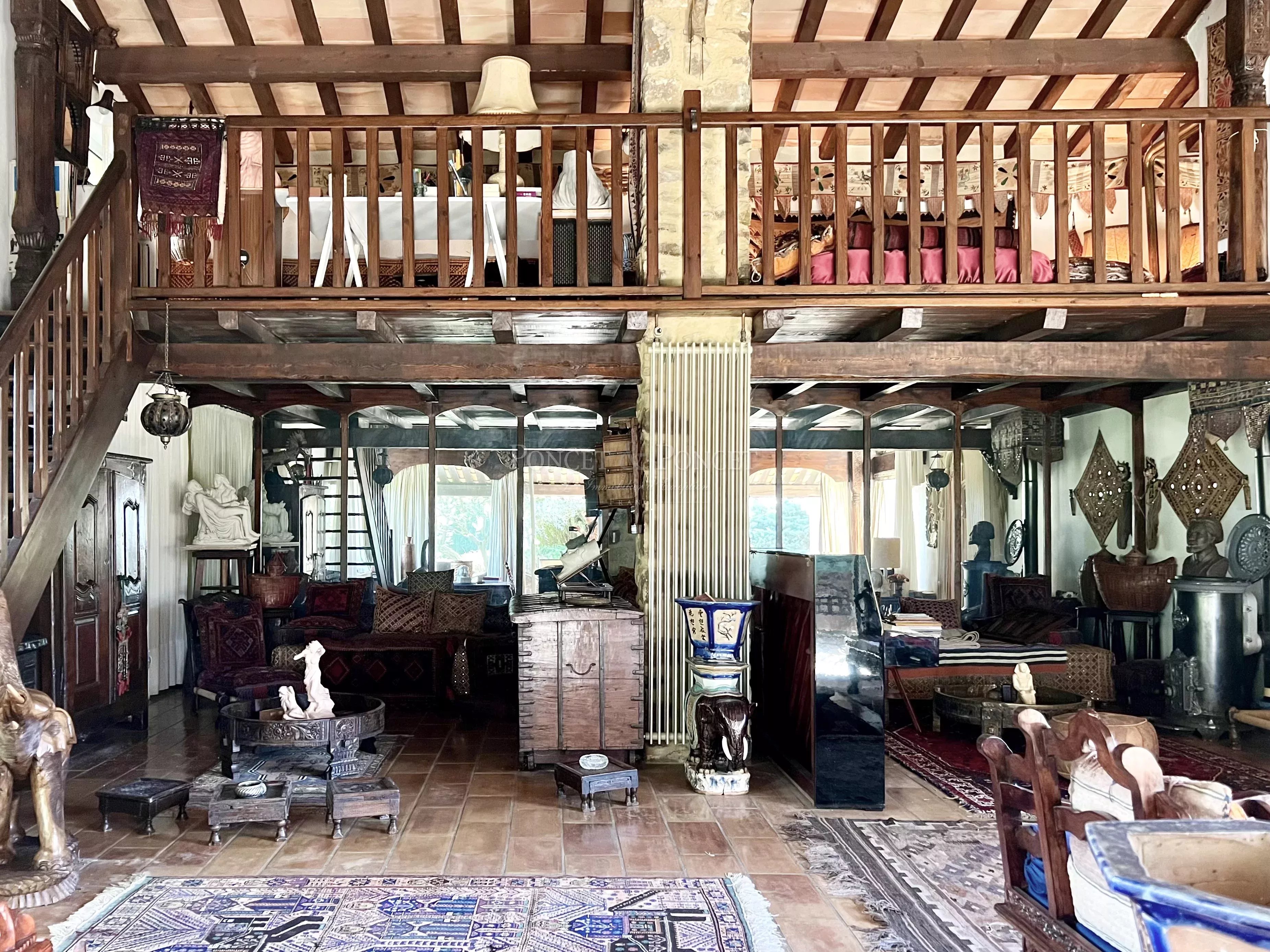 Behind its characterful stone façades, the house reveals a warm and light-filled atmosphere. On the ground floor, a bedroom allows for comfortable single-level living and complements the generous reception areas, which include a spacious kitchen large enough to serve as a dining room, separate guest toilets, and an impressive 55 sqm living room extensively glazed to the south and west, opening beautifully onto the garden. An artist’s studio enhances the creative spirit of the property, while a shower room accessible from the outside, located next to the boiler room, adds practical convenience, particularly during the summer months. A garage completes the ground floor amenities. Upstairs, a family bathroom serves three large bedrooms of at least 20 sqm each, along with an additional charming attic bedroom tucked under the eaves and a generous mezzanine overlooking the living room, creating remarkable volume and a wonderful sense of space. The stone walls, rendered in white on the interior, some ground floor ceilings with exposed beams and traditional parefeuille tiles, and two wood burning stoves by Godin all contribute to the home’s undeniable authenticity and warmth.