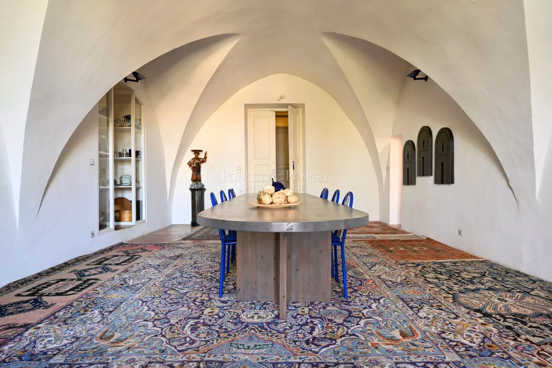 On the first floor, the entrance hall offers a glimpse of the majestic central staircase. Every room on this level has access to the garden, offering a wealth of possibilities. A first vaulted kitchen opens onto an outdoor space ideal for al fresco dining. A large bedroom adorned with vaulted ceilings, moldings and cement tiles seduces with its charm. A second bedroom is nestled in the tower. A room currently used as an artist's studio could be converted into a bedroom. A final bedroom, with bathroom, could be used as an independent apartment. The wine cellar is also on this level.