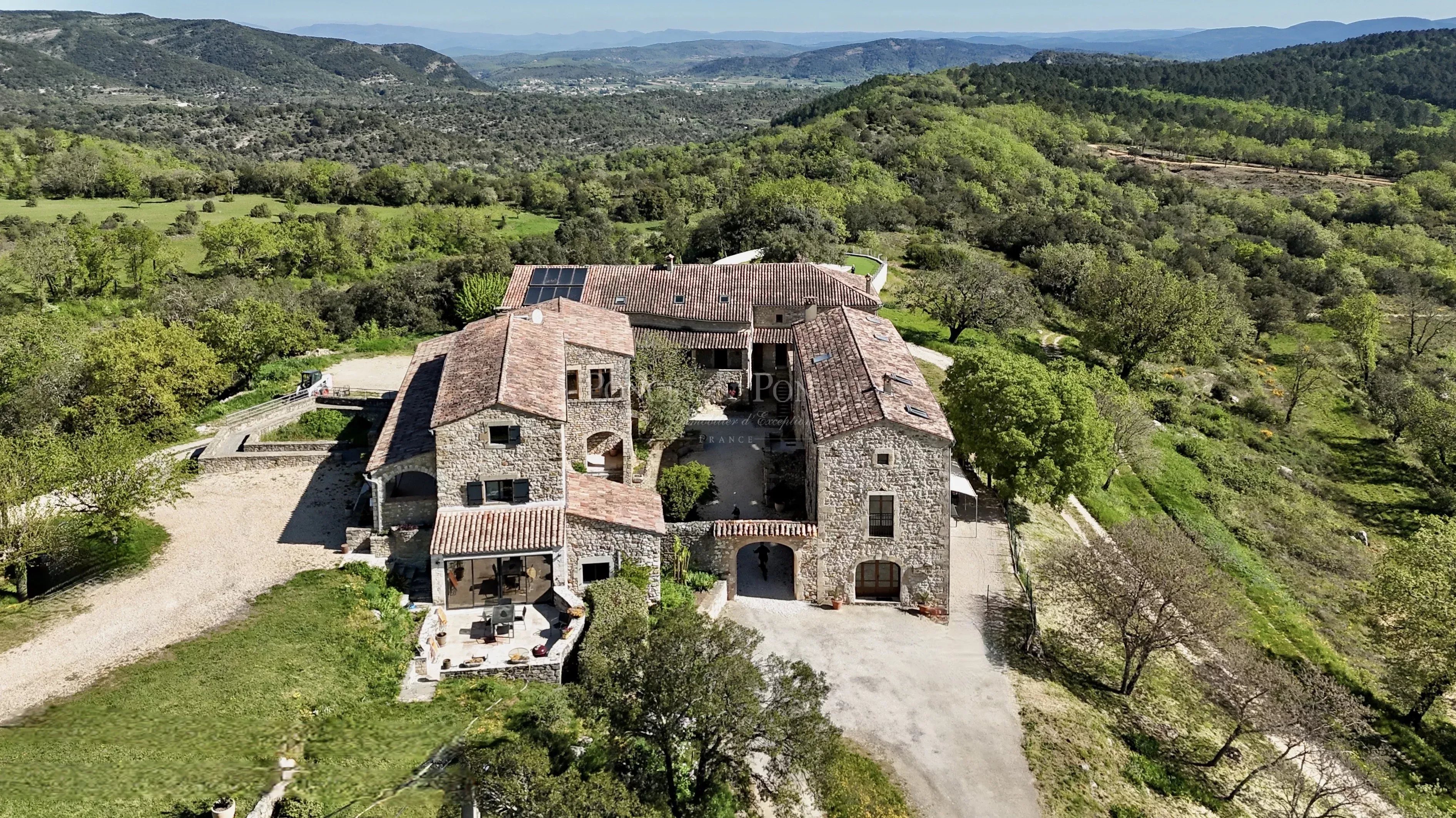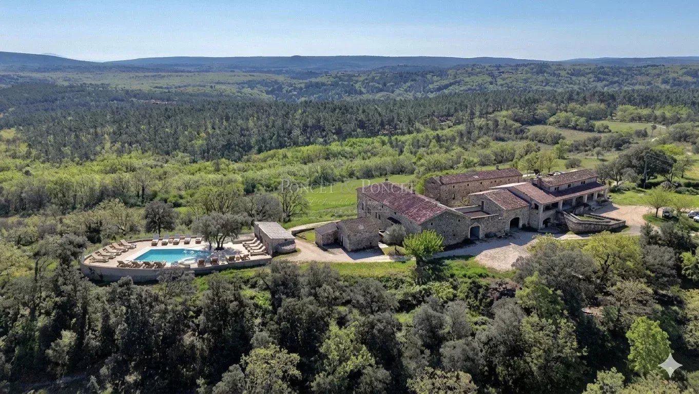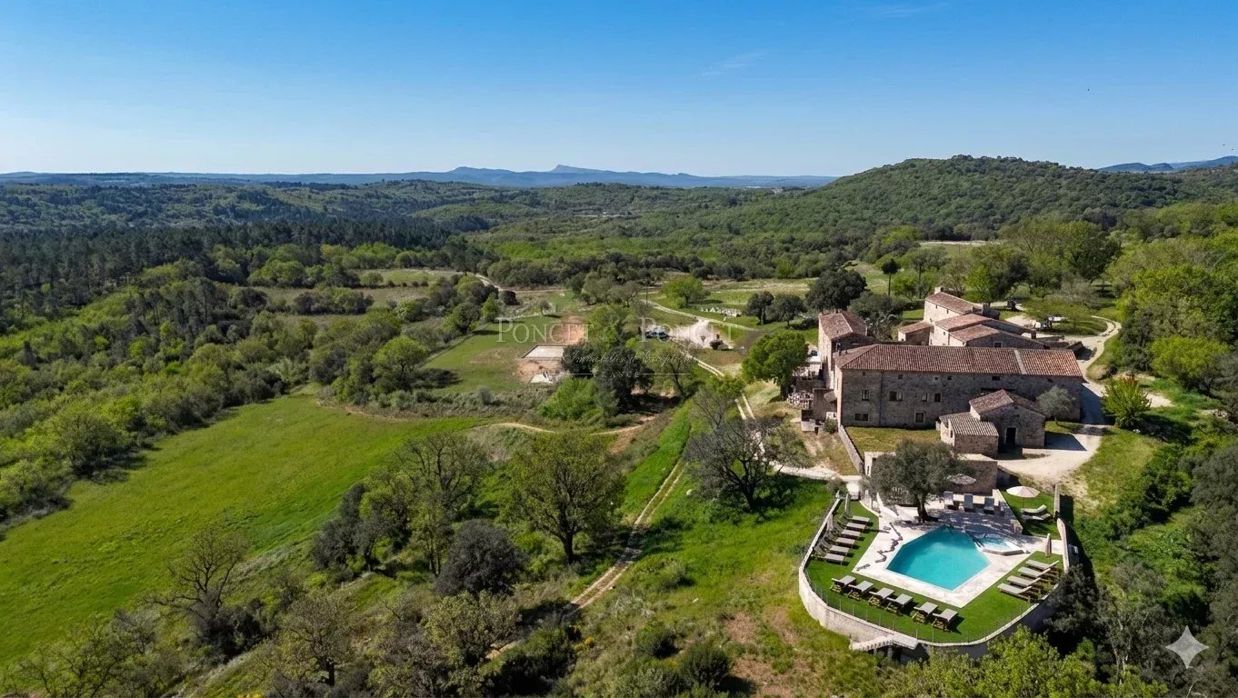 At the heart of an estate of approximately 50 hectares, the property is set within a landscape of rolling hills and typical southern Ardèche vegetation, offering open views and a high level of privacy. Its elevated position provides an extended panorama with no direct overlooking. Located within easy reach of renowned natural and heritage sites, the setting is suitable both for private use and for a hospitality business, with convenient access while remaining away from busy roads.