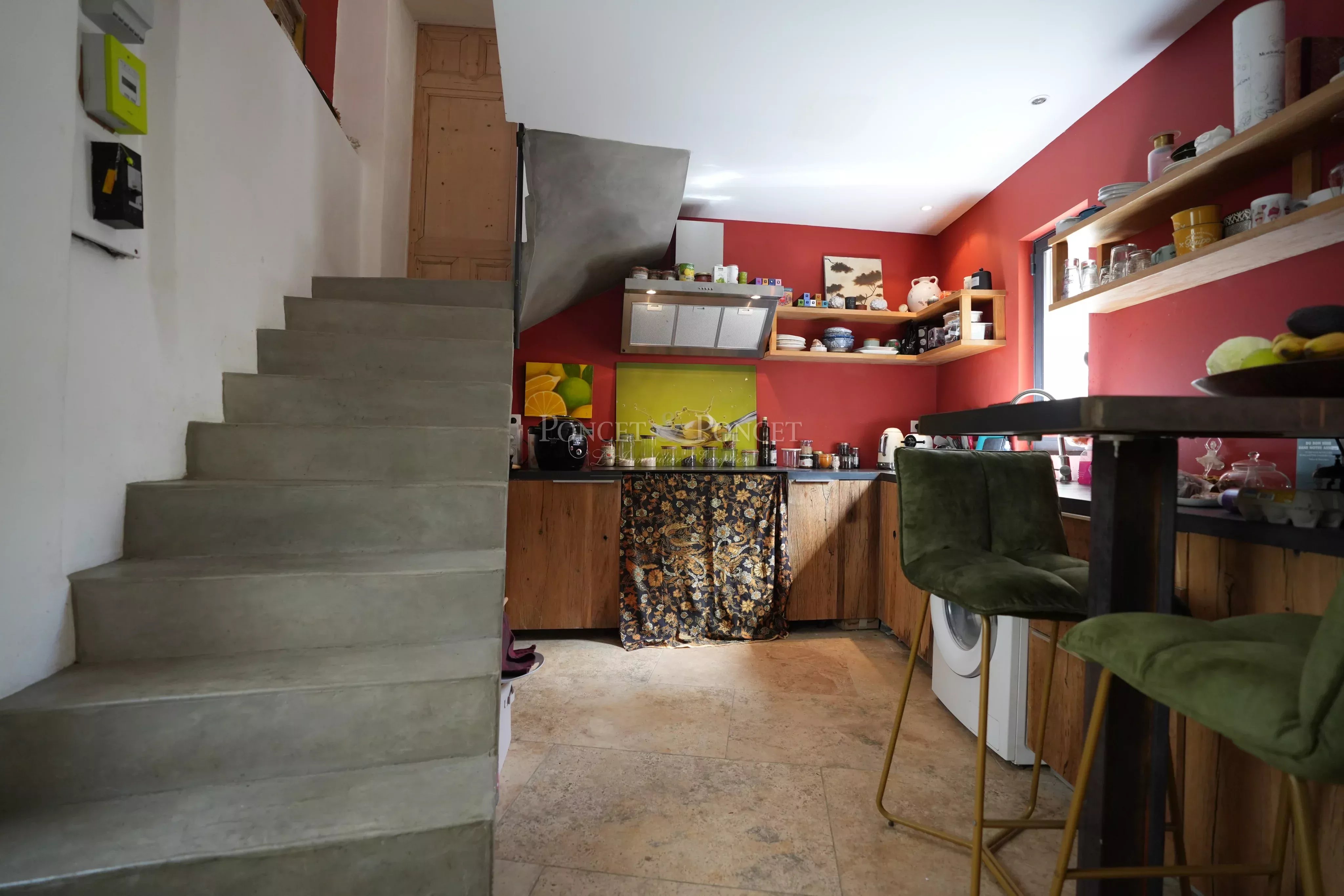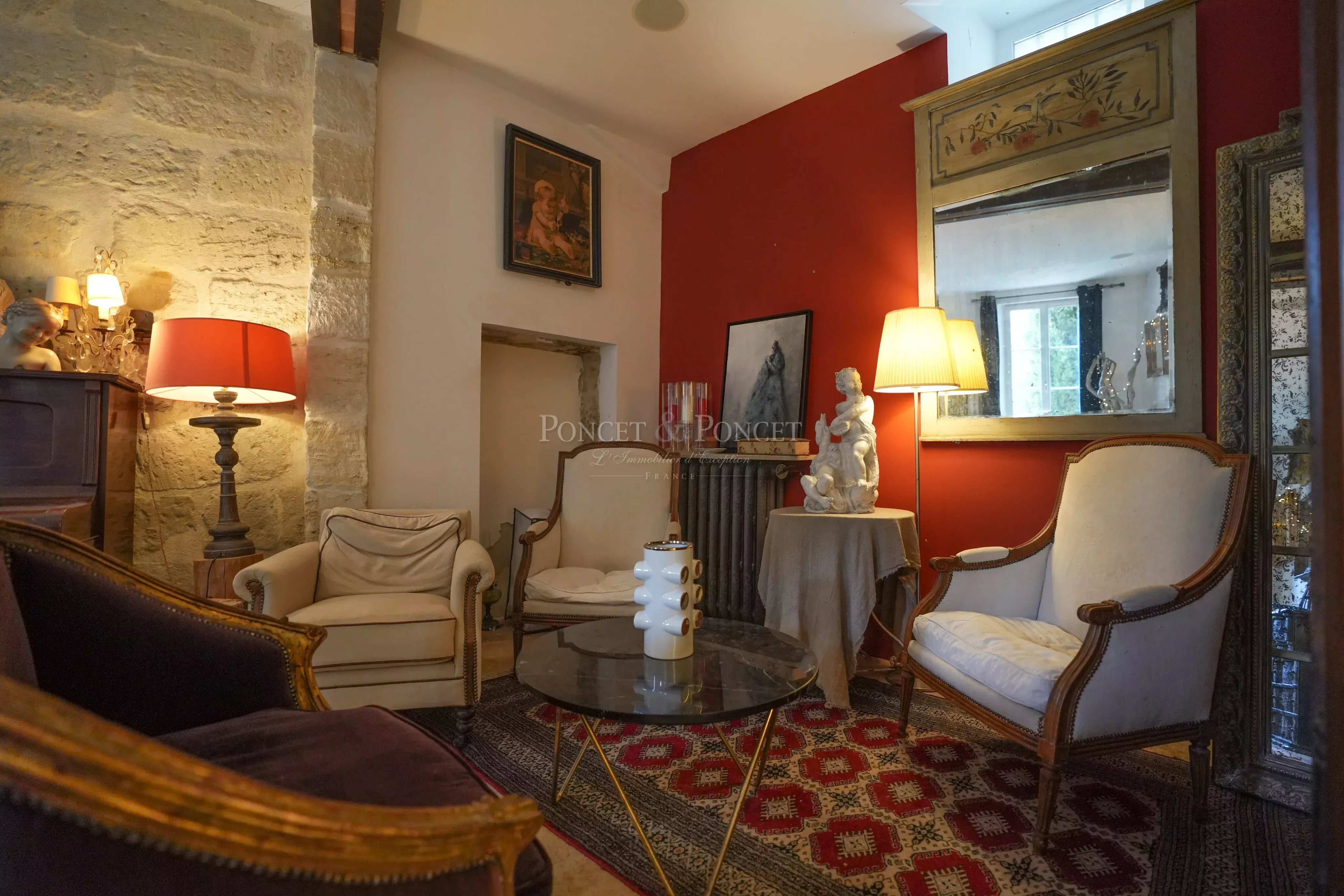 Behind its stone walls, La Maison Rouge reveals a refined interior where every detail has been thoughtfully considered. Its grand stone staircase, the centerpiece of the home, is a striking testament to its rich history and timeless elegance.