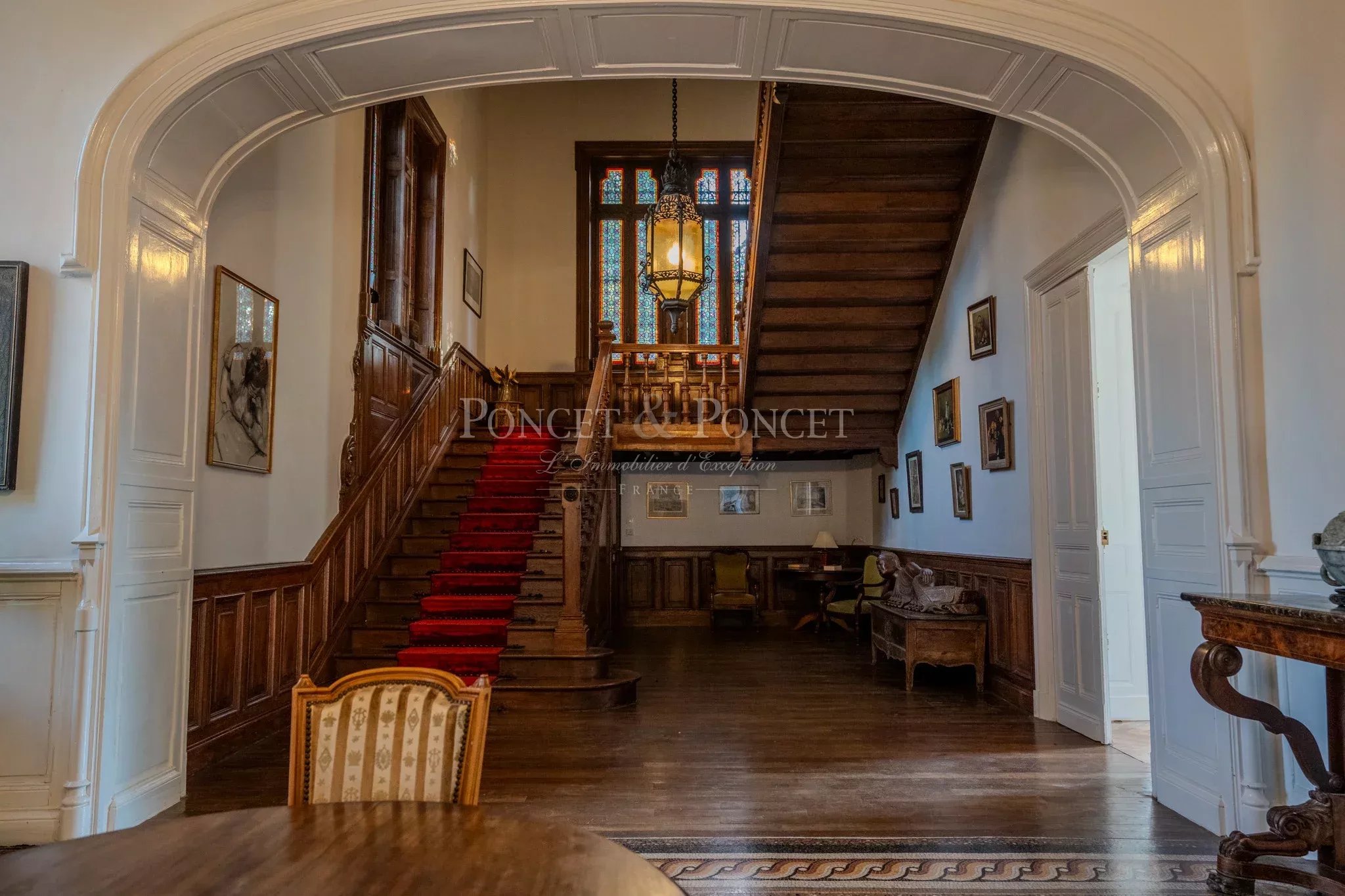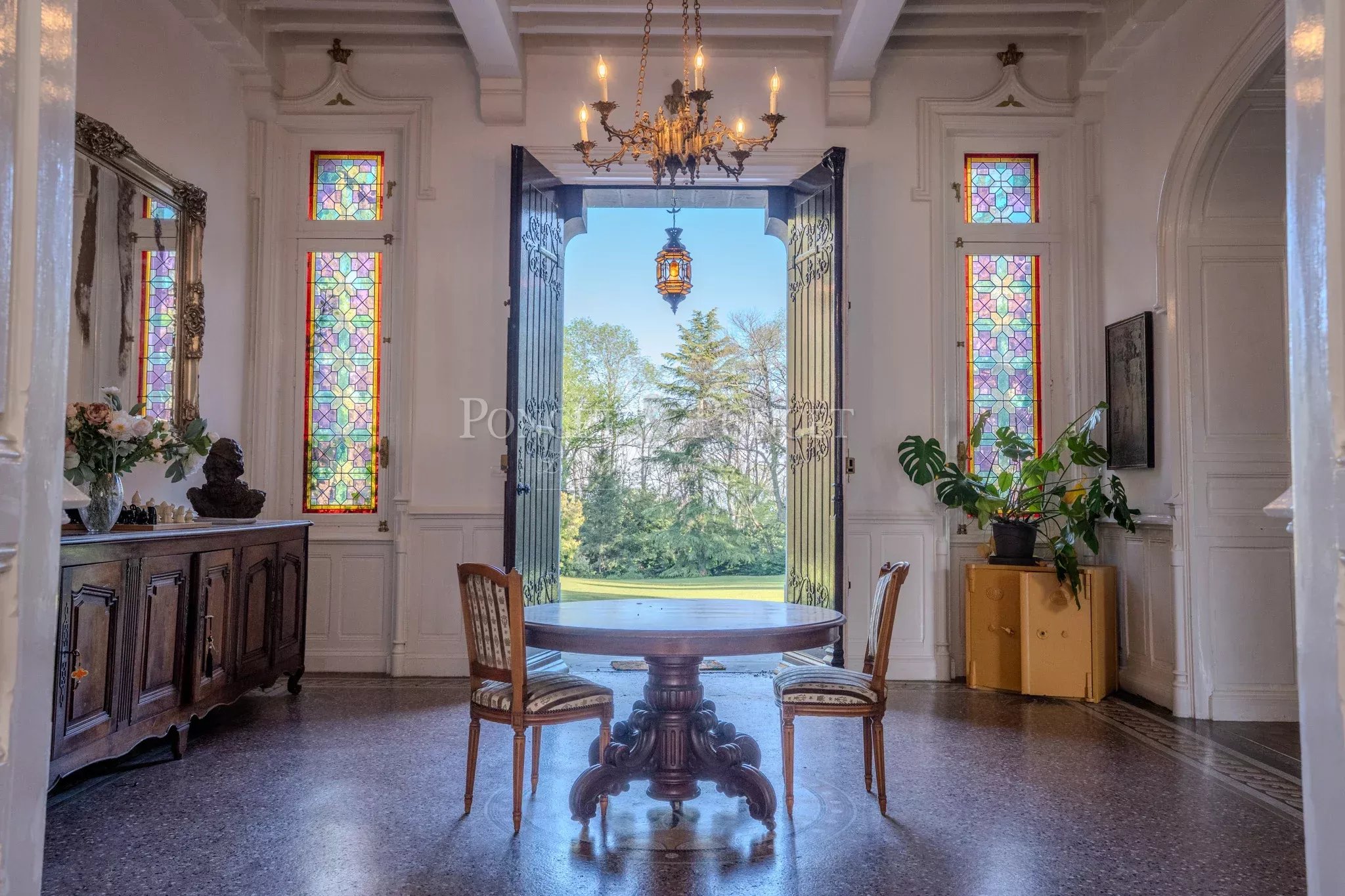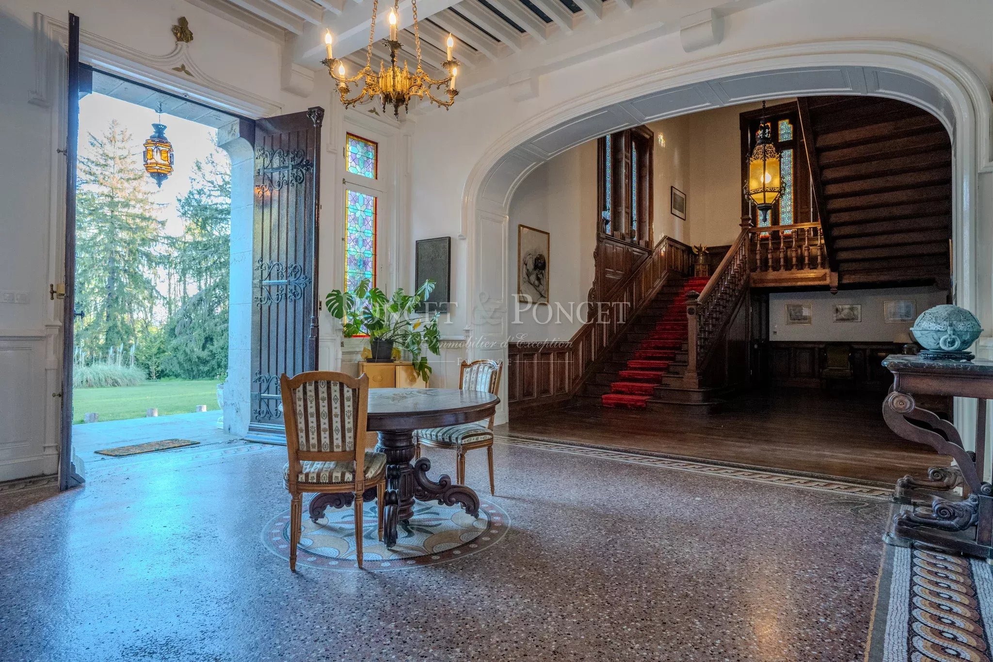 Once you pass through the heavy, reassuring entrance door, you will be welcomed into a vast entrance hall with a French ceiling, mosaic floor, and neo-Gothic details.