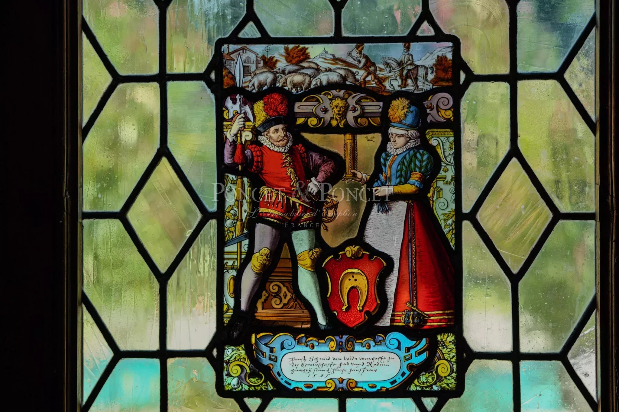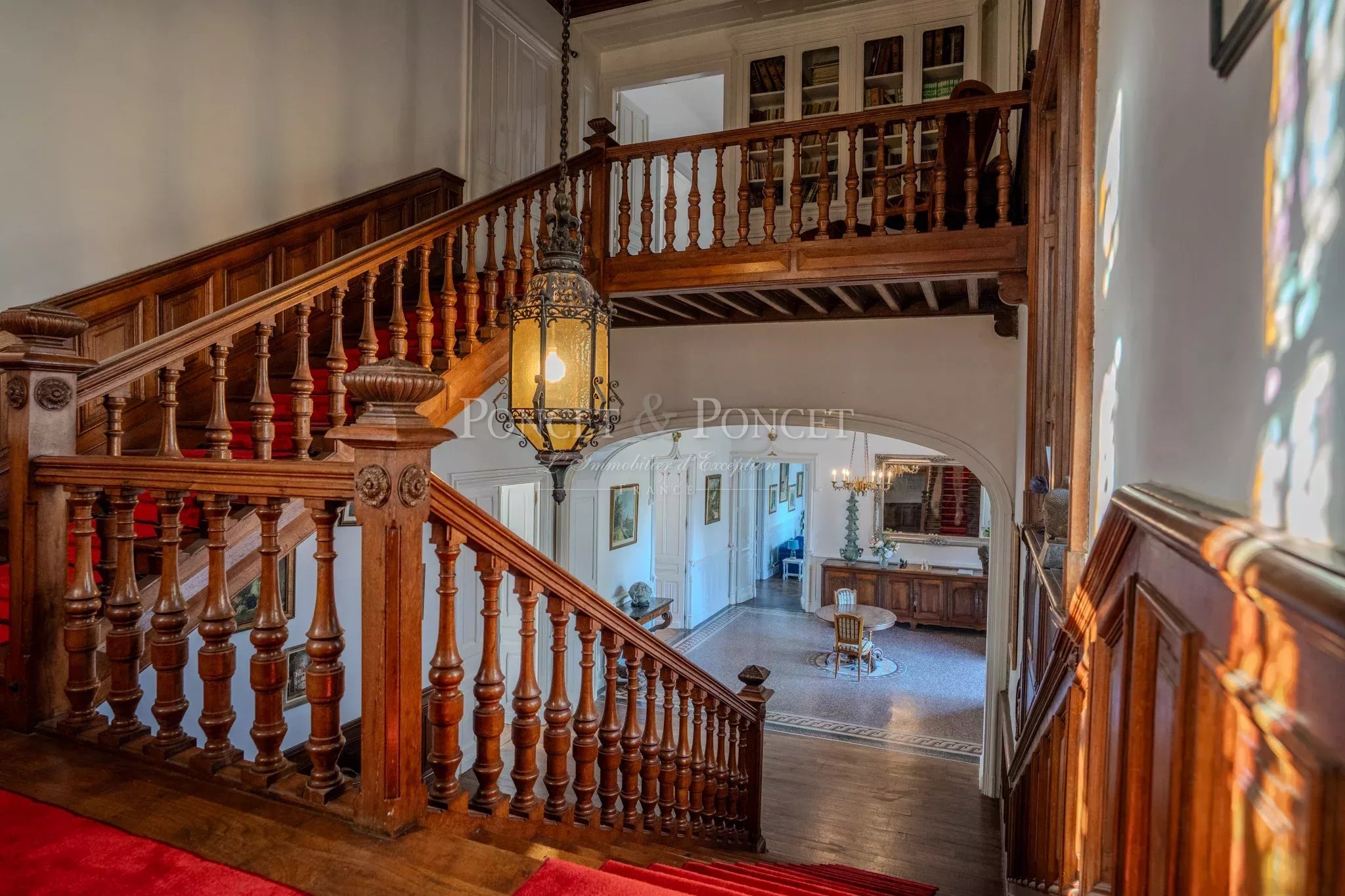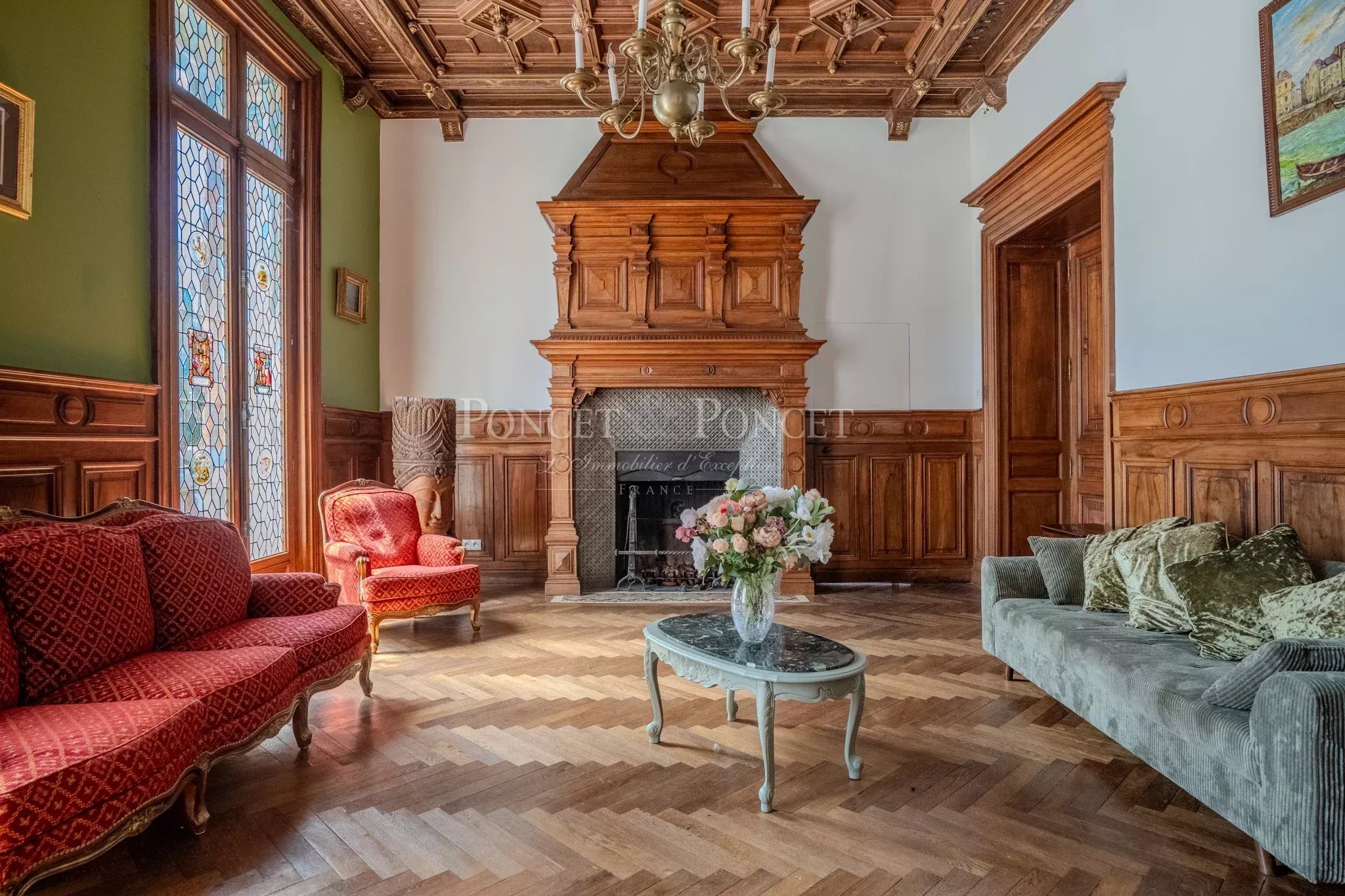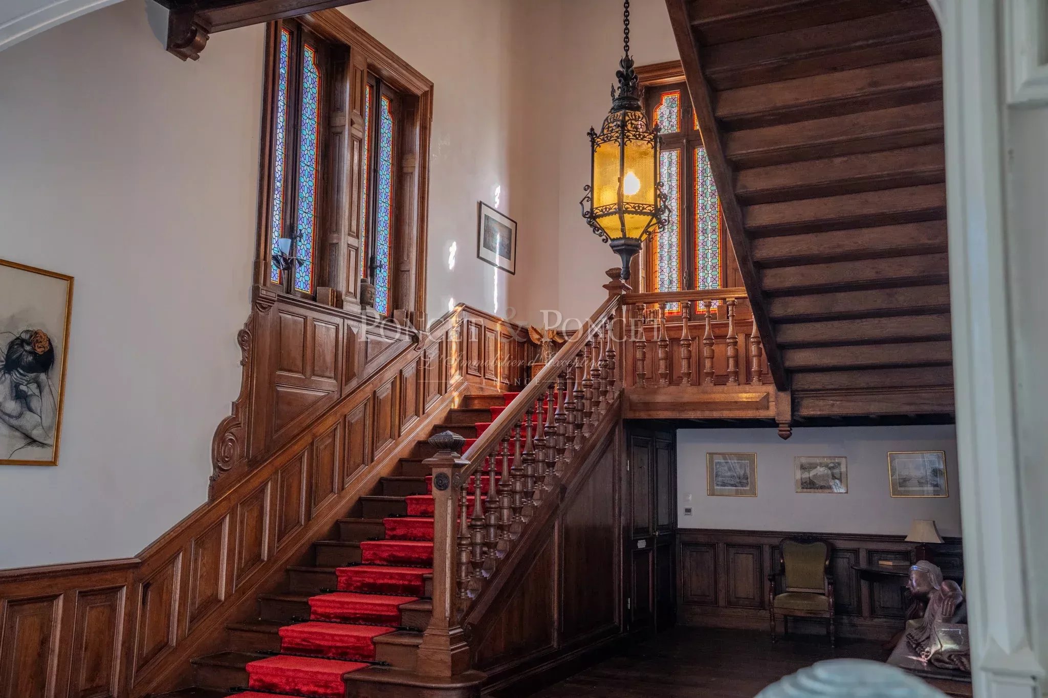 Once you pass through the heavy, reassuring entrance door, you will be welcomed into a vast entrance hall with a French ceiling, mosaic floor, and neo-Gothic details.