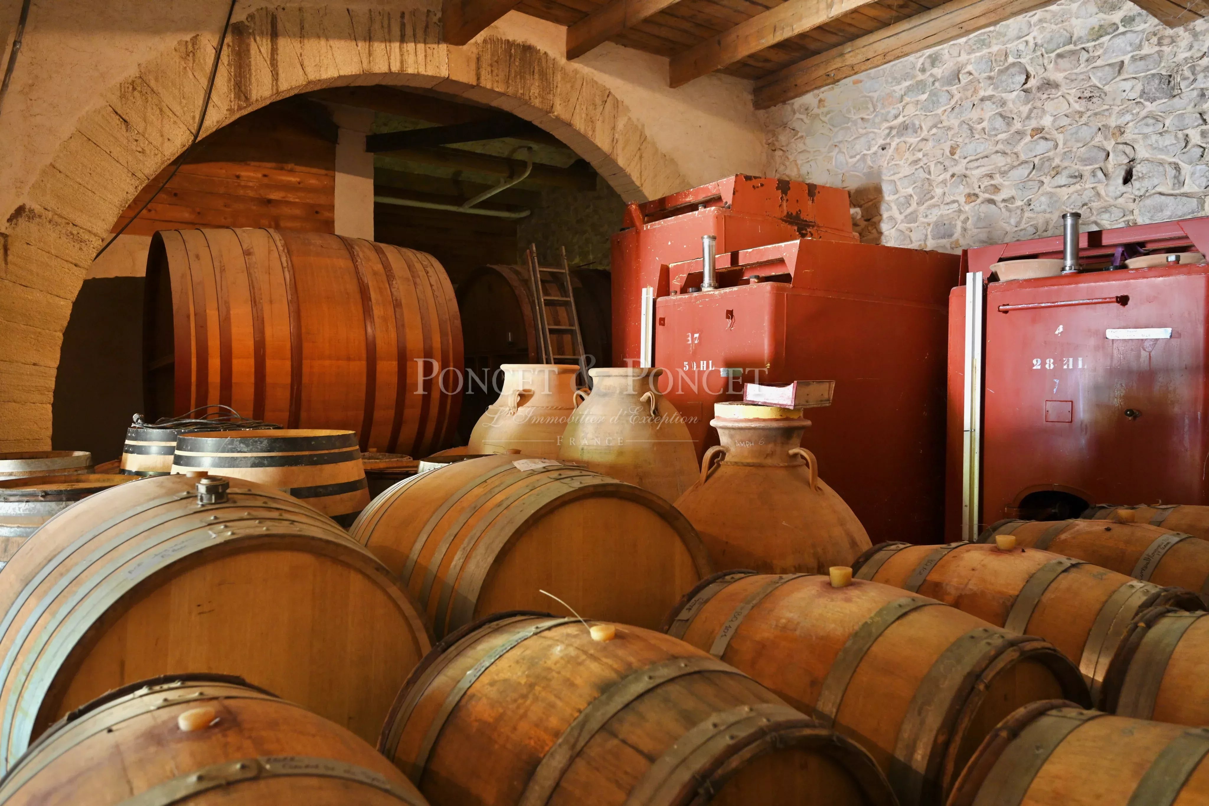 The ground floor currently houses areas related to the estate’s activity (a small reception area, offices, ageing cellar), while the upper floor offers 150 m² of living space, with the potential to extend by 90 m² into the attic, which is on the same level.