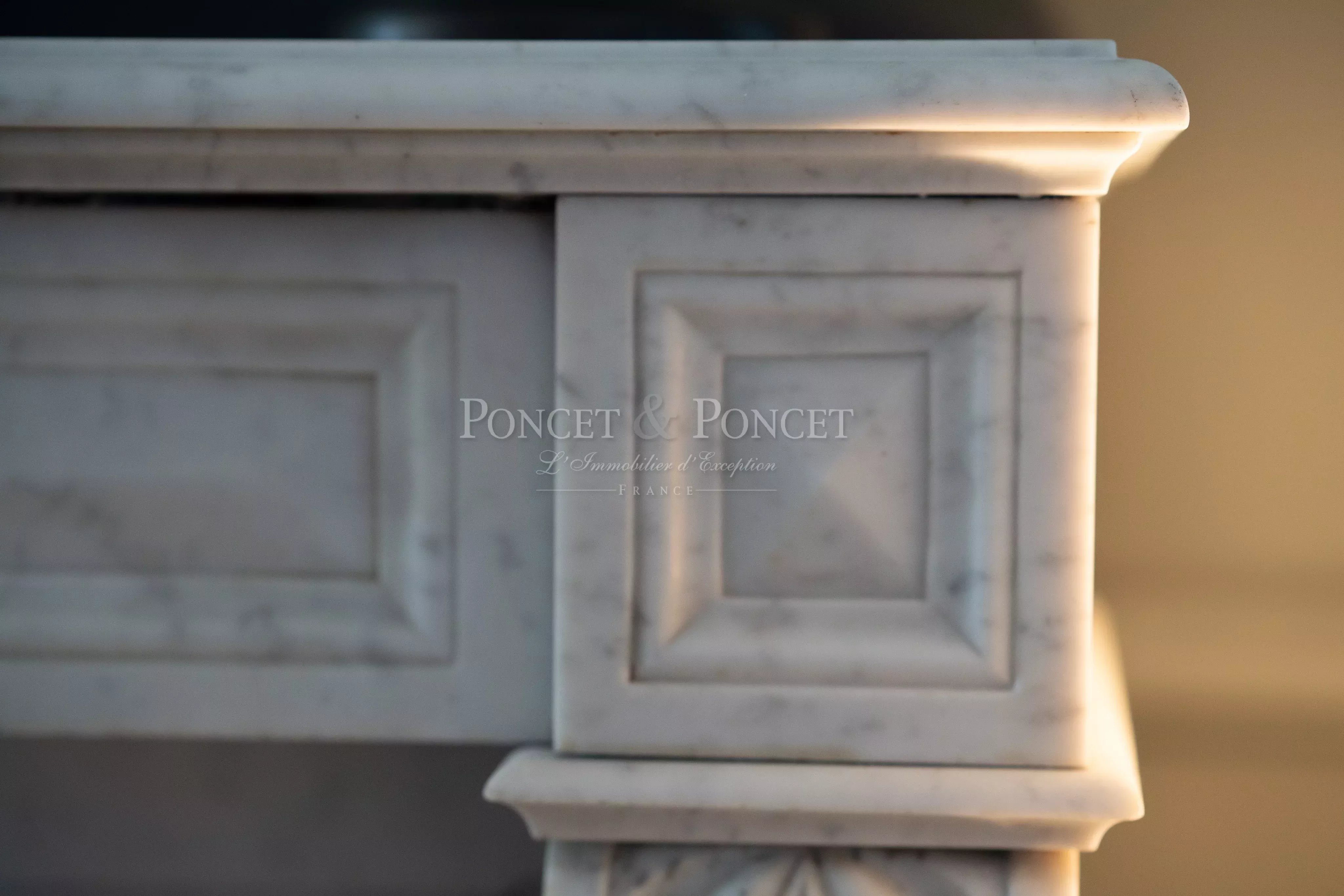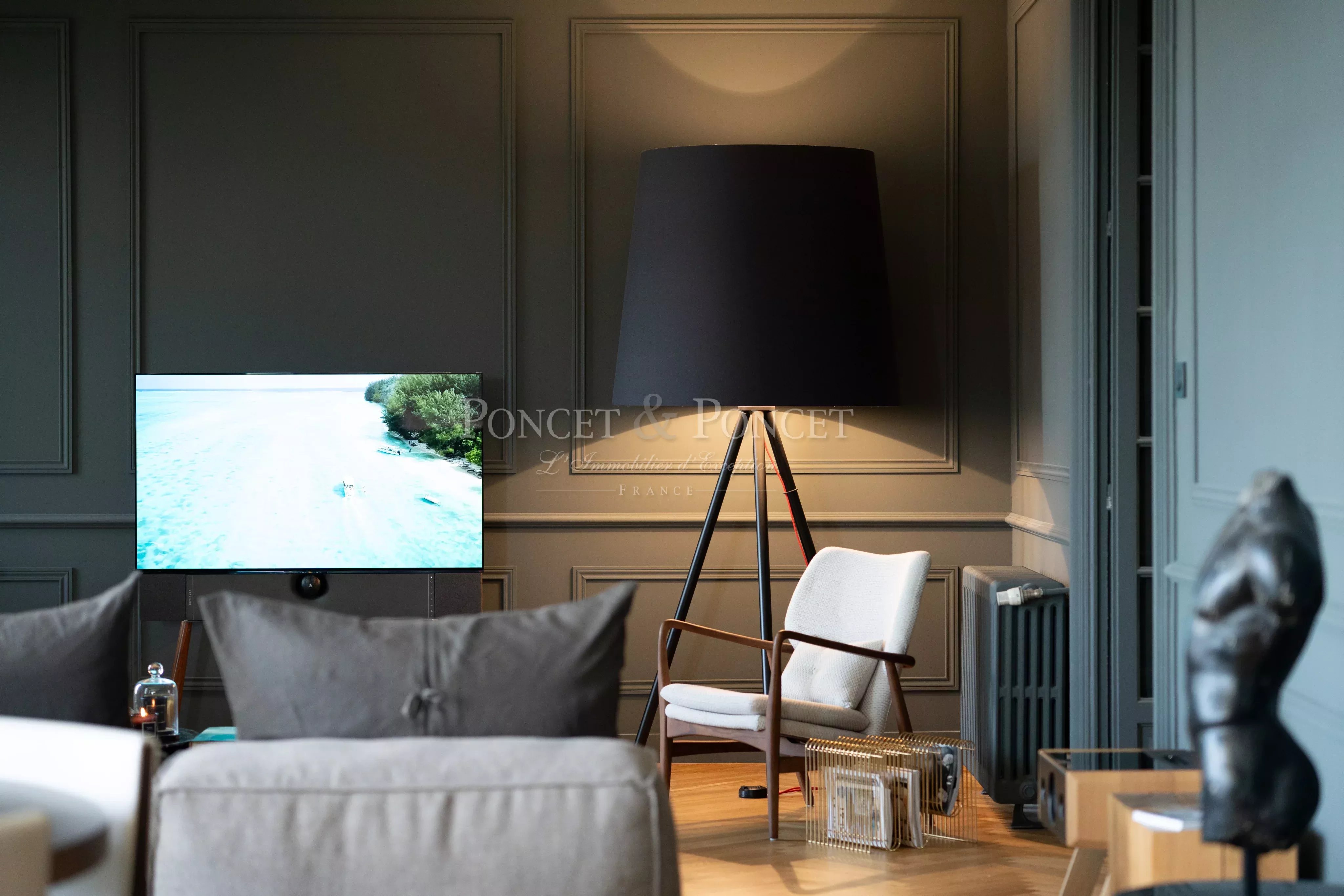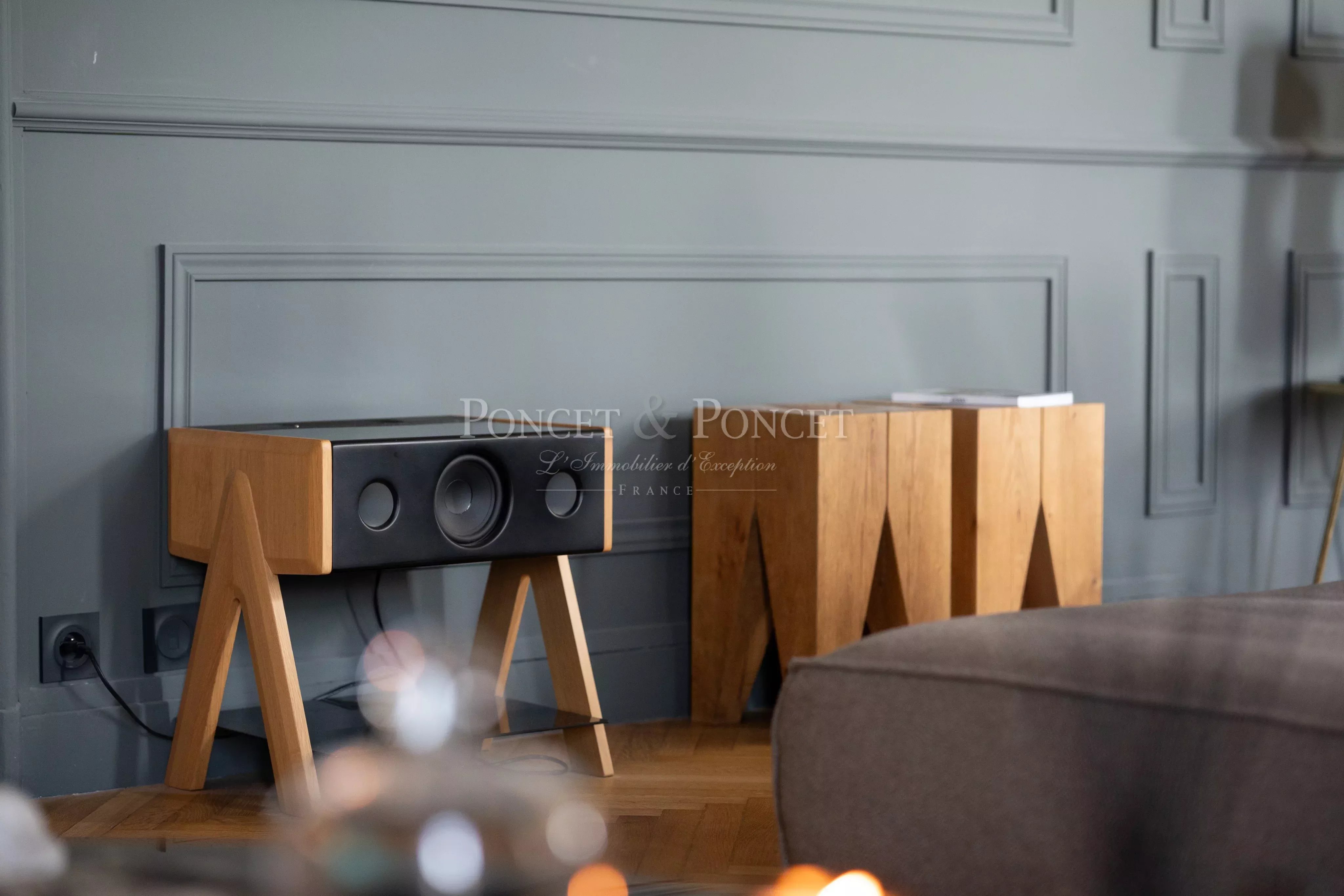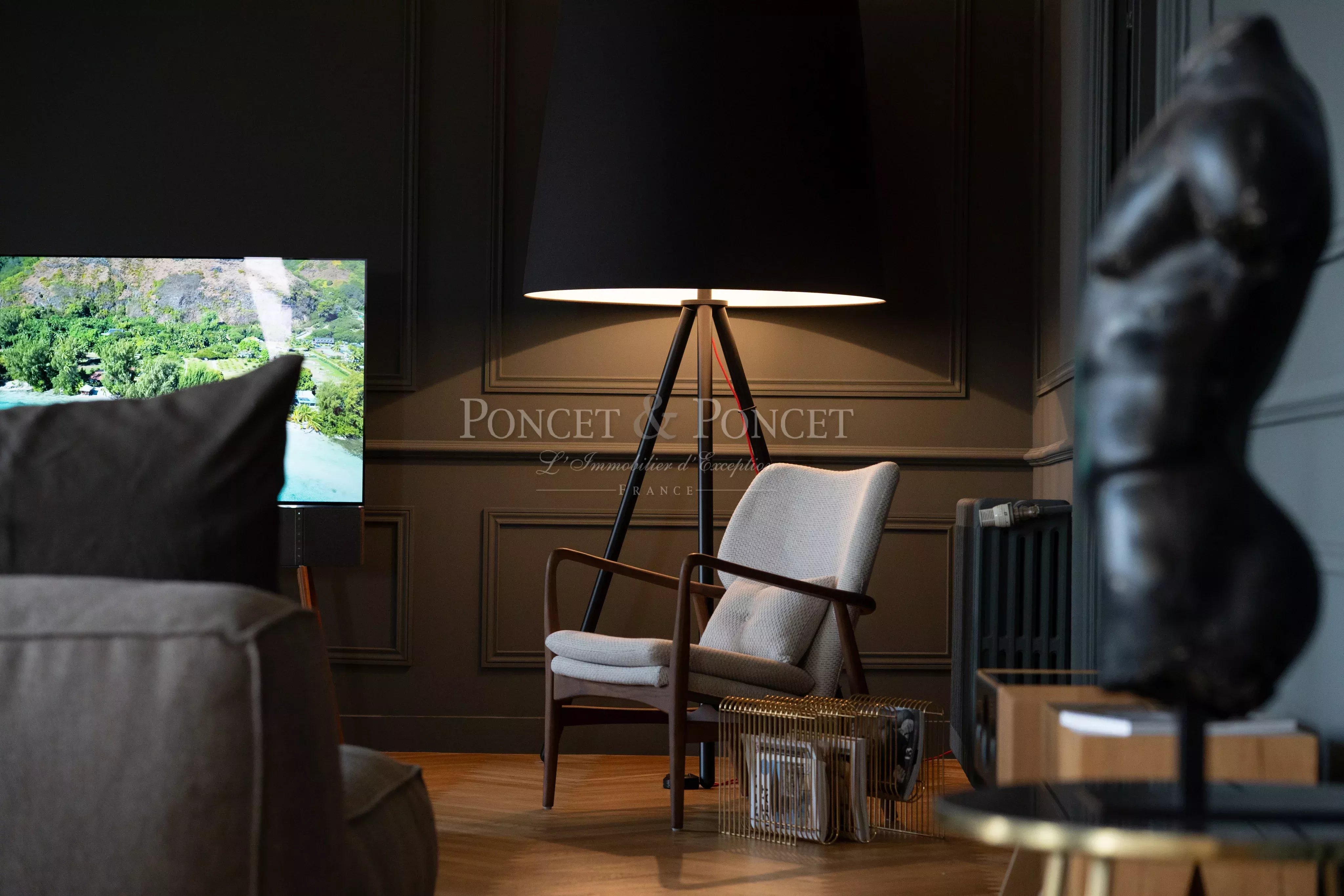 On the right, the heart of the living space opens onto a cosy lounge with a marble fireplace, and a modern kitchen with a convivial dining area. The spaciousness, light and noble materials - period parquet flooring, elegant wood panelling and contemporary finishes - create a cosy, timeless atmosphere.