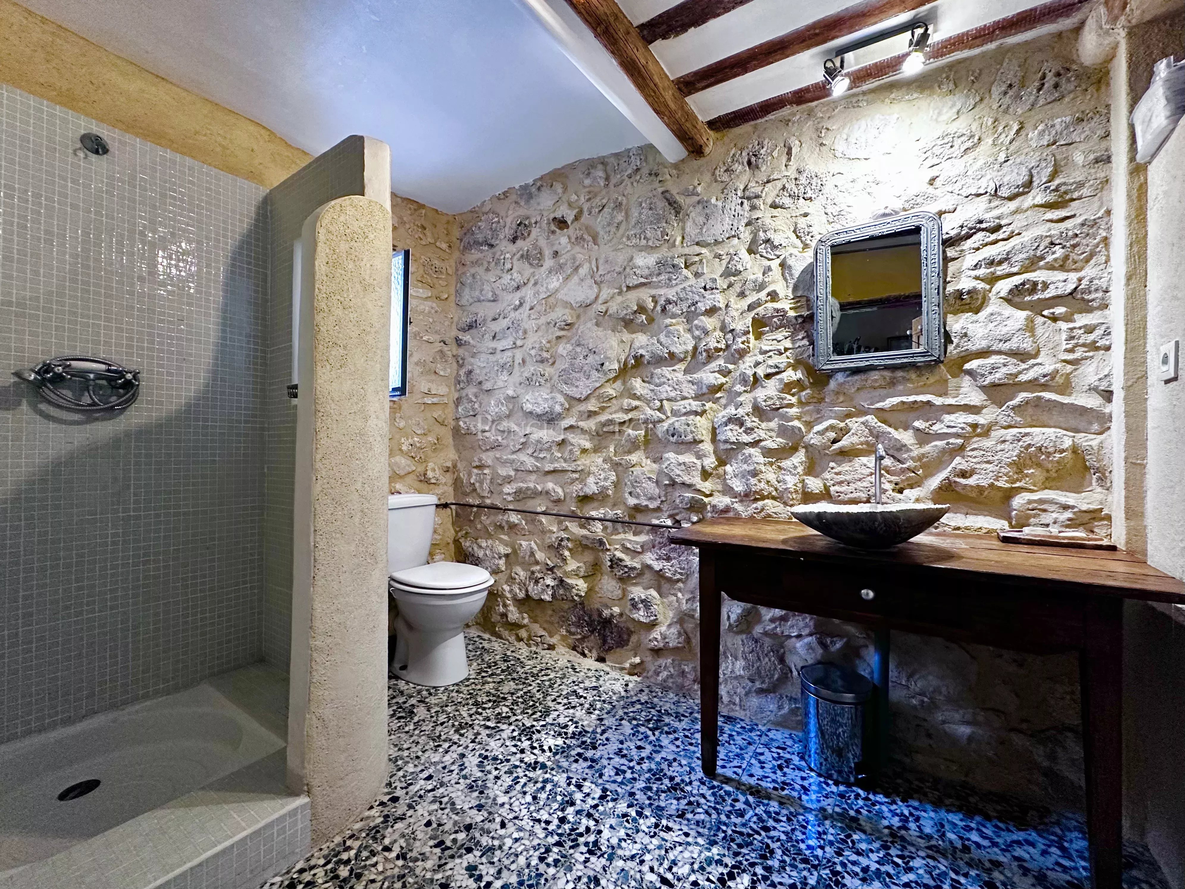 The first dwelling features a living room with a wood-burning stove and a mezzanine used as an office, an open-plan kitchen leading into the dining area, a workshop, a laundry room, and a bedroom with a shower room. A second bedroom with a shower room, now attached to the second dwelling, was originally accessible from the kitchen. Two south-facing terraces, one of which is covered, extend the living spaces. A 70 m² artist’s studio, widely open to the outdoors thanks to large bay windows and generous ceiling height, completes this first dwelling.