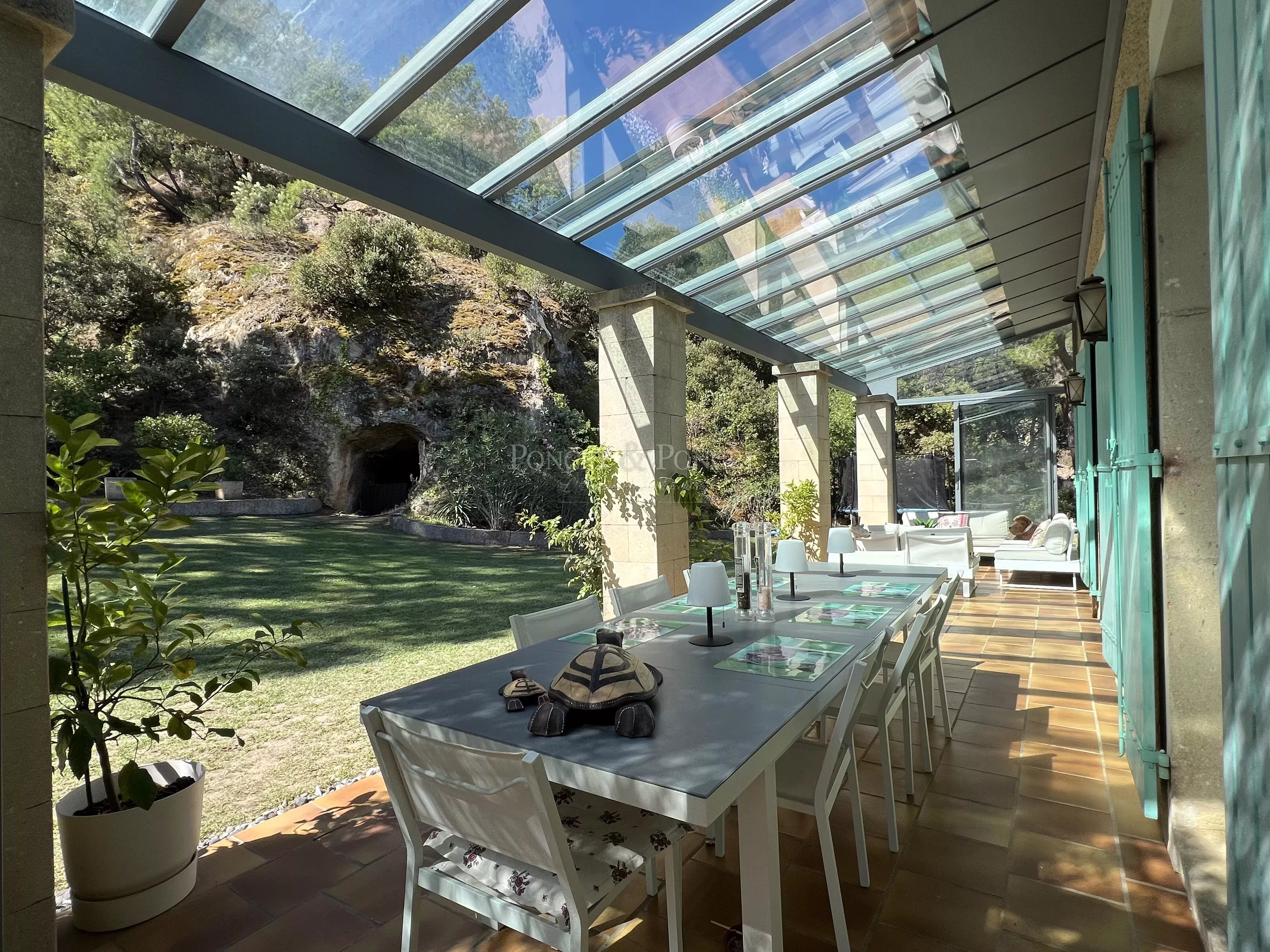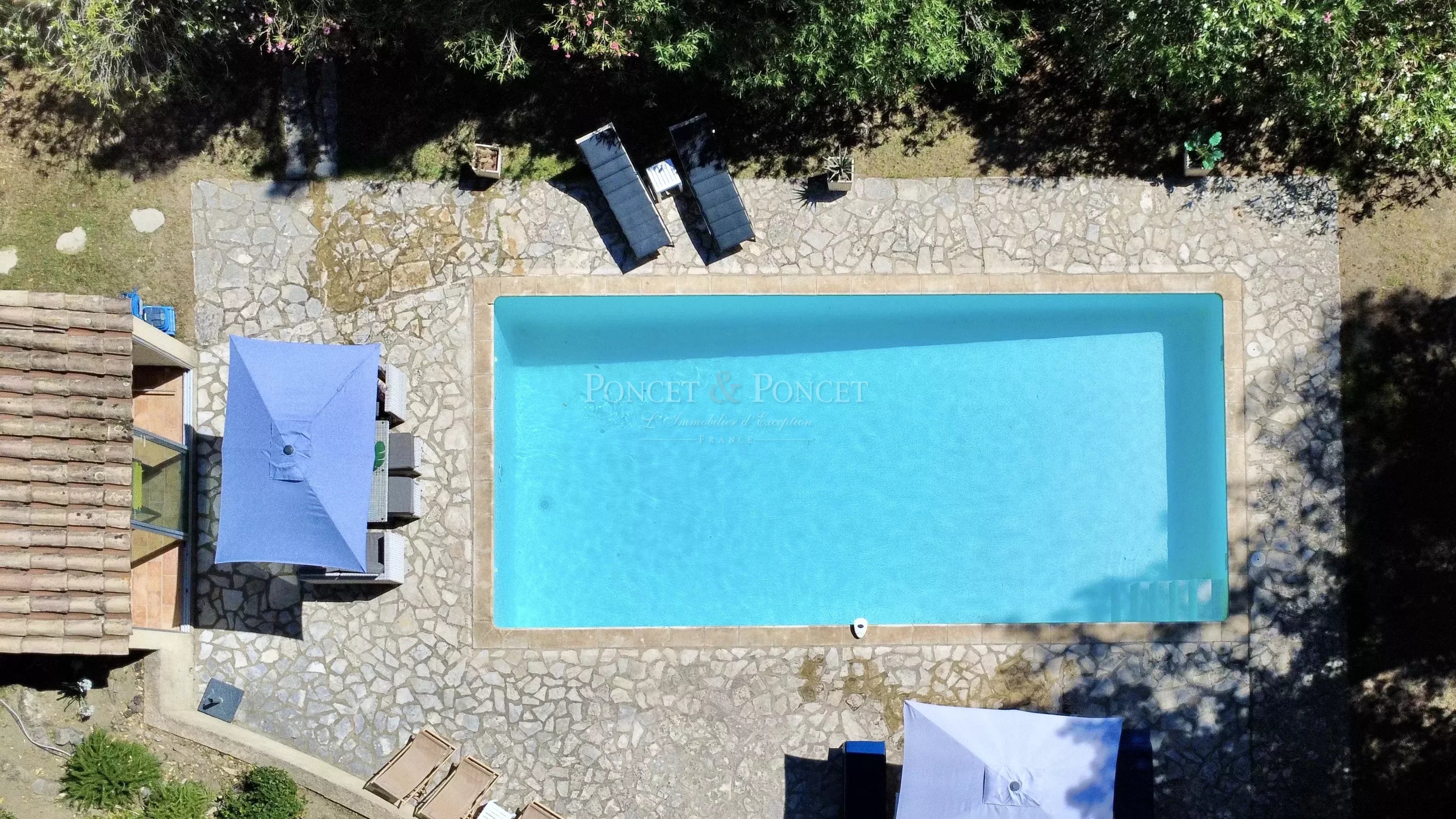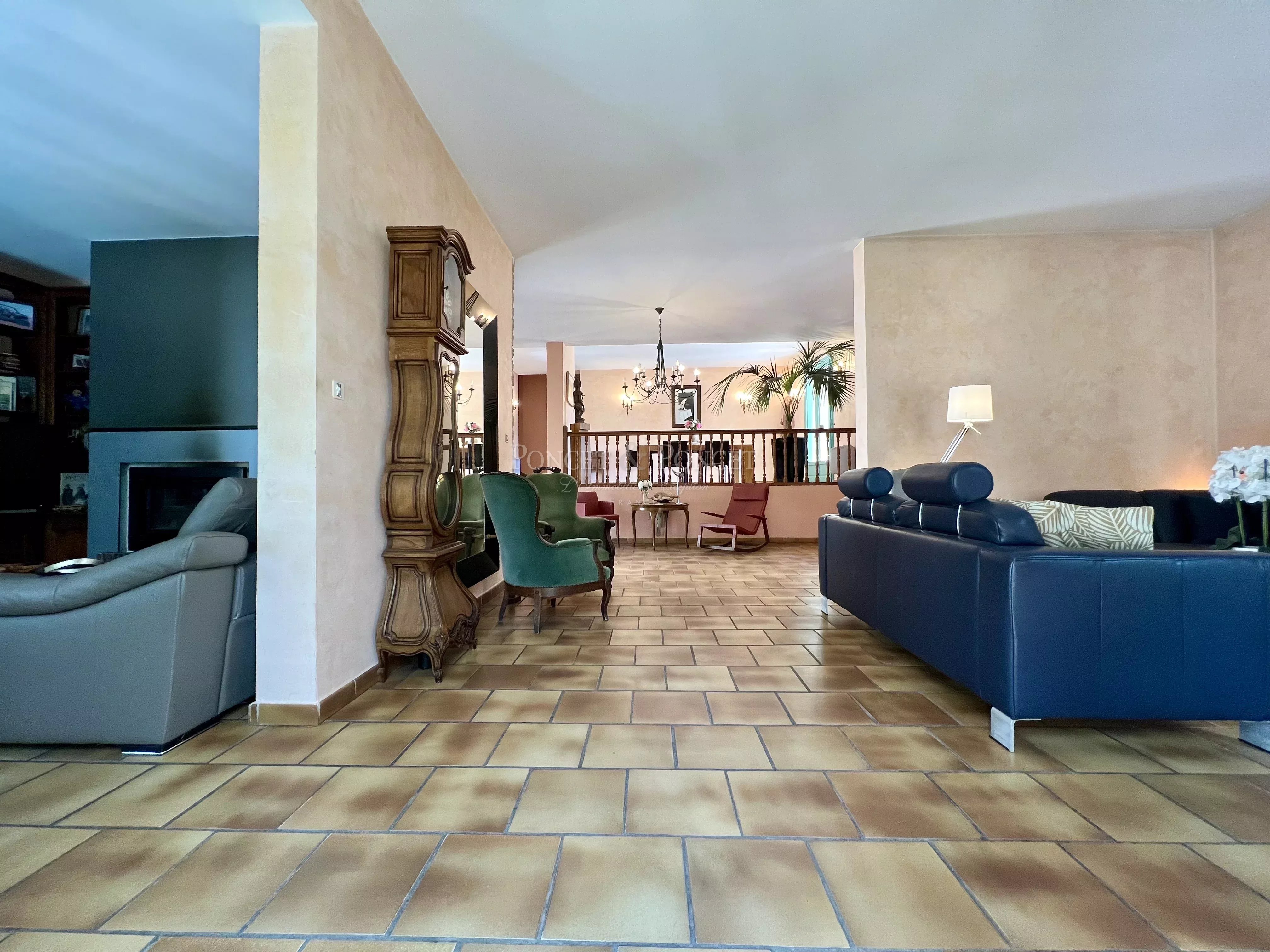 A laundry room, a garage with workshop, a carport for two cars, a wine cellar, as well as a cave carved into the rock complete the property. The fully enclosed grounds of approximately 9,000 m², enhanced by night lighting, feature a heated 11 x 5 m swimming pool surrounded by spacious terraces, a pool house with a summer kitchen, and a landscaped garden.
