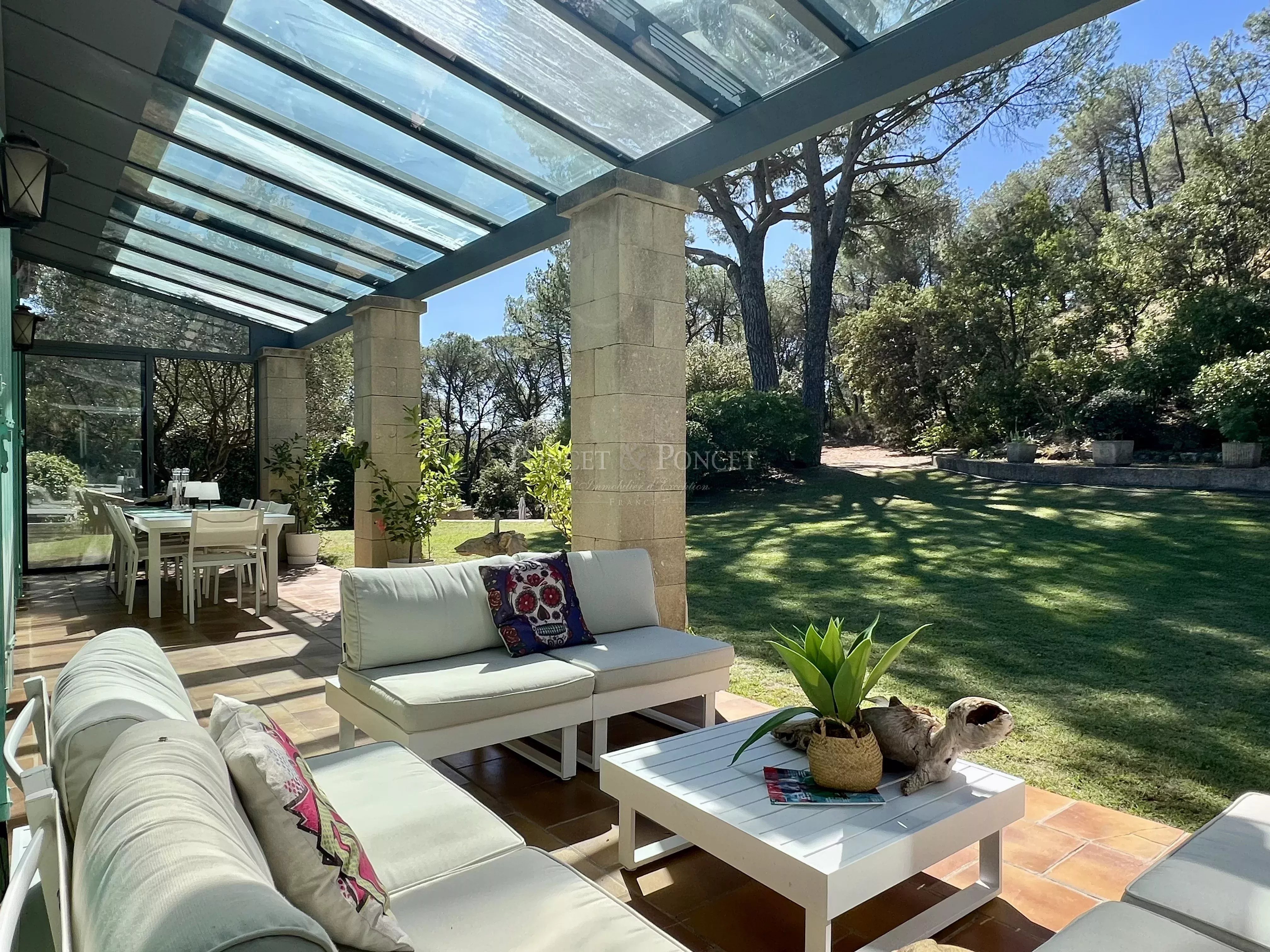 Designed by an architect and built around a central patio, this villa of approximately 350 m² (265 m² living space) offers generous volumes and smooth circulation, ideal for hosting families or groups with full privacy. The entrance, with cloakroom, leads to a reception area of over 60 m² featuring a fireplace with insert, a library corner, and large bay windows opening onto a covered terrace. The east-facing dining room and fully equipped kitchen open onto a shaded dining terrace.
