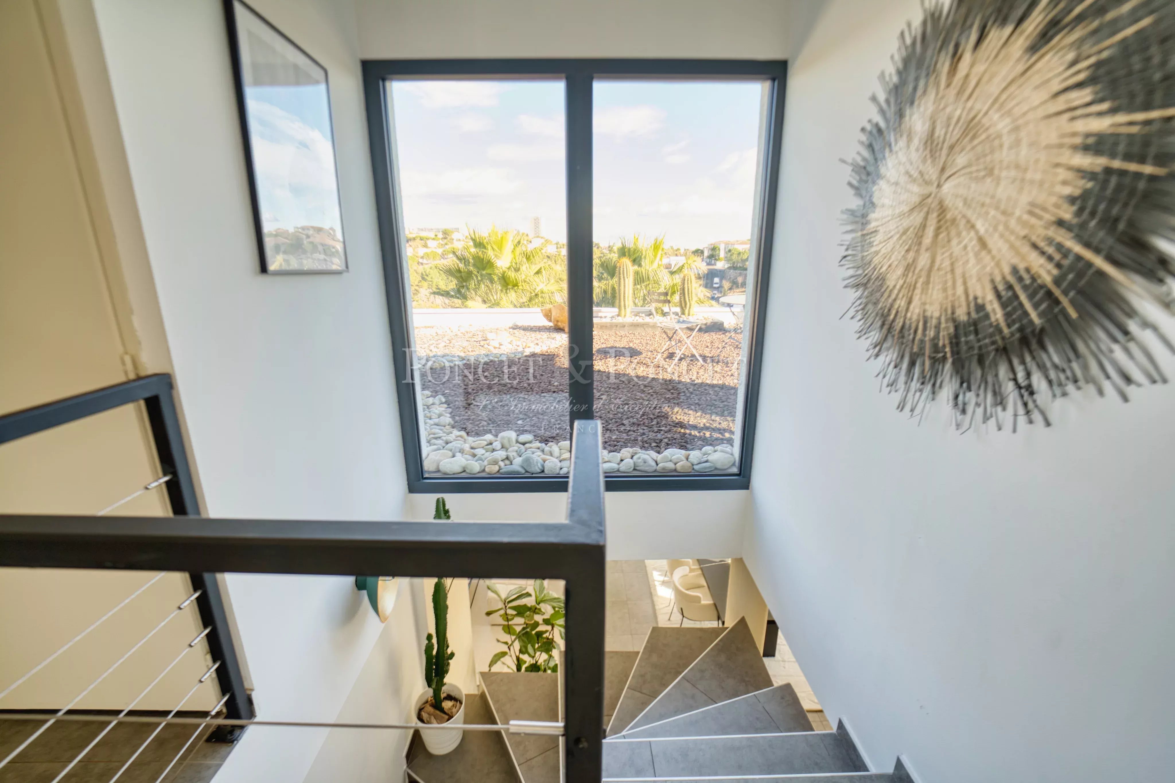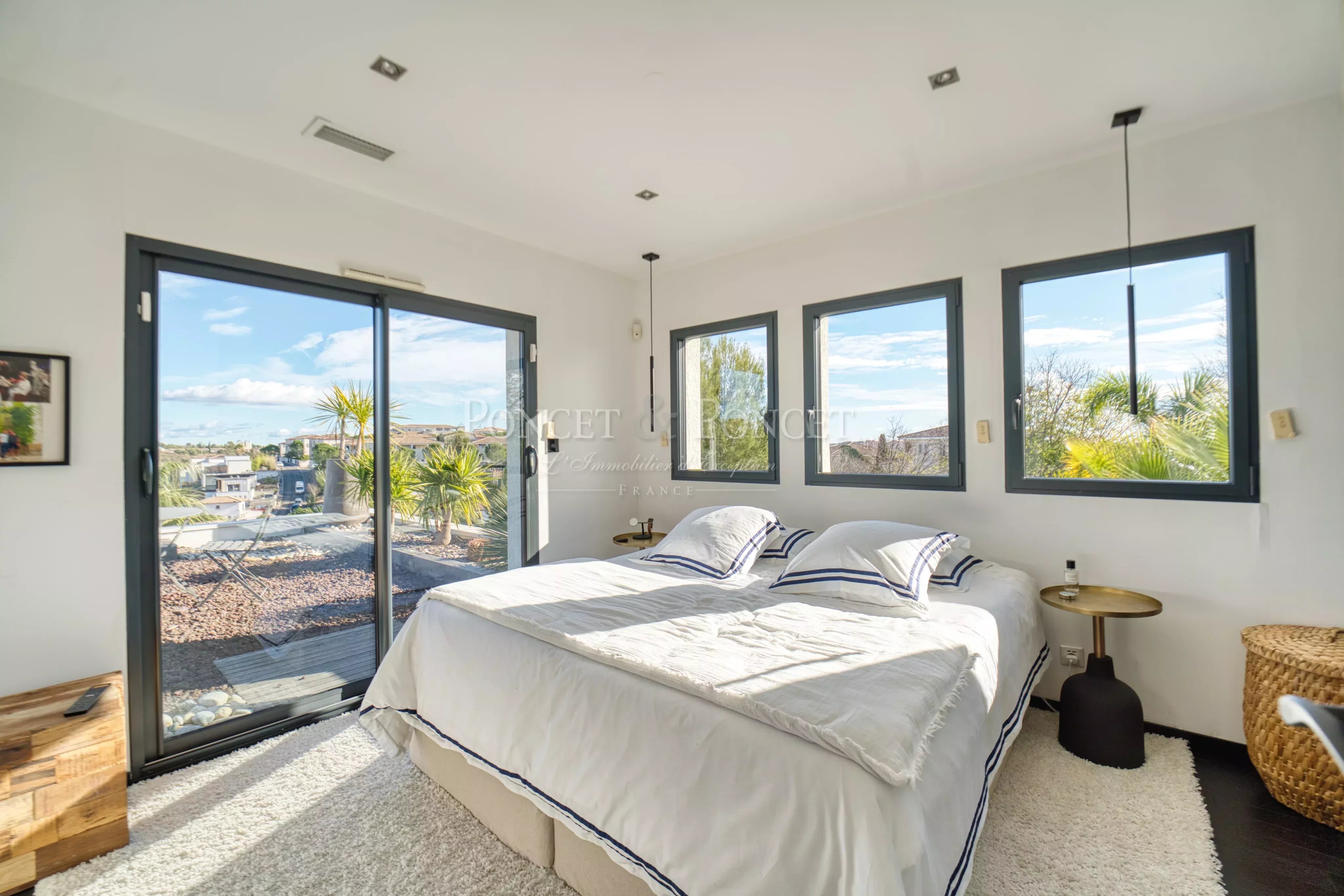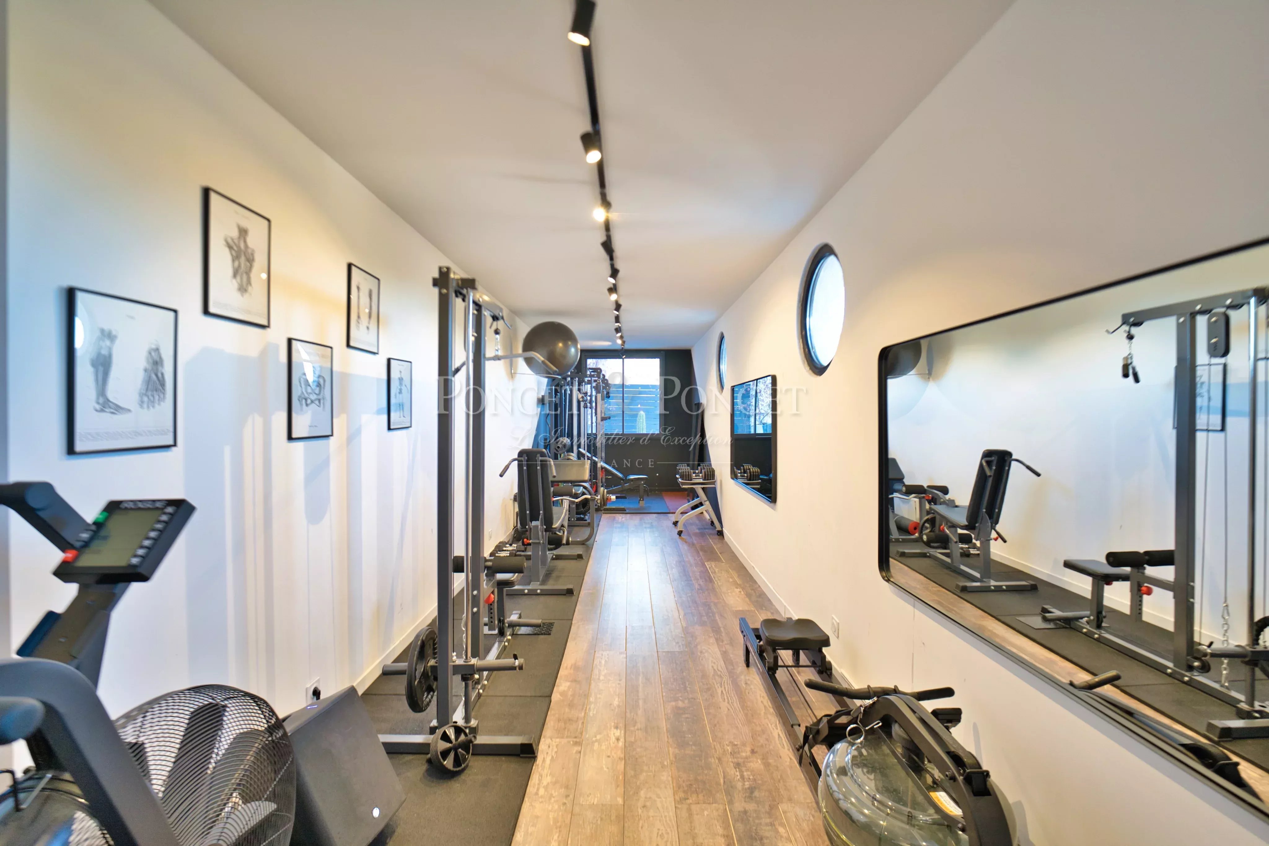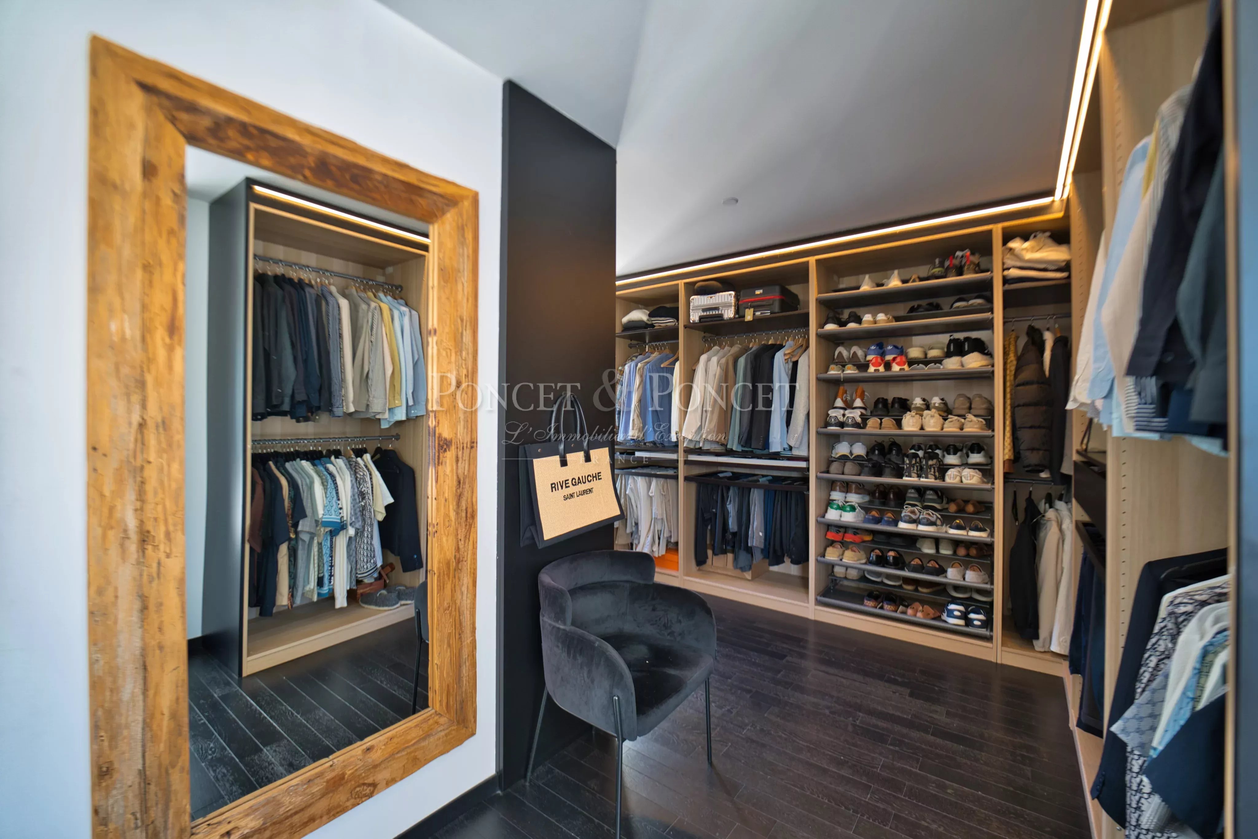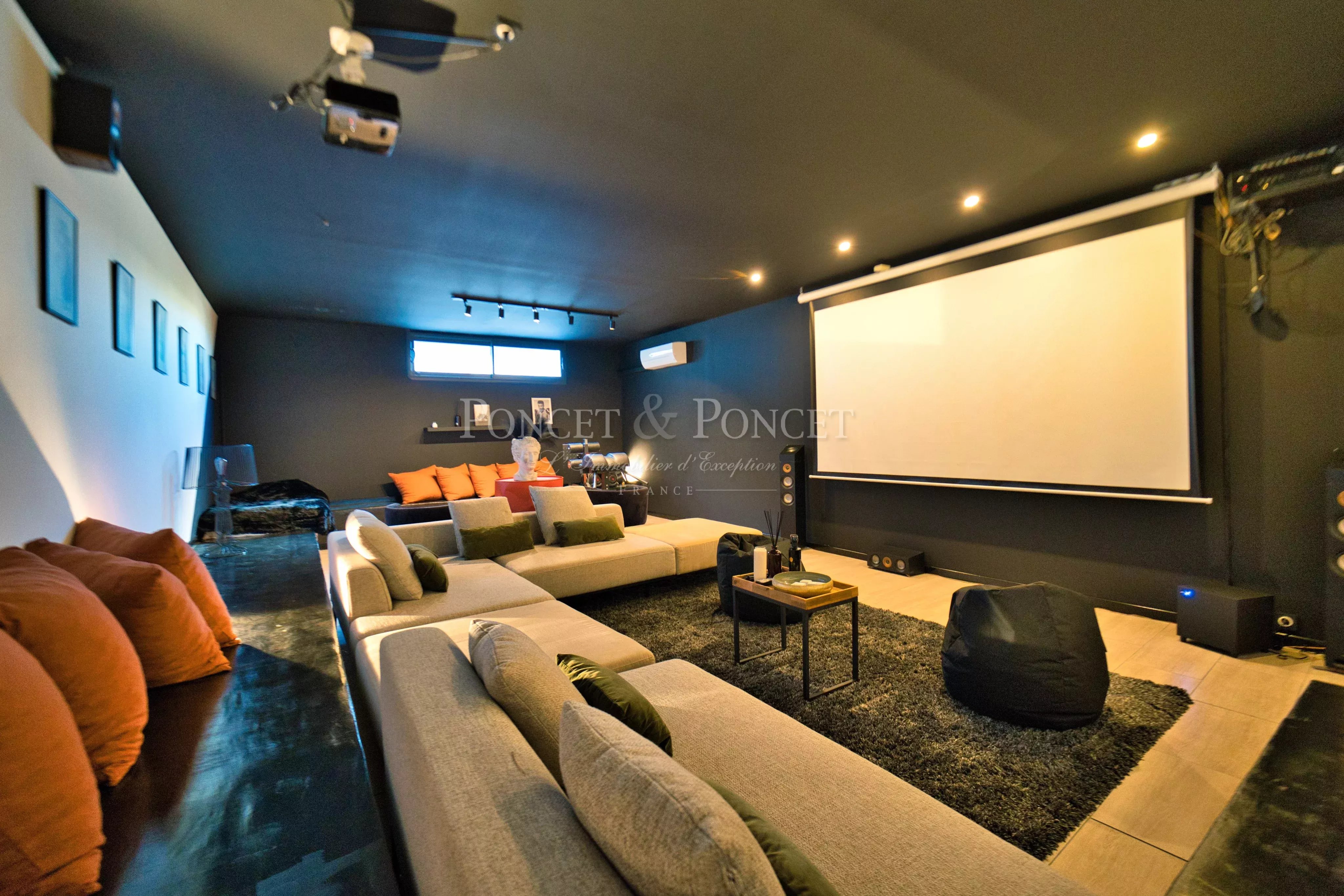 It is equipped with numerous modern features: reversible air conditioning, centralized electric shutters, fiber internet, exterior home automation, videophone, video surveillance, automatic irrigation, fast EV charger, water softener, thermodynamic water heater, wine cellar, and a private 55 m² enclosed parking area for two cars.
