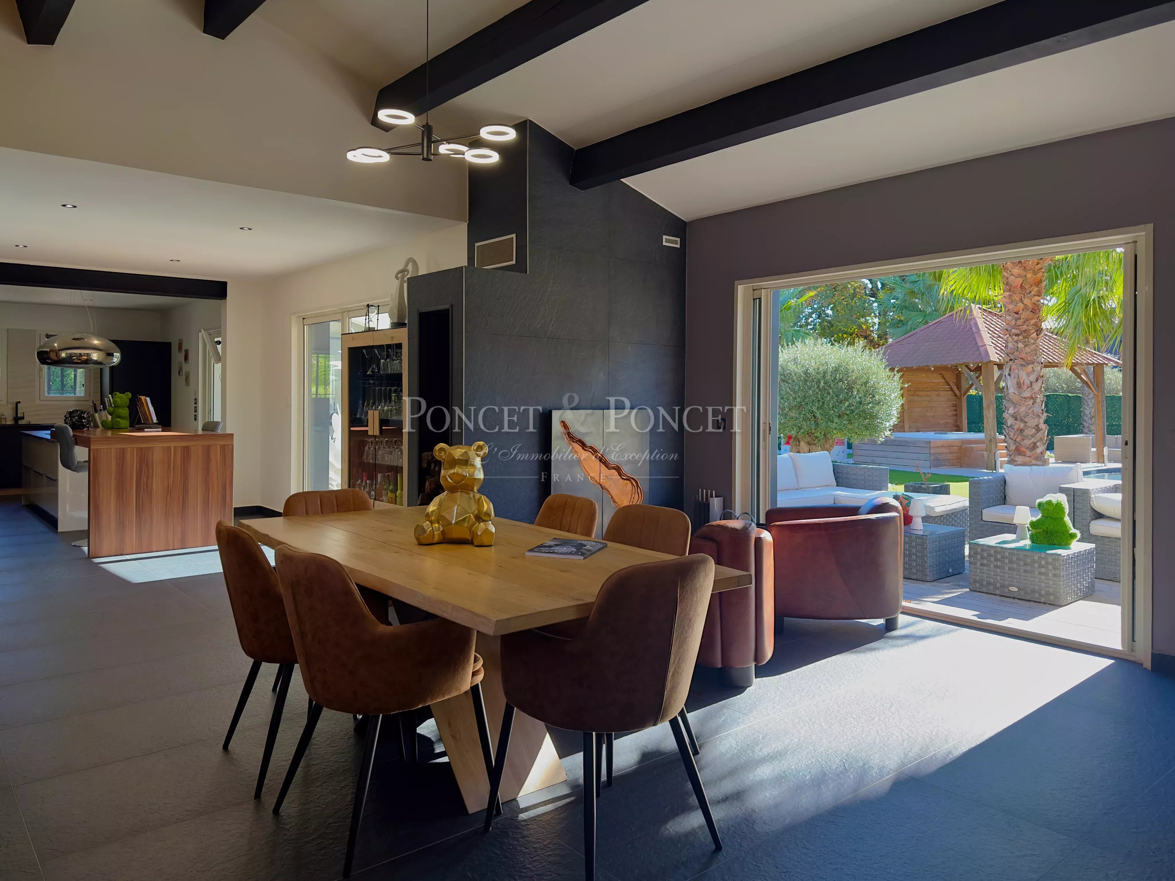 Le rez-de-chaussée accueille une vaste pièce à vivre articulée en quatre espaces : salon, salle à manger, cuisine principale et cuisine d’été, tous ouverts sur les terrasses et la piscine.