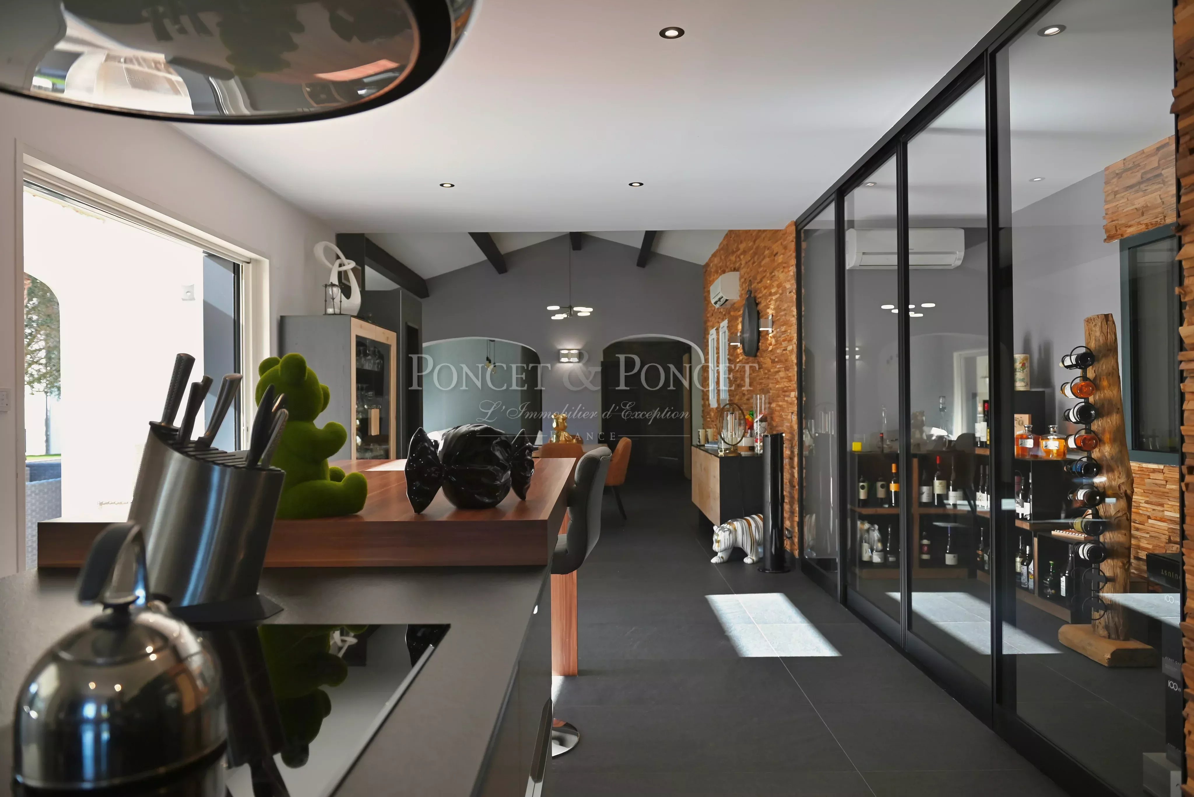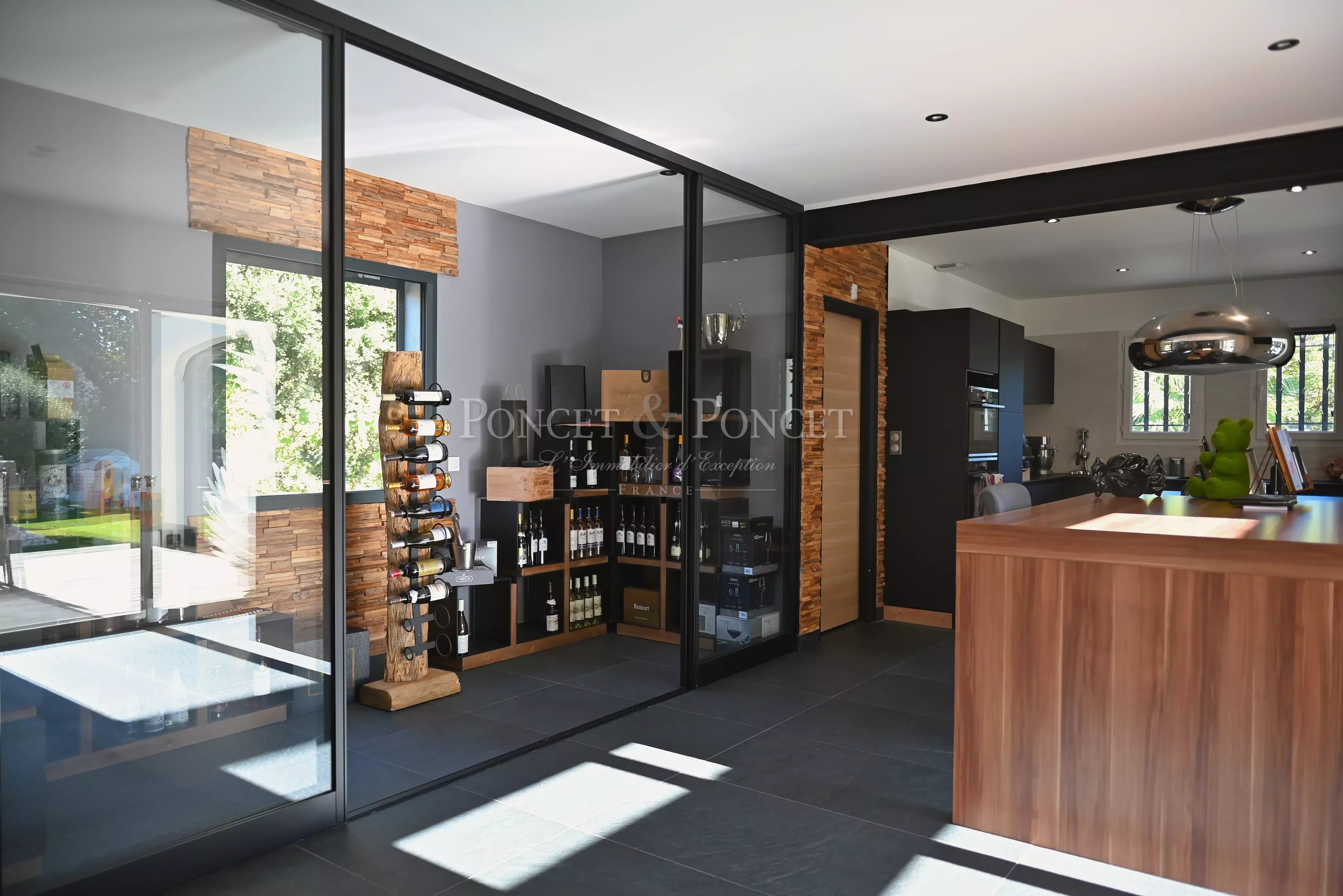 Une cave à vin vitrée, un cellier et une buanderie complètent cet ensemble fonctionnel.