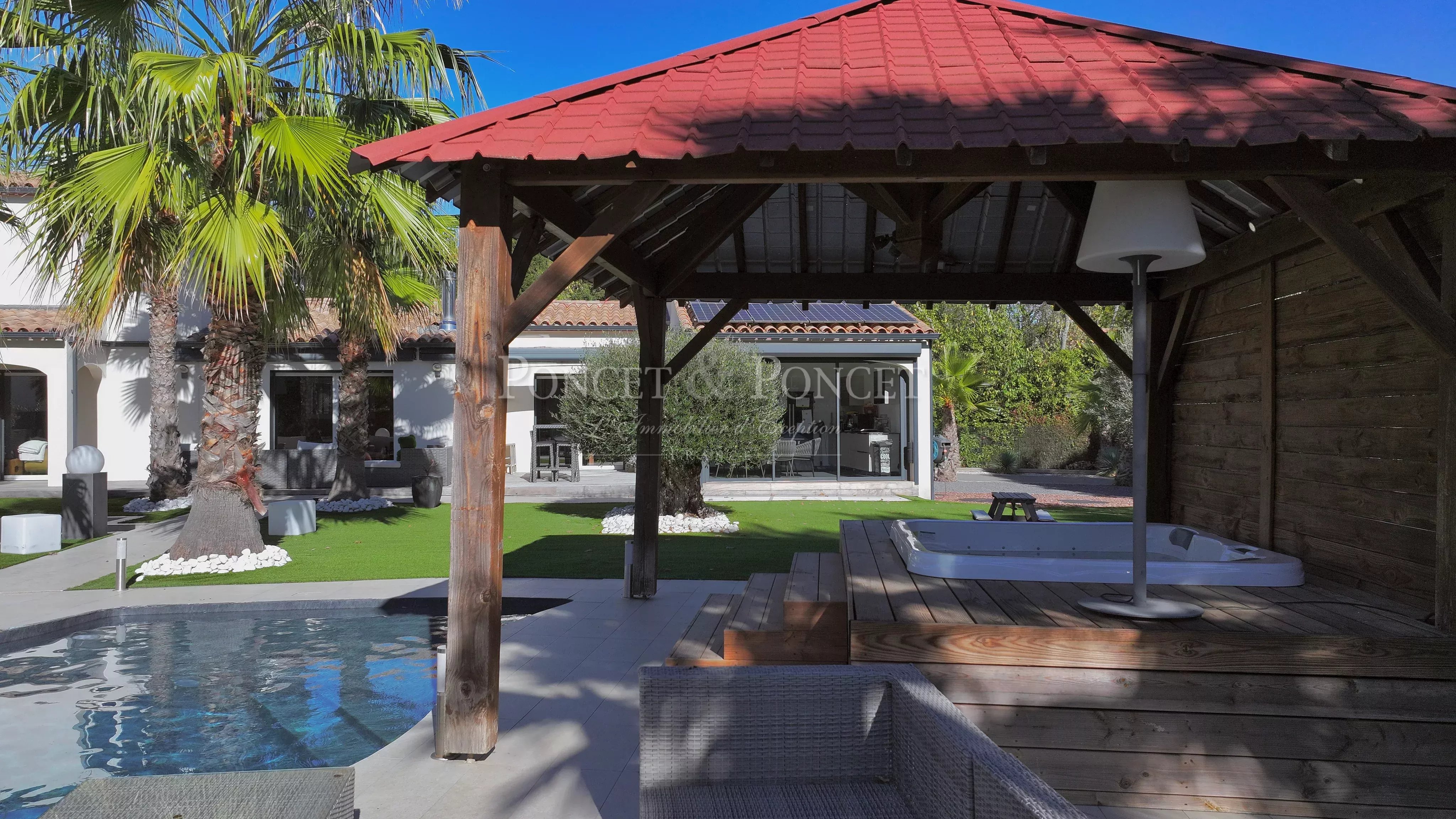 Le jardin paysager, a été conçu pour limiter l’entretien tout en valorisant les espaces de loisirs : piscine, jacuzzi, boulodrome, et larges terrasses ensoleillées invitent à la détente et à la convivialité.