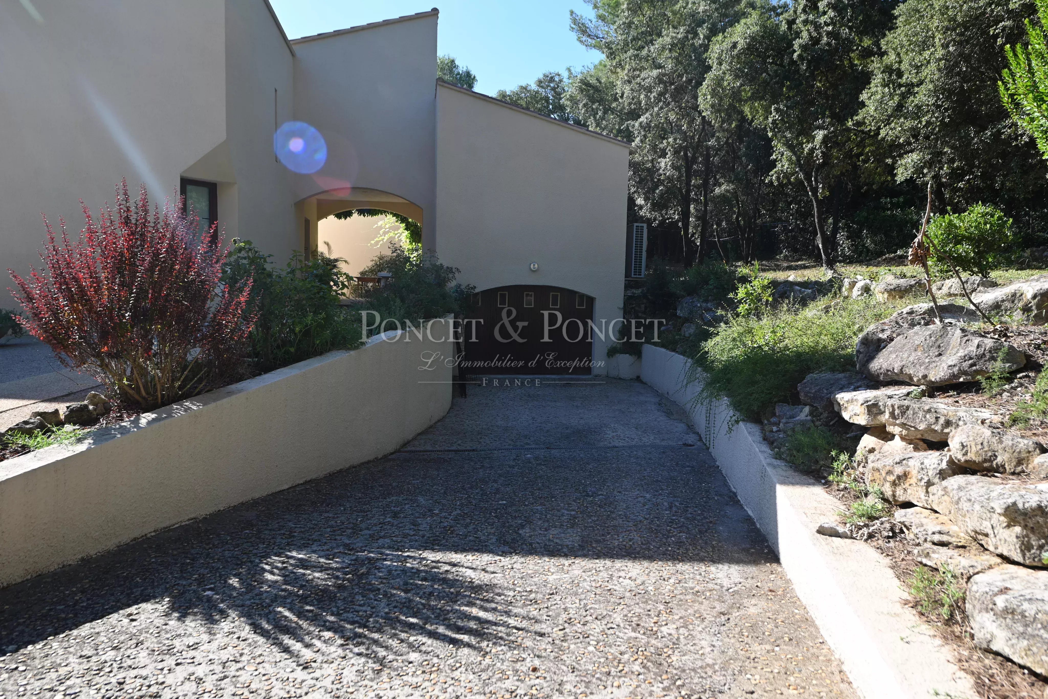 À 5 mn au nord de Montpellier dans un environnement verdoyant, villa d'architecte classique et contemporaine composée de 3 bâtiments sous toiture commune d'une surface habitable de 282m2 plus 106m2 d'annexes.