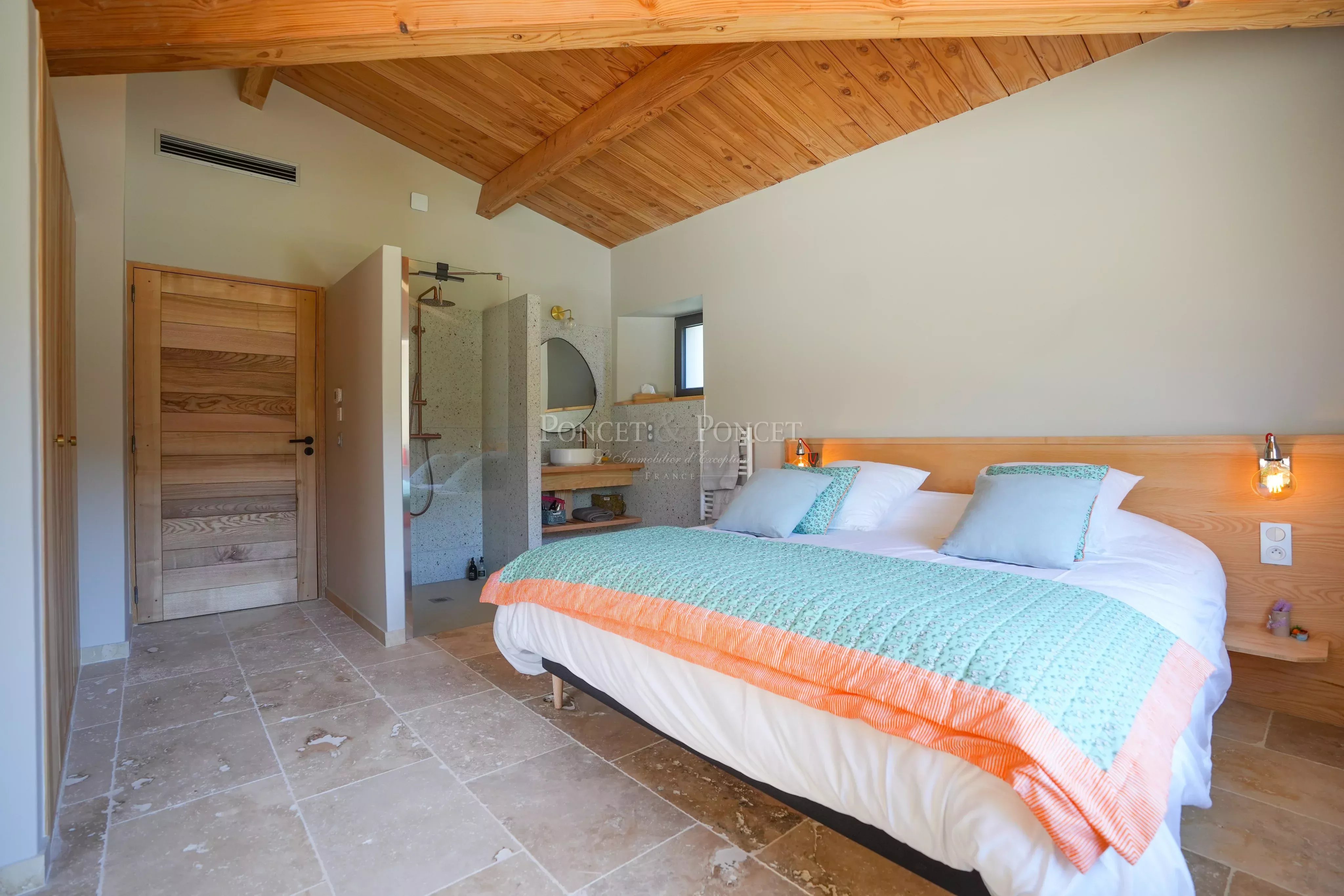 Le confort est au rendez-vous : garage, atelier, cave, alarme vidéo, fibre internet, forage, puits, plancher chauffant, climatisation par pompe à chaleur, ballon thermodynamique, jardin et piscine clos de murs, et deux suites de plain-pied.