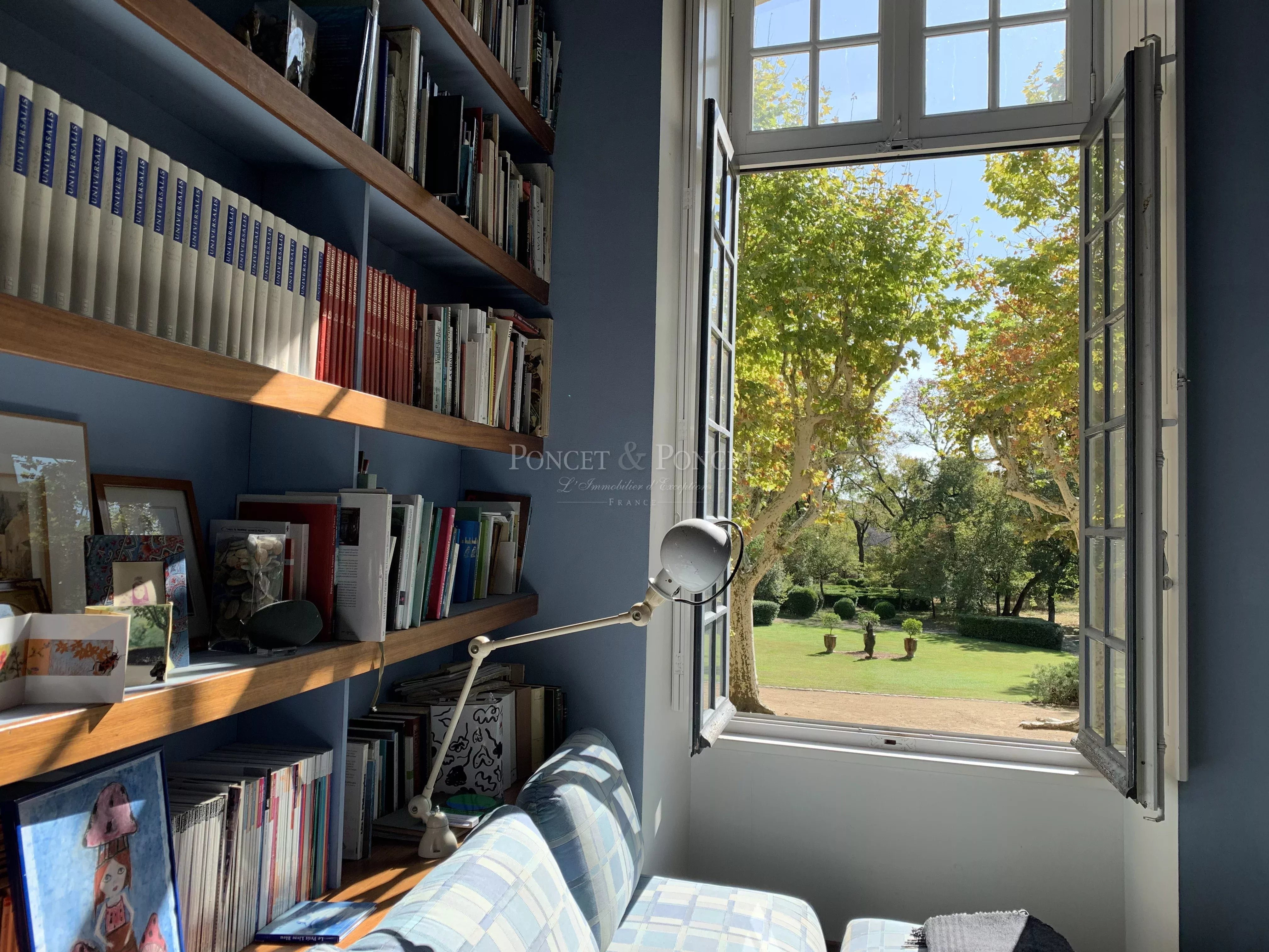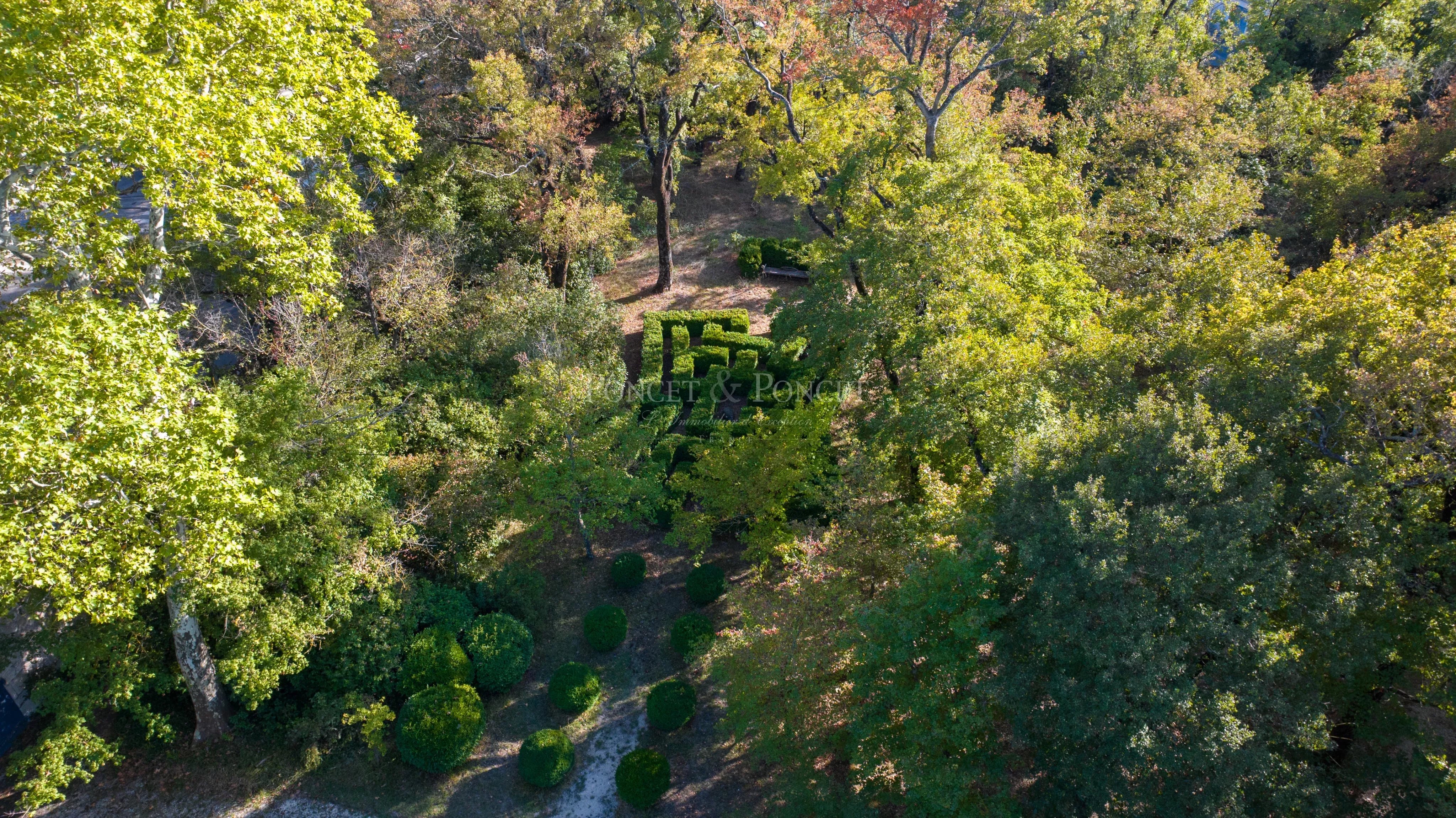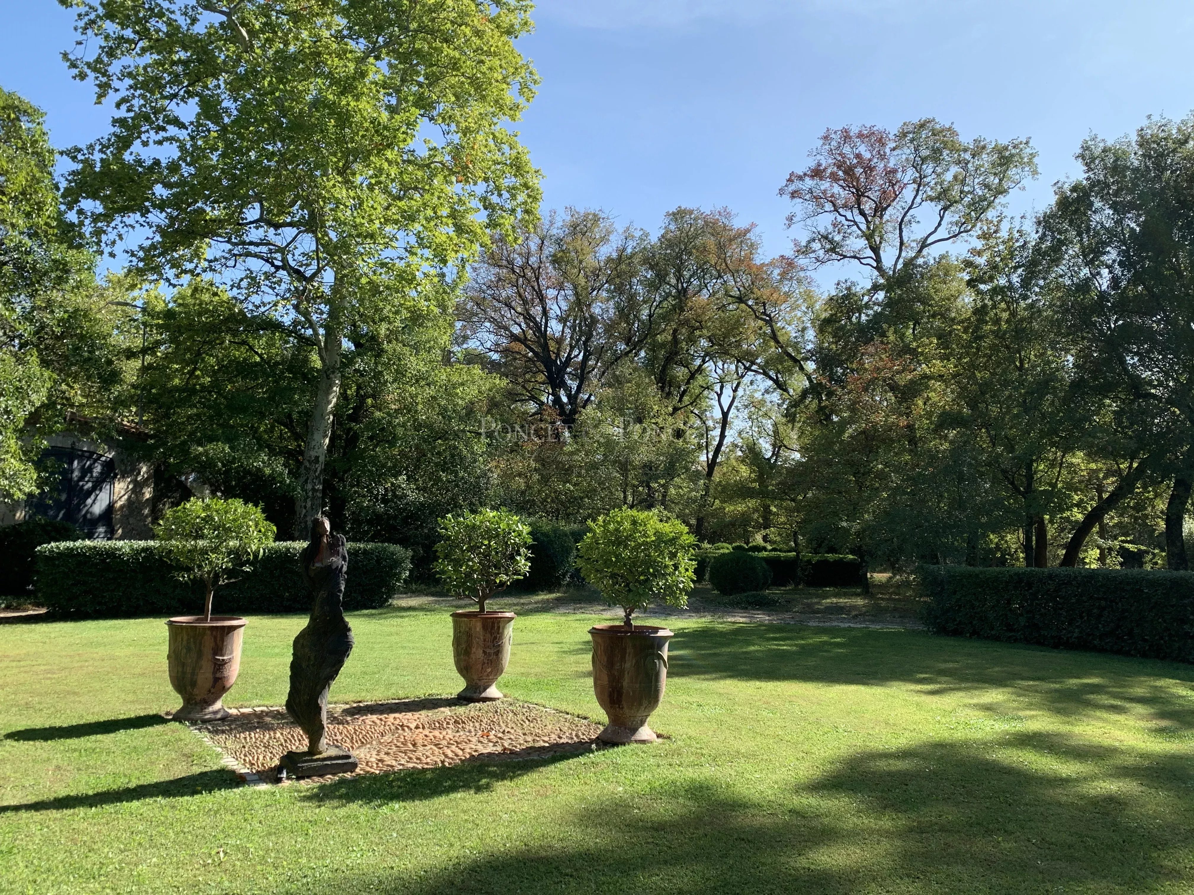 Le château, d'une superficie habitable d'environ 1000 m2, est orienté vers le sud et s'étend sur un parc de 7800 m2. Plusieurs espaces distincts se fondent harmonieusement : côté château, des allées bordées de platanes, de l'autre, une nature préservée de type garrigue, biologique, avec ses chênes verts, séparée par un jardin impeccablement entretenu agrémenté d'une piscine et d'un labyrinthe.