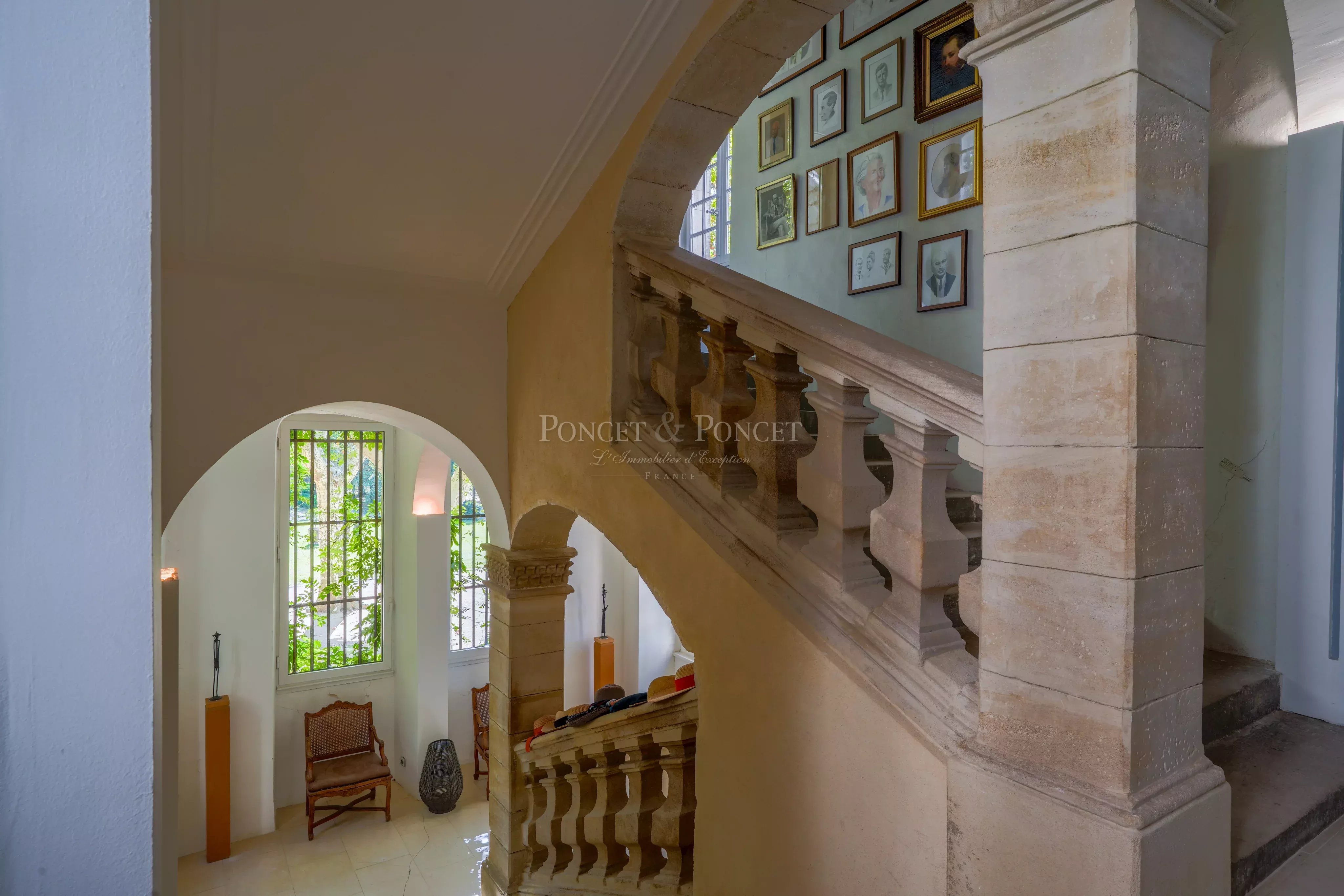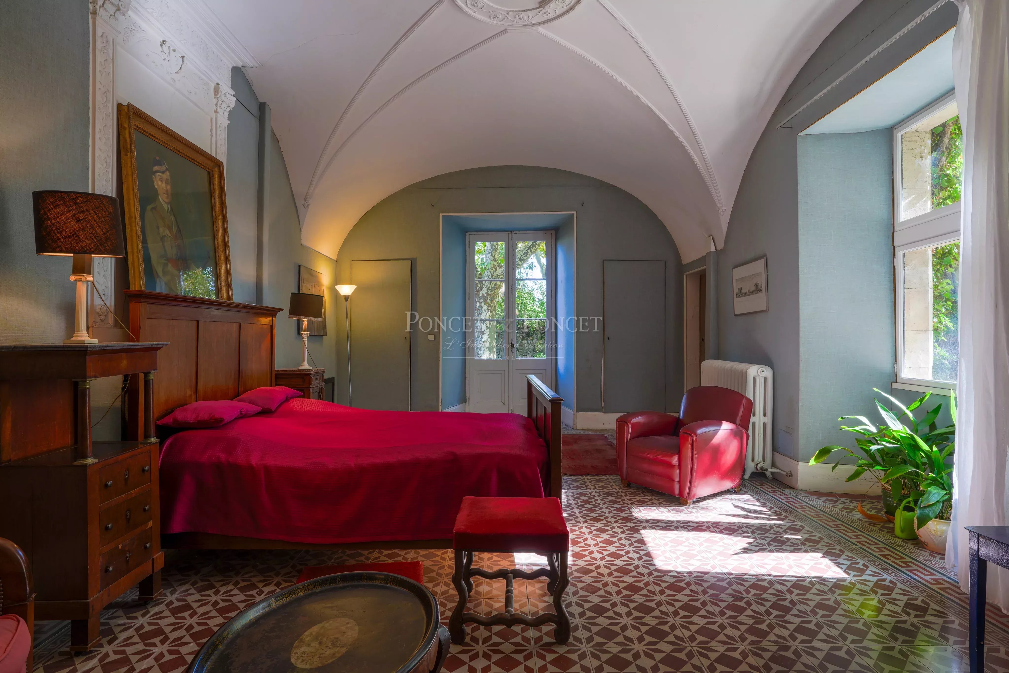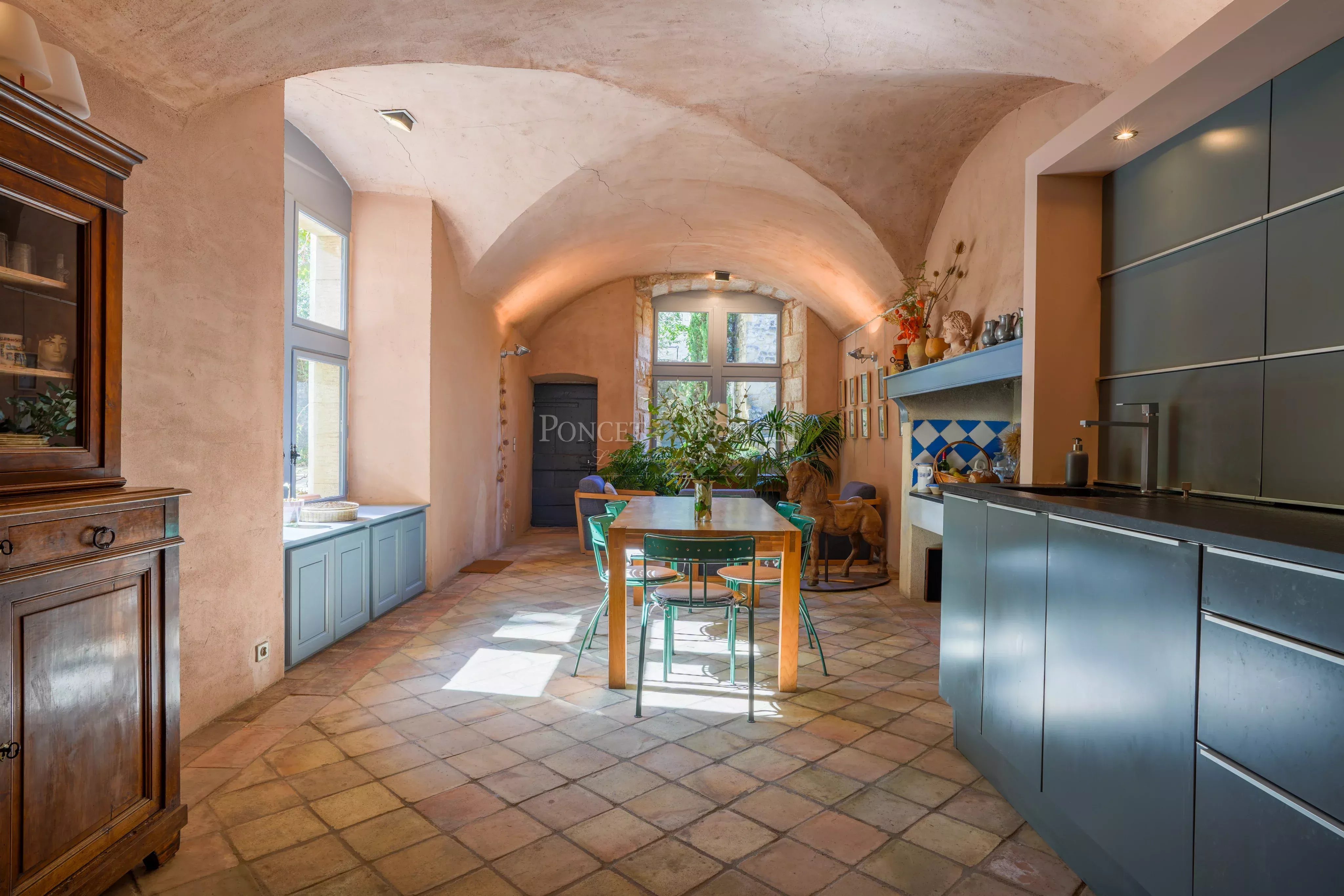 Au rez-de-chaussée, le hall d'entrée donne un aperçu de l'escalier central majestueux. Chaque pièce de ce niveau dispose d'un accès au jardin, offrant de nombreuses possibilités. Une première cuisine voûtée s'ouvre sur un espace extérieur idéal pour les repas en plein air. Une grande chambre ornée de voûtes, de moulures et de carreaux de ciment séduit par son charme. En enfilade, une deuxième chambre est nichée dans la tour. Une pièce actuellement utilisée comme studio d'artiste pourrait être réaménagée en chambre. Une dernière chambre, avec sa salle de bains, peut servir d'appartement indépendant. La cave à vin se trouve également à ce niveau.