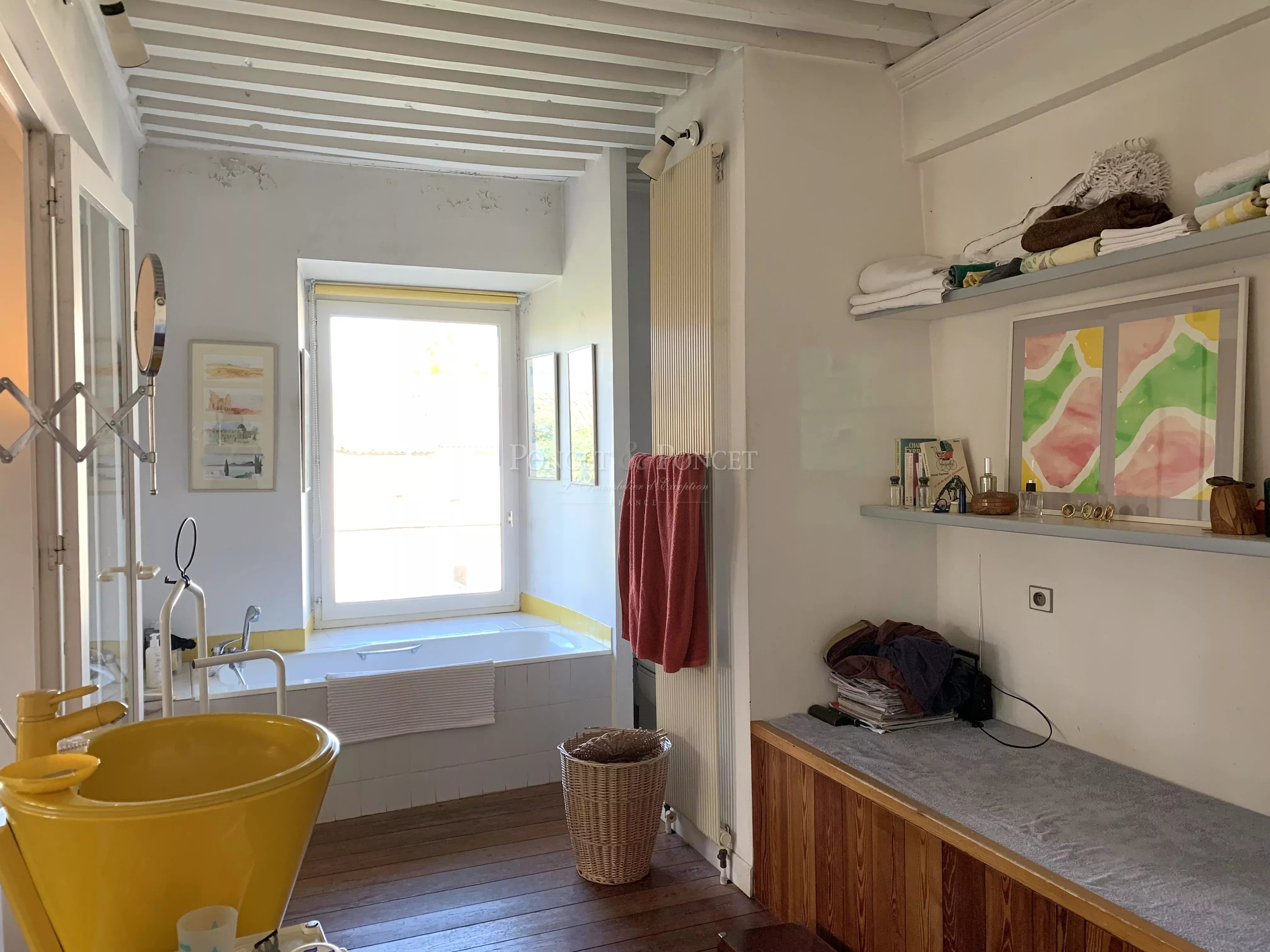 L'ascension jusqu'au premier étage incite à la contemplation, avec ses fenêtres baignées de lumière offrant une vue imprenable sur le parc. Une galerie se prêtant parfaitement à l'exposition d'oeuvres d'art, dessert l'une des pièces maîtresses de la demeure : la salle à manger, toute en voûtes culminant à 3m30 de hauteur, dans un souci de soutenir le grain qui, à l'ancien temps, était stocké à l'étage supérieur. Une grande cuisine lumineuse jouxte cette salle. Quatre chambres se trouvent également à ce niveau, ainsi qu'une salle de jeux/salle de cinéma. En face de la salle à manger, un salon de plus de 50 m2 offre de beaux volumes, avec son haut plafond en bois caissonné et sa cheminée ornée d'un trumeau en bois sculpté. Une bibliothèque, dotée d'une cheminée en marbre, d'un parquet et d'un plafond en bois, invite à des moments de détente. La chambre principale se distingue par son mélange harmonieux d'éléments anciens et modernes, avec une salle de bains vitrée surplombant la pièce.