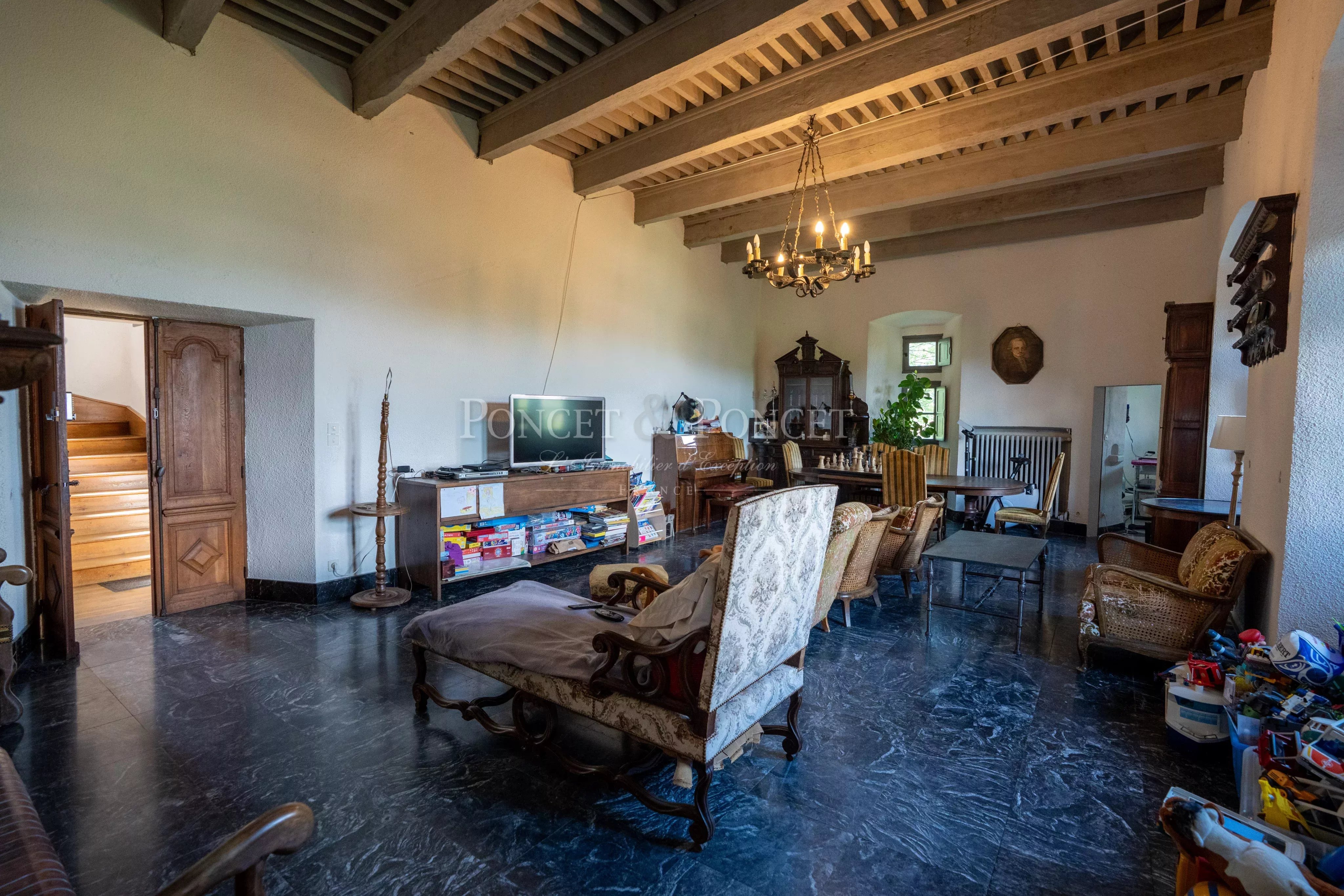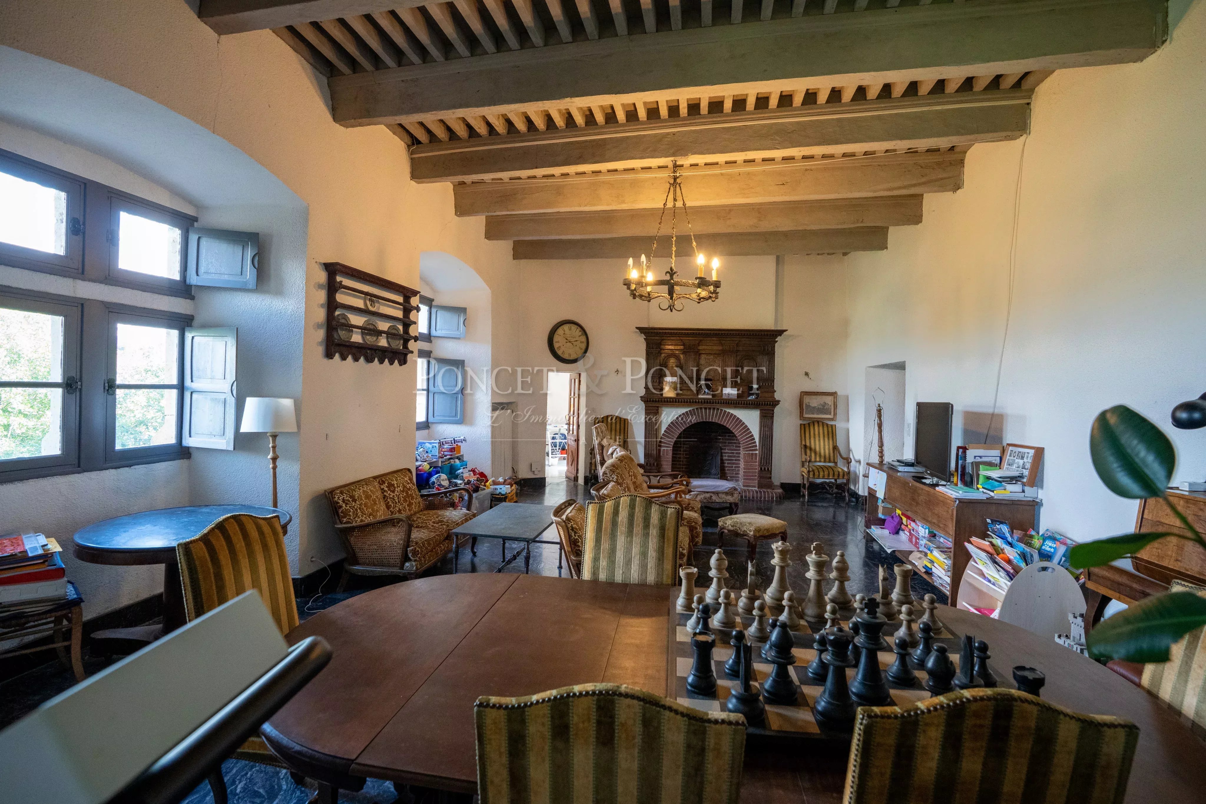- Un grand salon, une salle a manger avec cheminée, une bibliothèque et deux bureaux.
