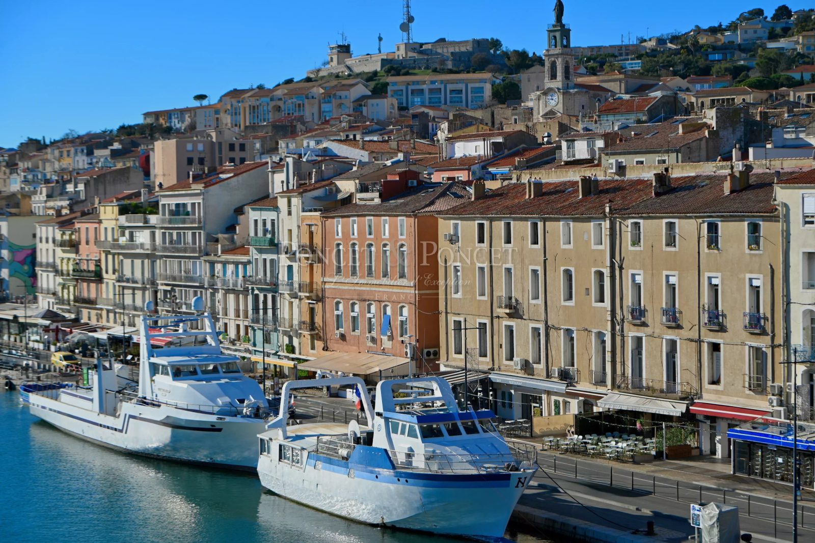 Appartement bourgeois d’exception avec terrasses et garage, situé en première ligne sur les quais ensoleillés de Sète, au dernier étage d’un immeuble de caractère, construction 1974.