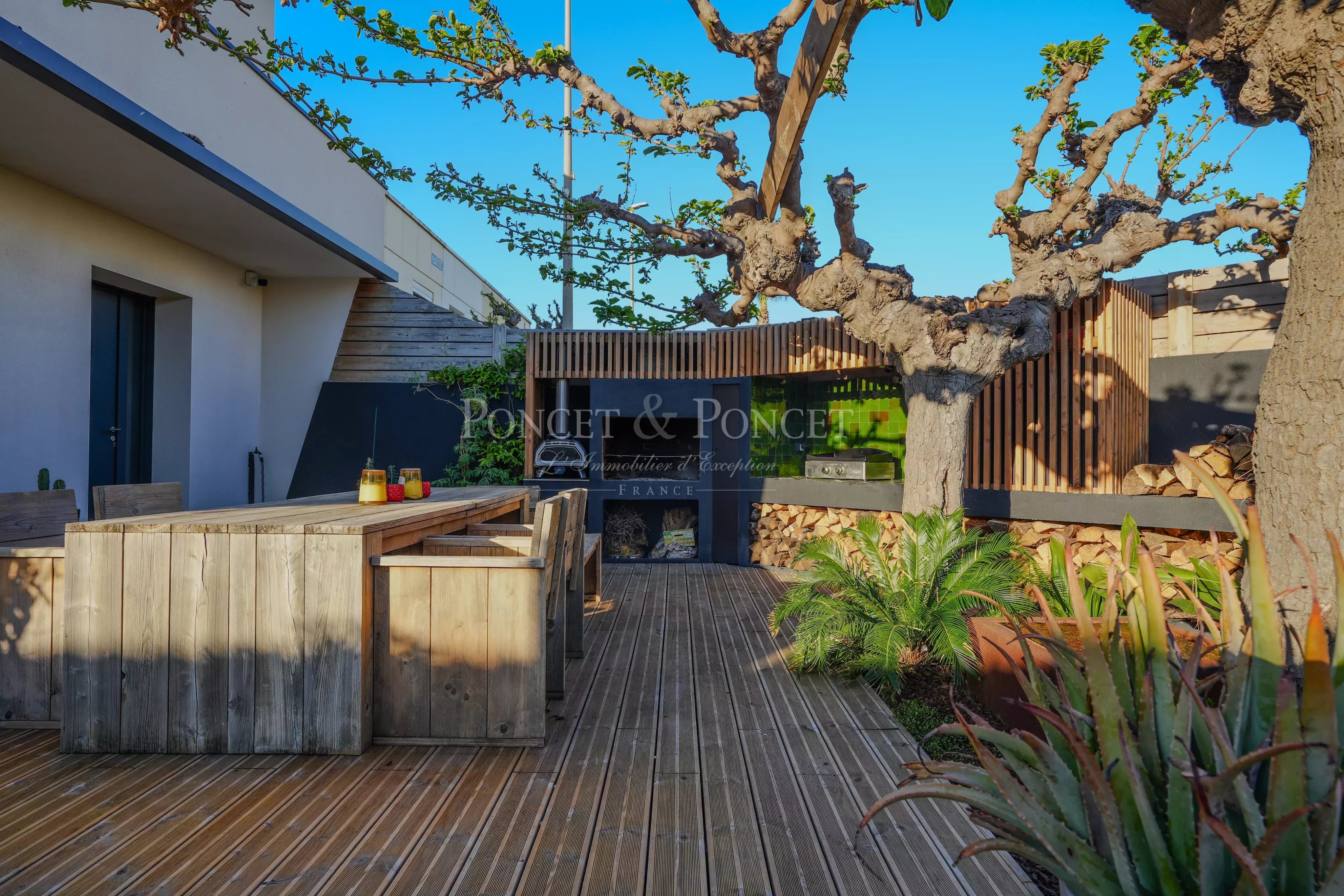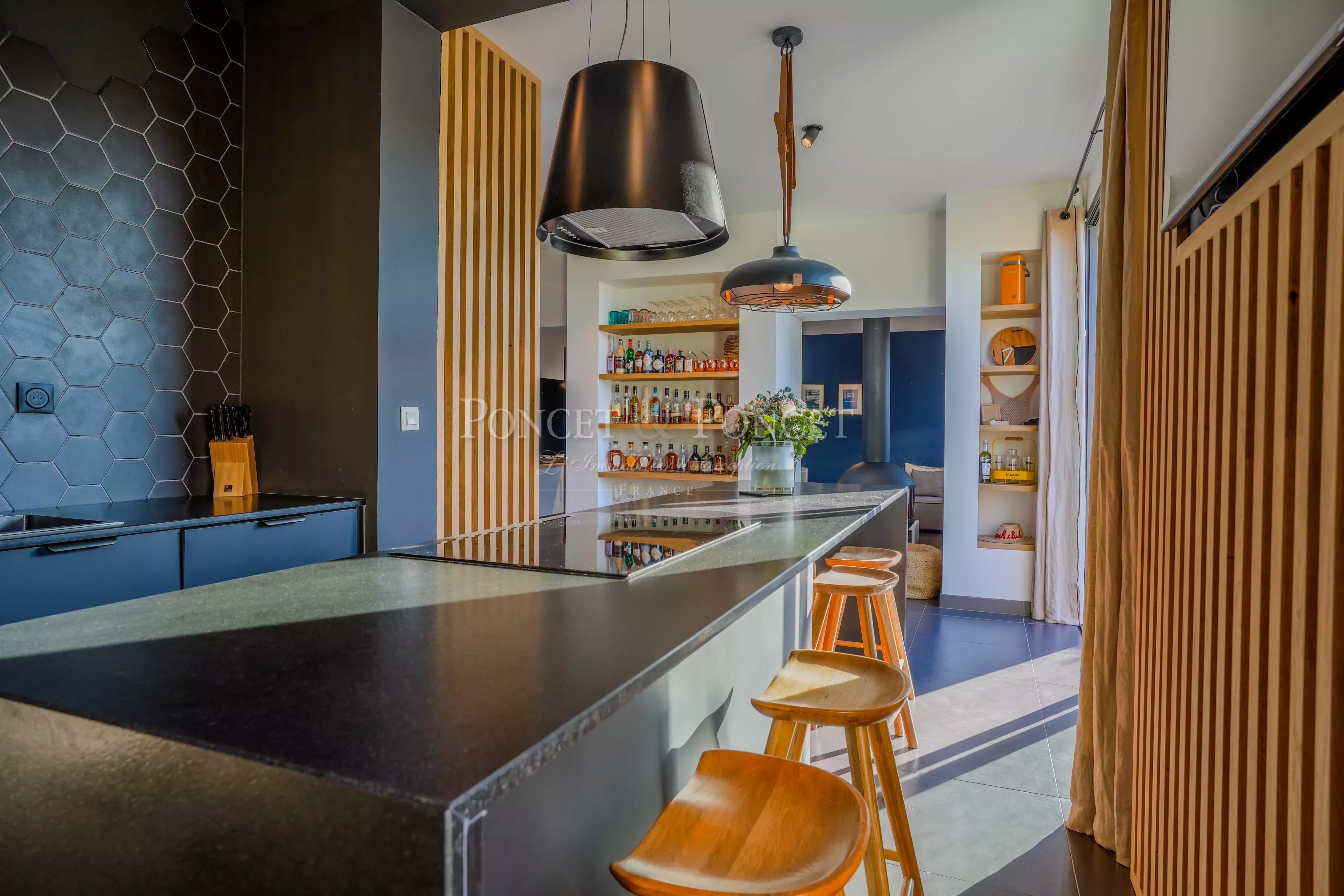 À quelques pas du rivage, là où l’air iodé caresse les pins et où chaque coucher de soleil embrase l’horizon, se niche cette villa rare, entièrement repensée par un architecte dans un esprit contemporain et lumineux.