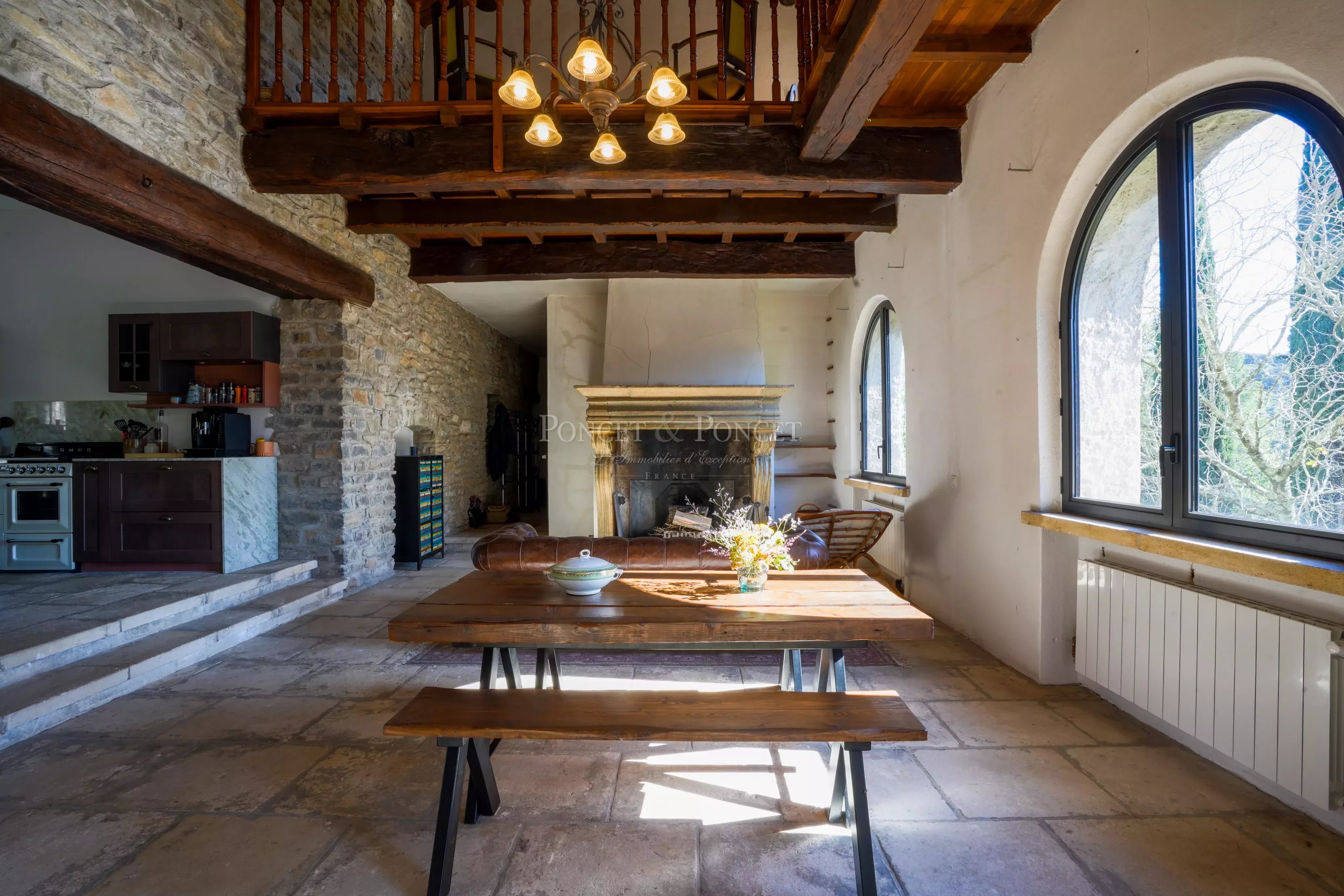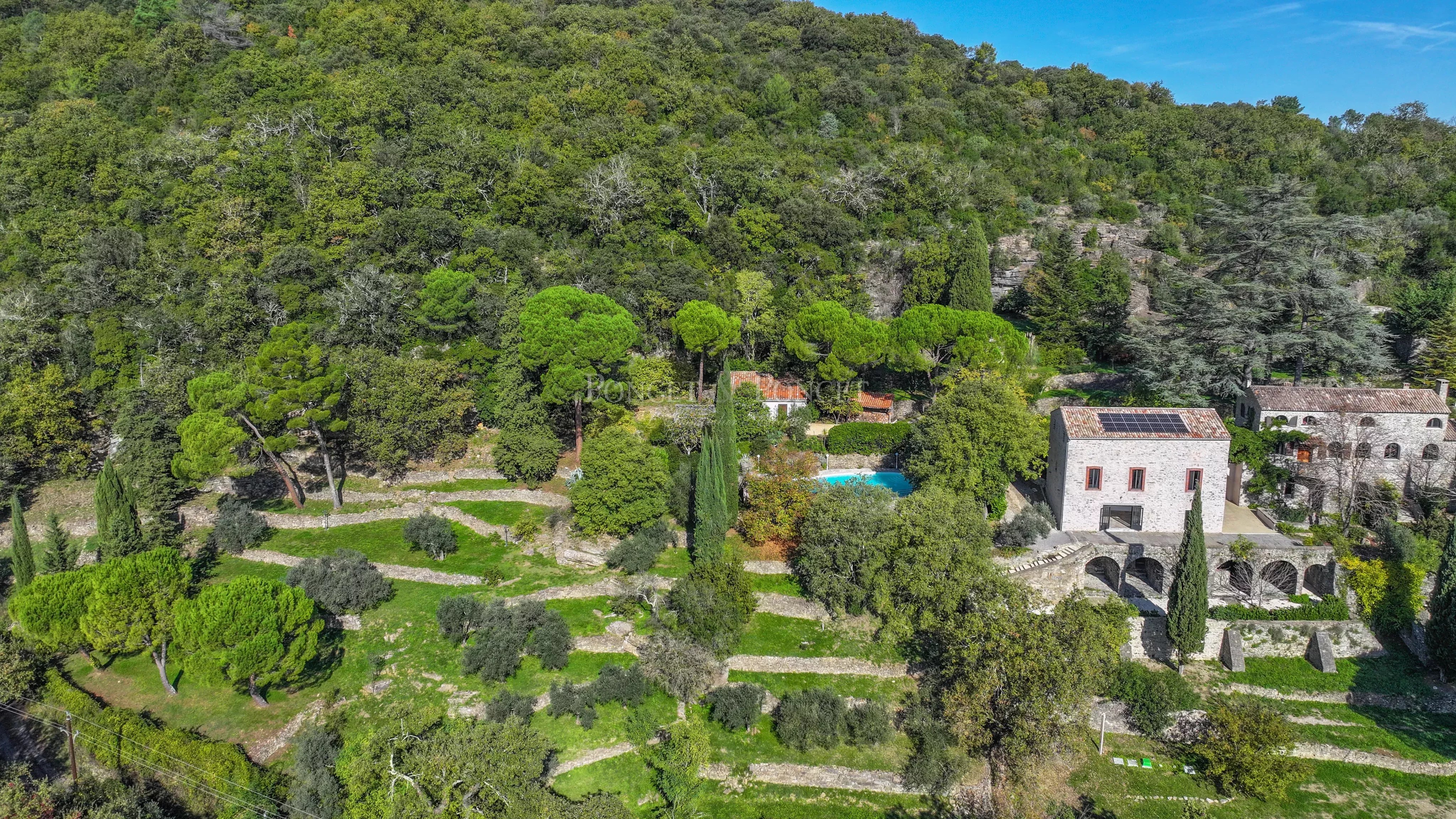 Ce domaine unique, constitué de deux anciennes filatures assises sur leurs belles arches en pierres, entièrement rénovées en 2021, proposent une surface habitable de 650 m², complété pour un studio indépendant voûté. Le tout est agrémenté de vastes espaces extérieur, cuisine d’été, espace détente, un grand bassin naturel alimenté par une source et une marre.
