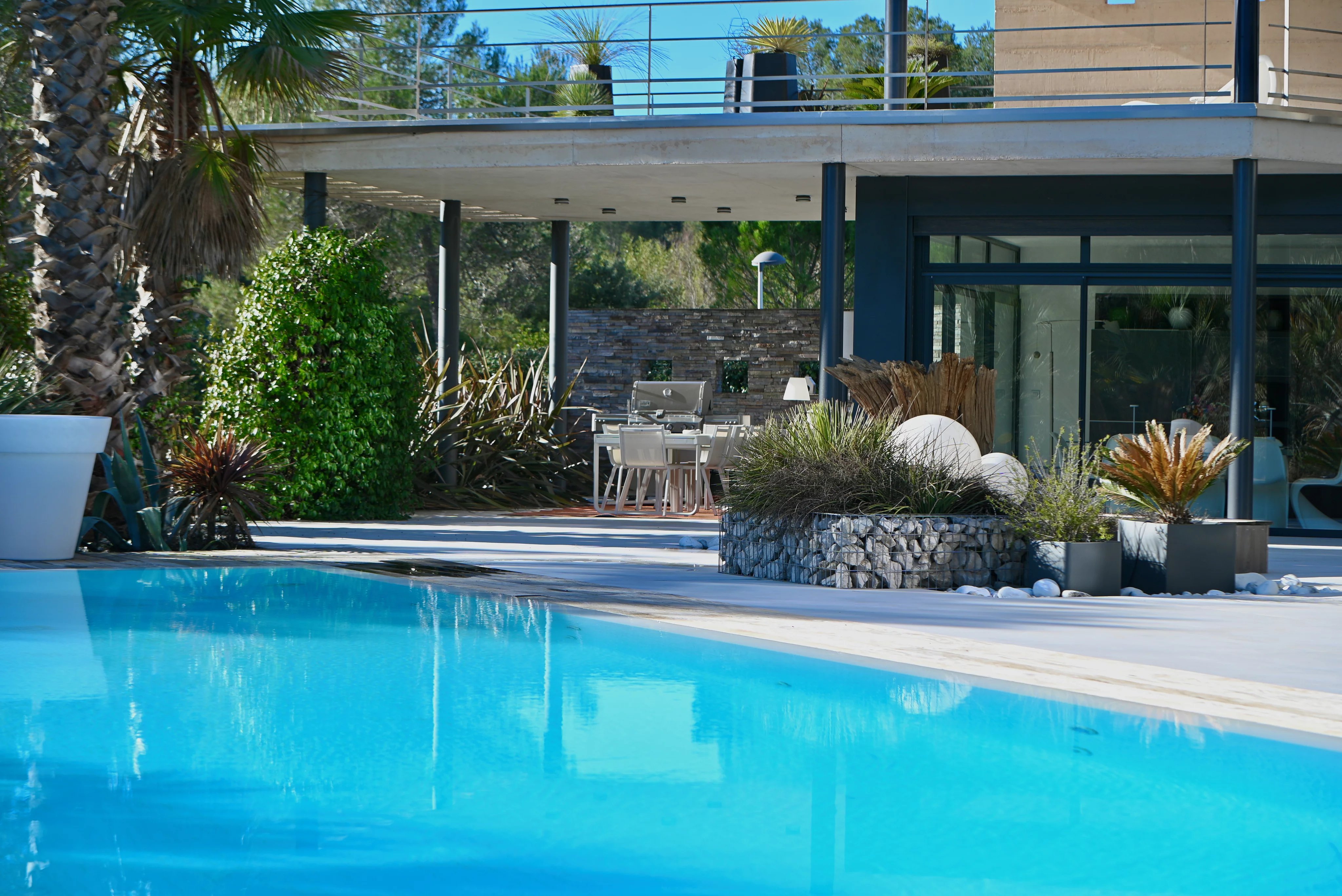 Le jardin, véritable écrin de verdure clôturé, accueille une superbe piscine miroir à débordement (14 × 5 m, traitement au sel), entourée de près de 270 m² de terrasses avec pool house et espaces de réception.