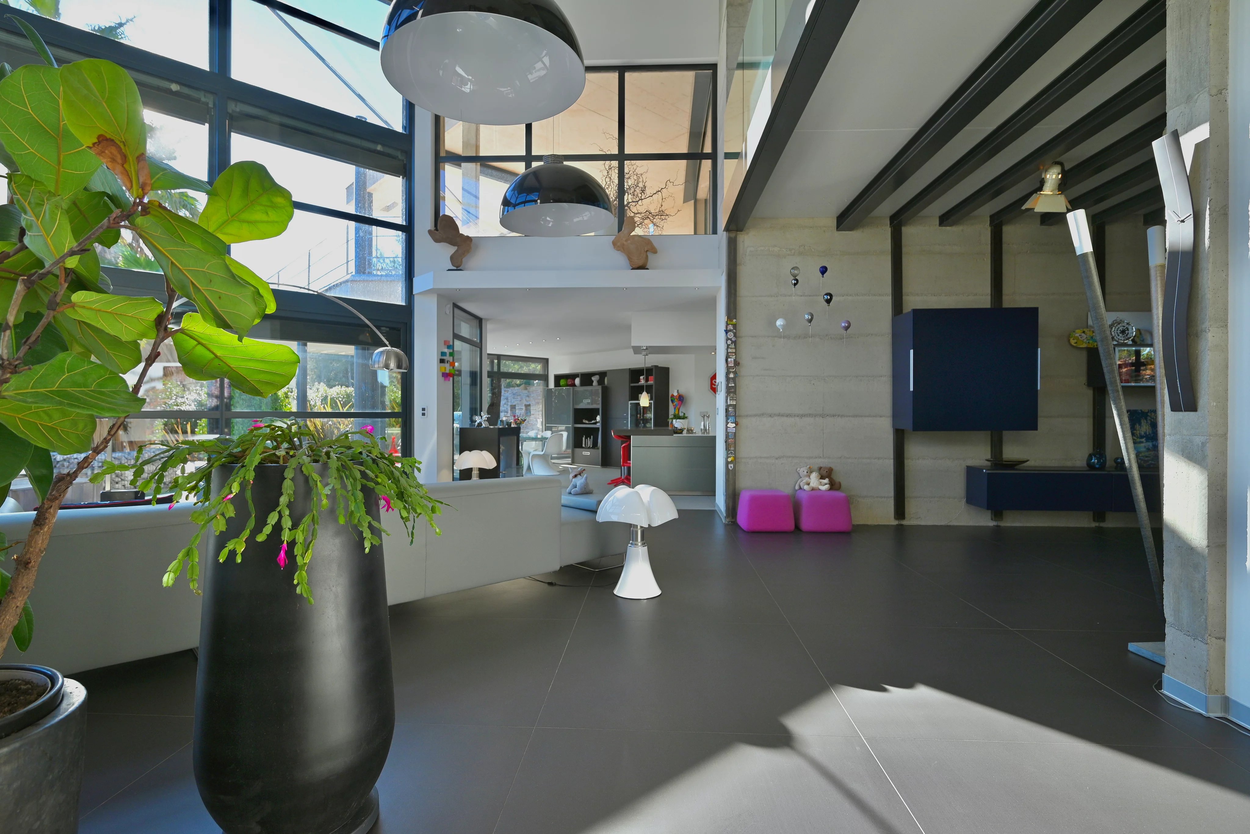 Dès l’entrée, le ton est donné par une pièce de réception spectaculaire de plus de 160 m². Baigné de lumière, cet espace offre une hauteur sous plafond impressionnante, créant une atmosphère de grandeur et de liberté. Il intègre une cuisine signée Bulthaup, entièrement équipée. En surplomb, une mezzanine de 33 m² fait office de bureau ou d'espace bibliothèque, dominant le séjour.