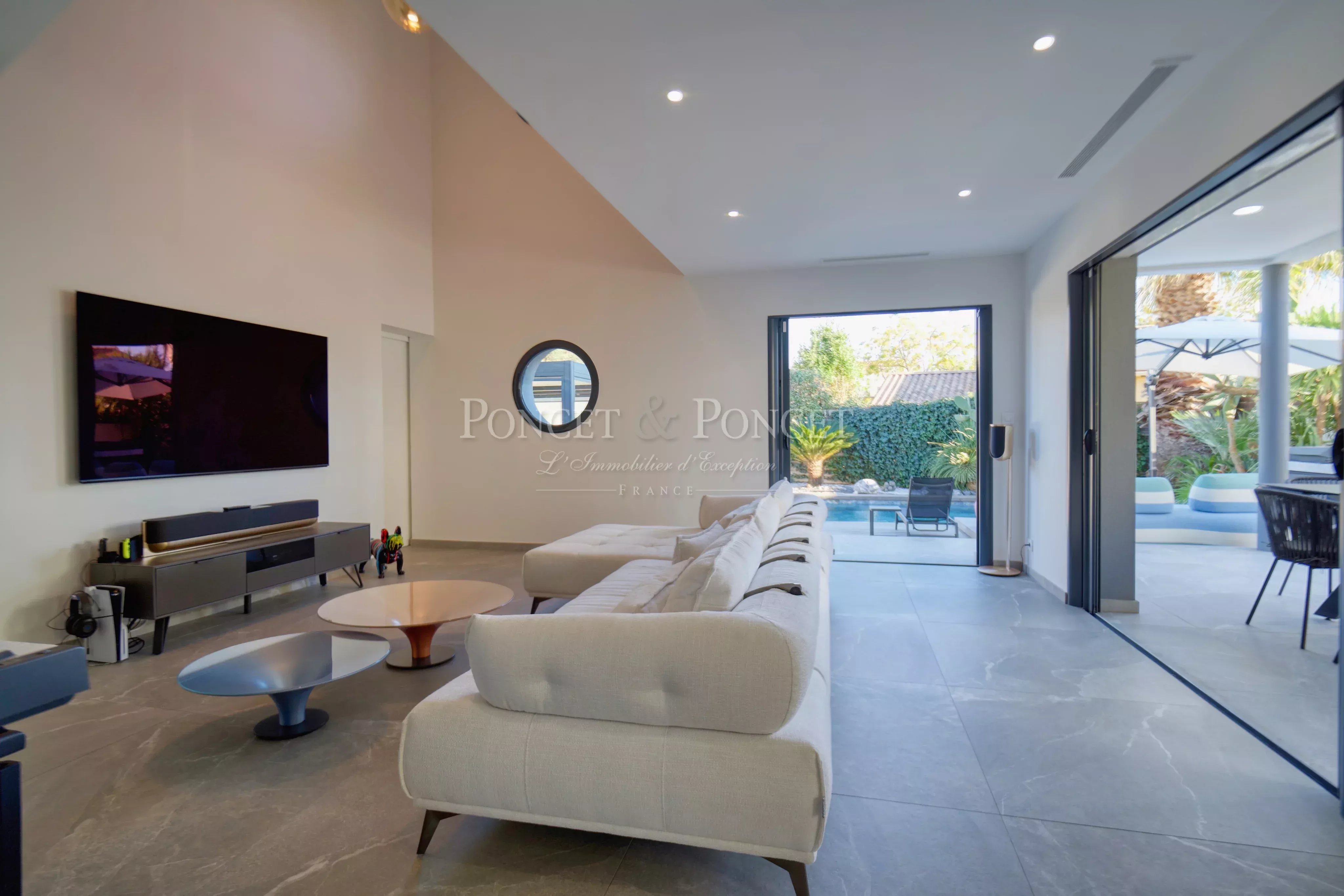 Les volumes généreux, la belle hauteur sous plafond et les grandes baies vitrées, baignant le séjour de lumière, offrent une parfaite continuité vers les terrasses.