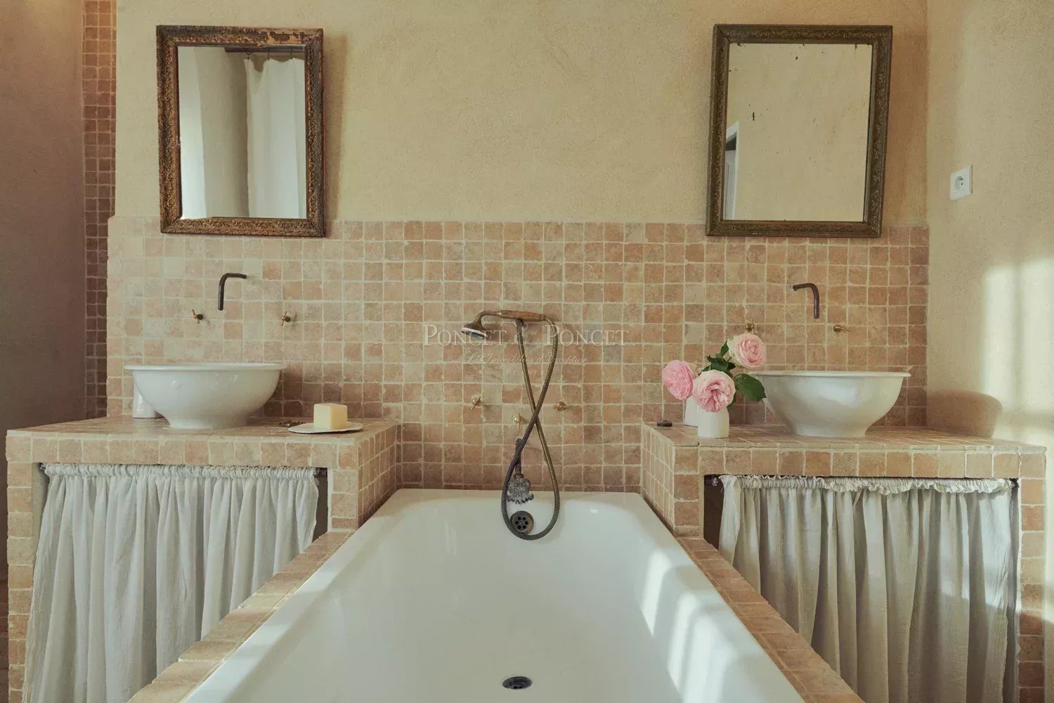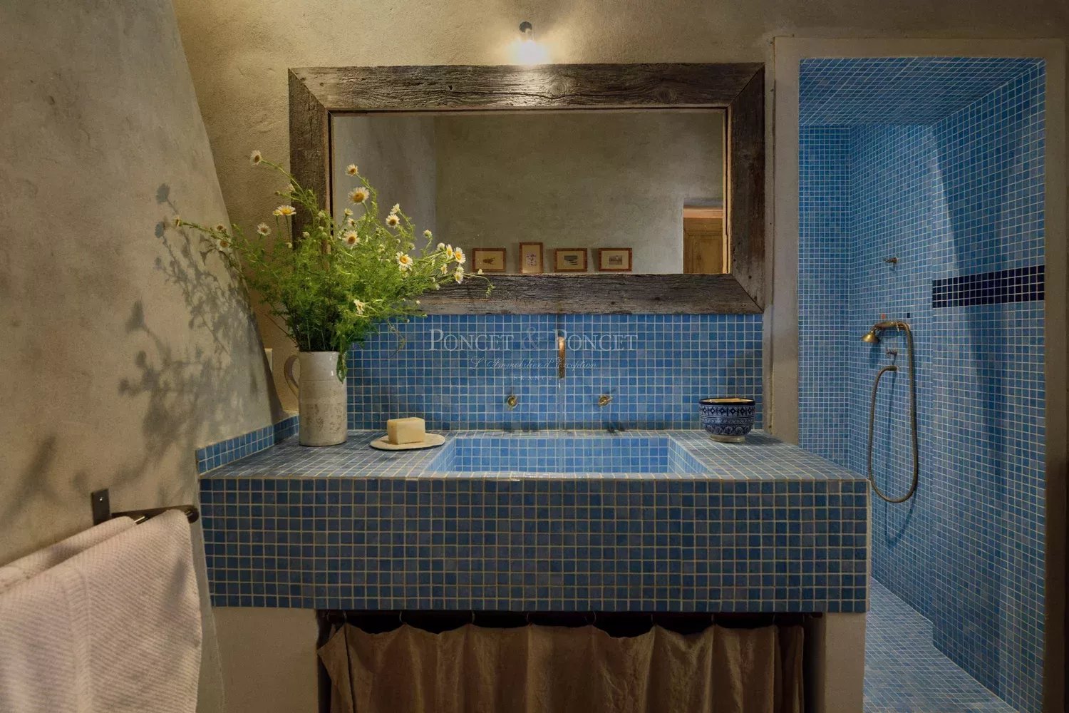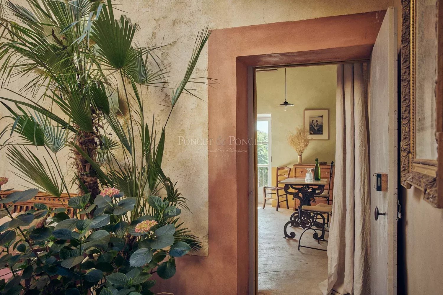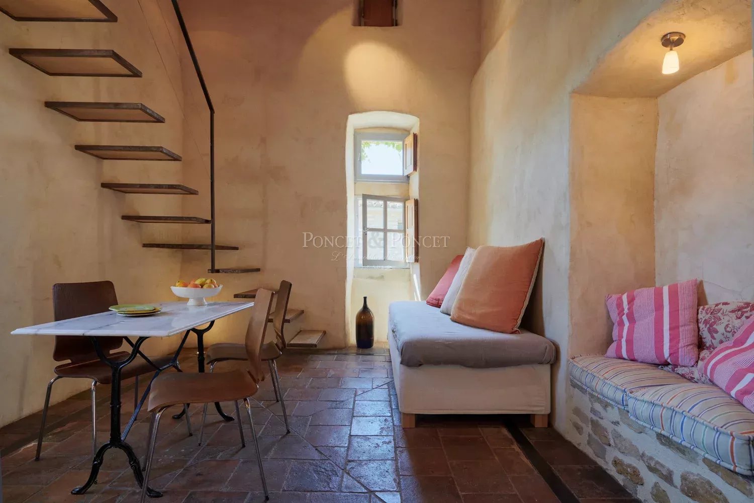 Derrière ses murs de pierre se cache une cour intérieure ensoleillée, animée par une piscine élégante et plusieurs coins détente ombragés. Une terrasse suspendue offre une vue dégagée sur le jardin méditerranéen, planté de cyprès, glycines et autres essences locales.