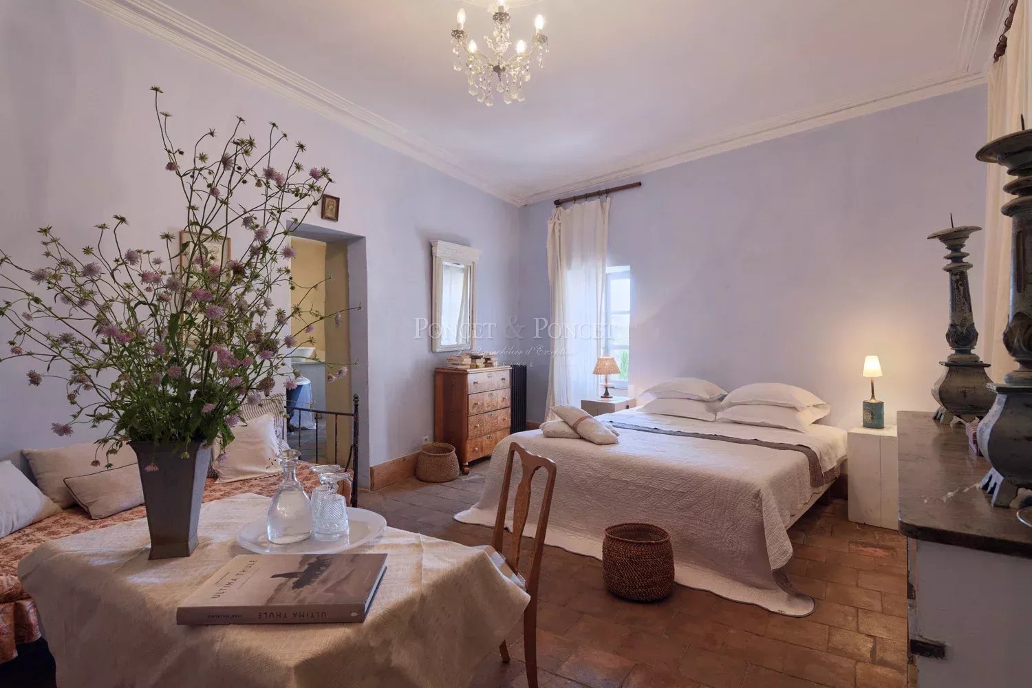 Les chambres, vastes et sereines, préservent l’âme des lieux avec leurs plafonds en bois, murs à la chaux, sols en pierre naturelle et vues sur la verdure. Chacune offre un confort élégant et une ambiance feutrée. Neuf salles de bains viennent compléter ce lieu de vie pour une grande famille ou pour de la location saisonnière d’appartements.
