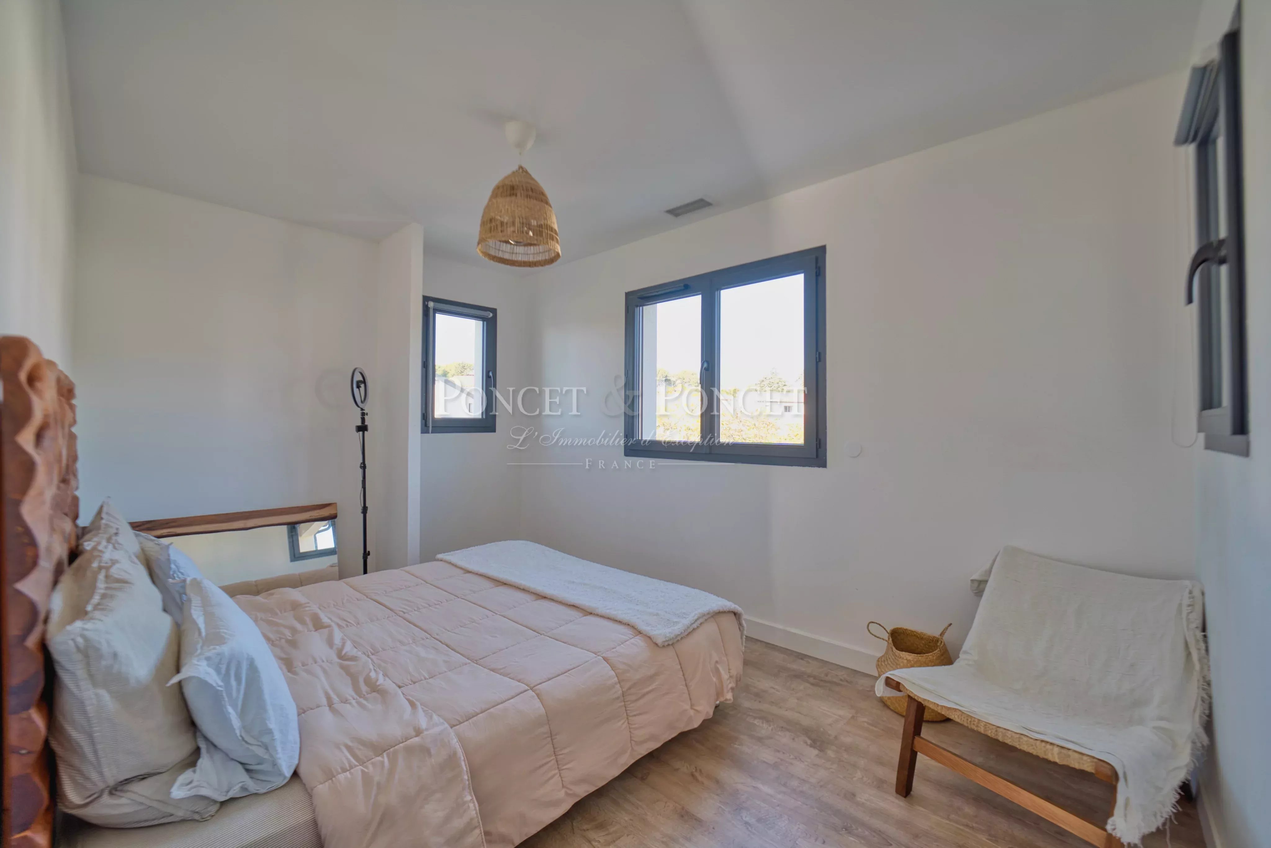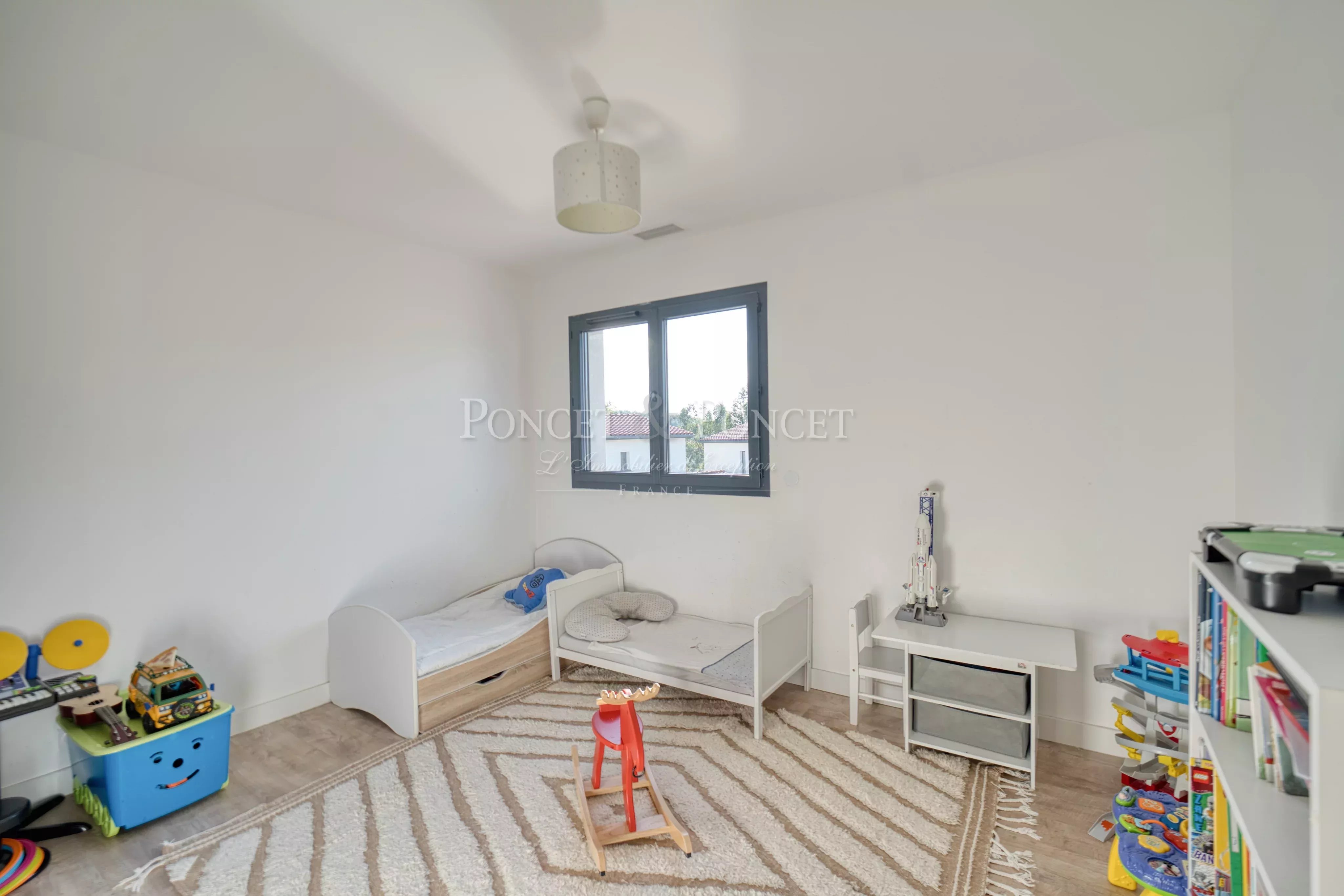 Dans un quartier résidentiel calme, à seulement 5 minutes à pied du tramway, villa contemporaine de 2020 d’environ 135 m² sur une parcelle de 400 m².