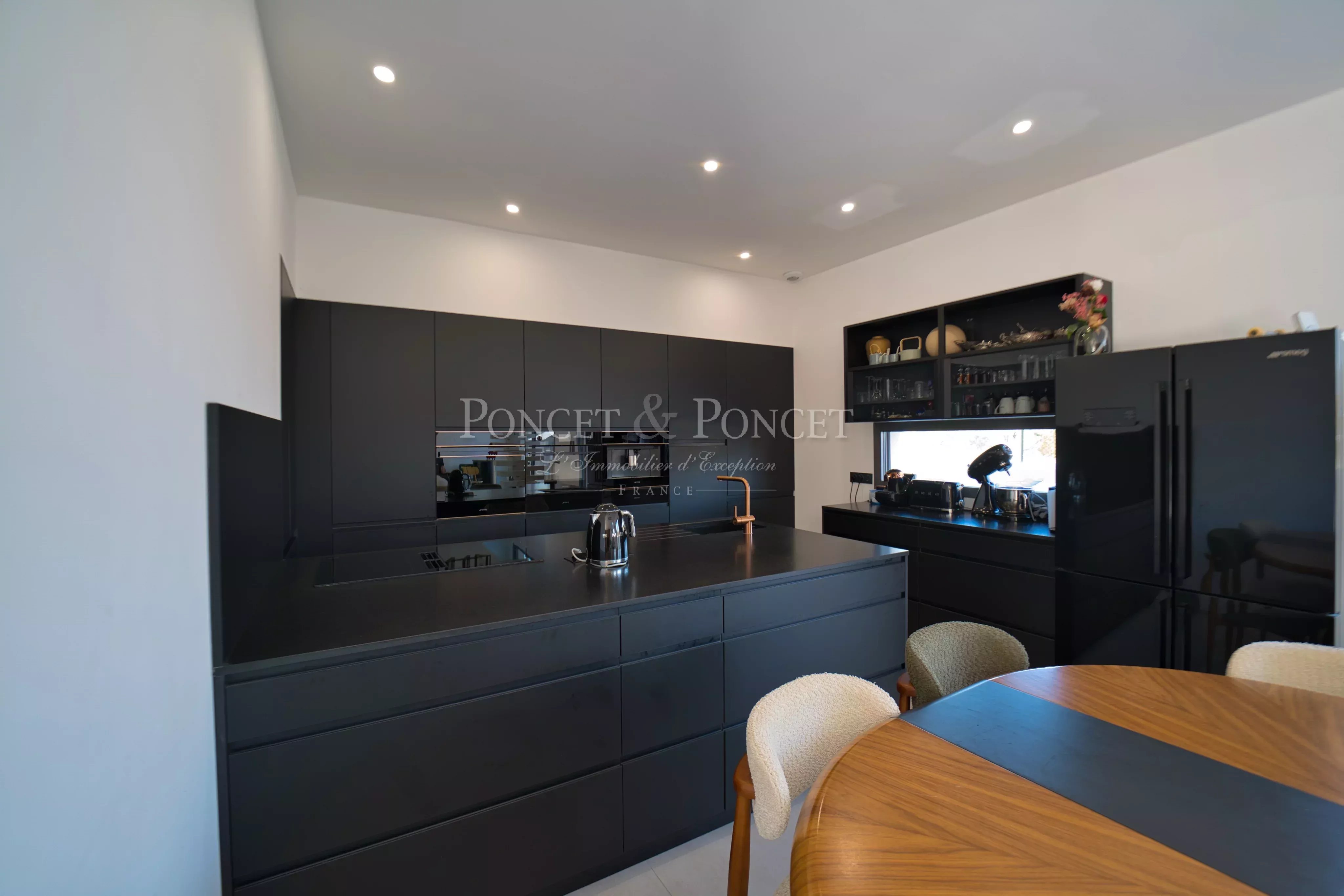 La cuisine haut de gamme, entièrement équipée et aménagée avec des matériaux nobles, s’ouvre sur le salon dans une atmosphère conviviale et raffinée.