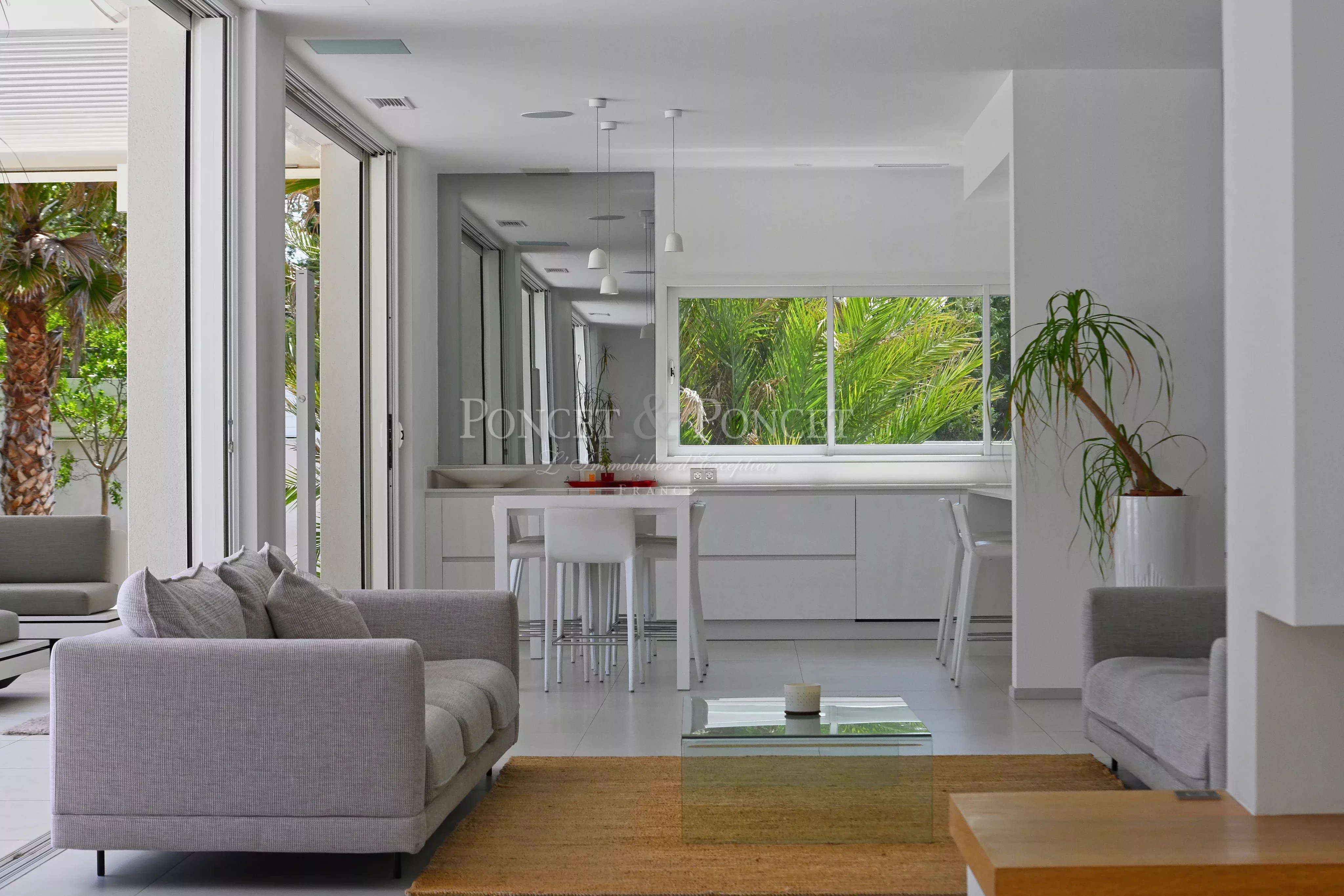 Dès l’entrée, les volumes impressionnent. Le vaste hall dessert deux pièces de vie lumineuses : un salon et une cuisine avec salle à manger. Ces espaces s’ouvrent généreusement sur l’extérieur grâce à de larges baies vitrées à galandage, offrant une continuité parfaite entre intérieur et jardin, dans un esprit in & out rarement vu. Toutes les baies de la villa sont en galandage, renforçant la sensation d’ouverture. Une arrière-cuisine, un cellier, une buanderie, un bureau, ainsi que deux suites complètent ce niveau.