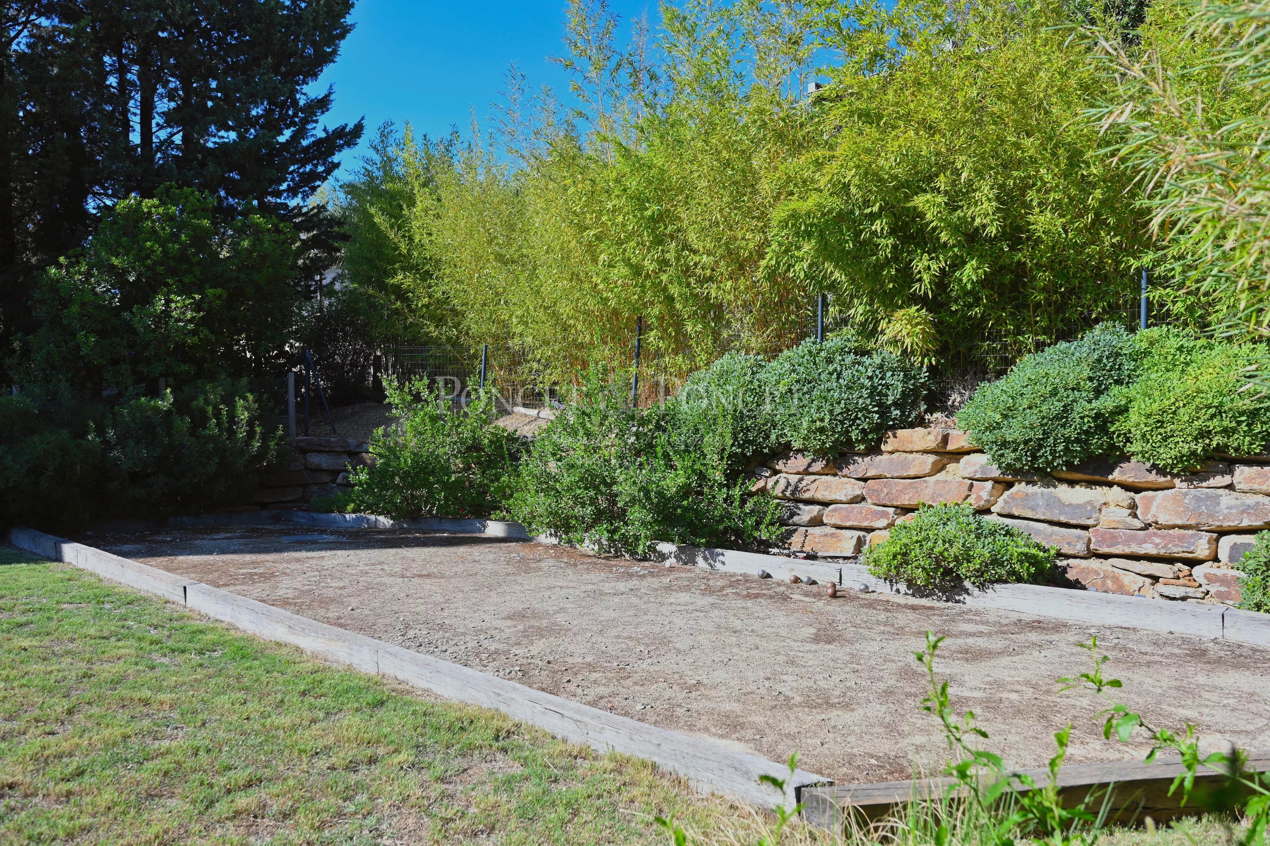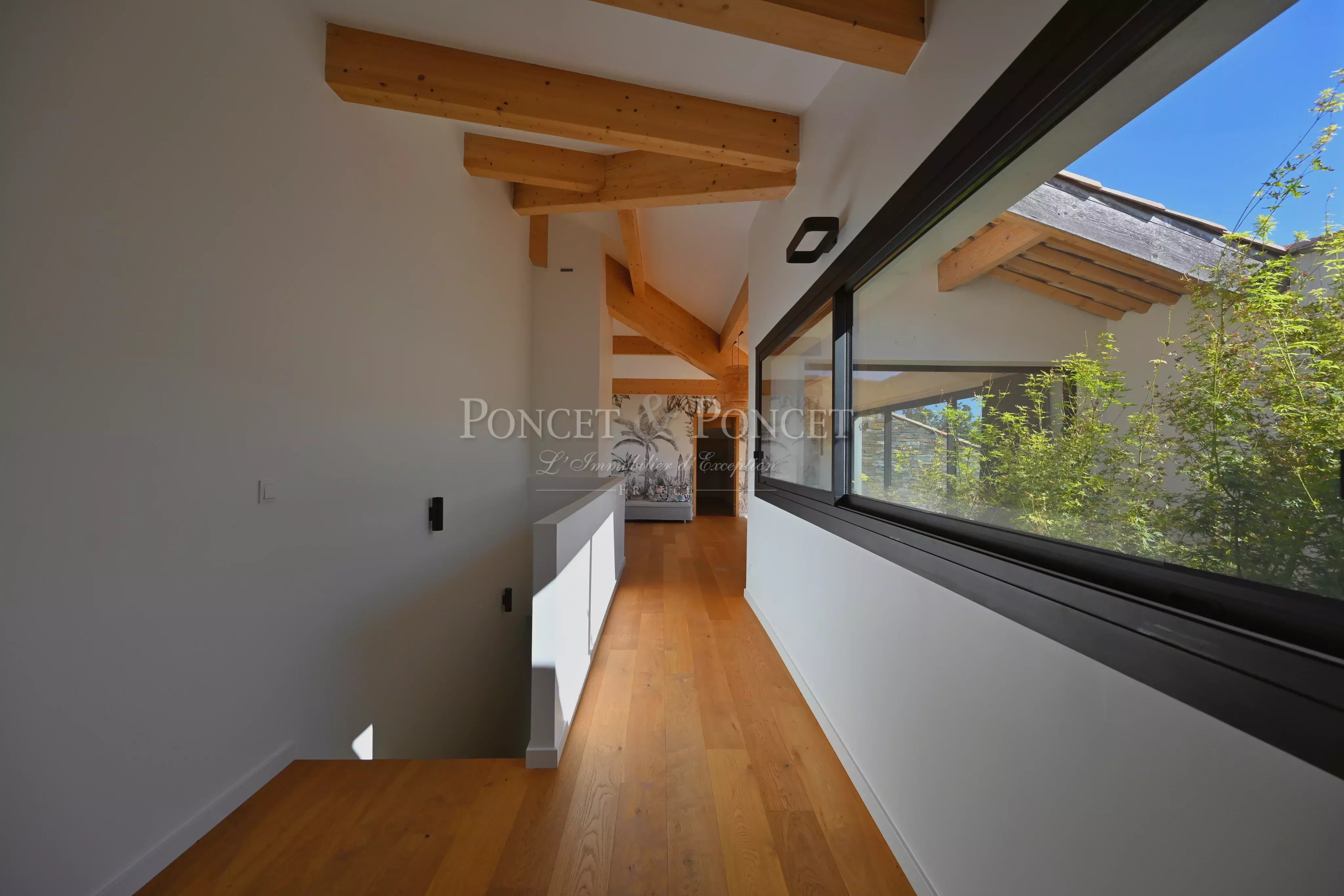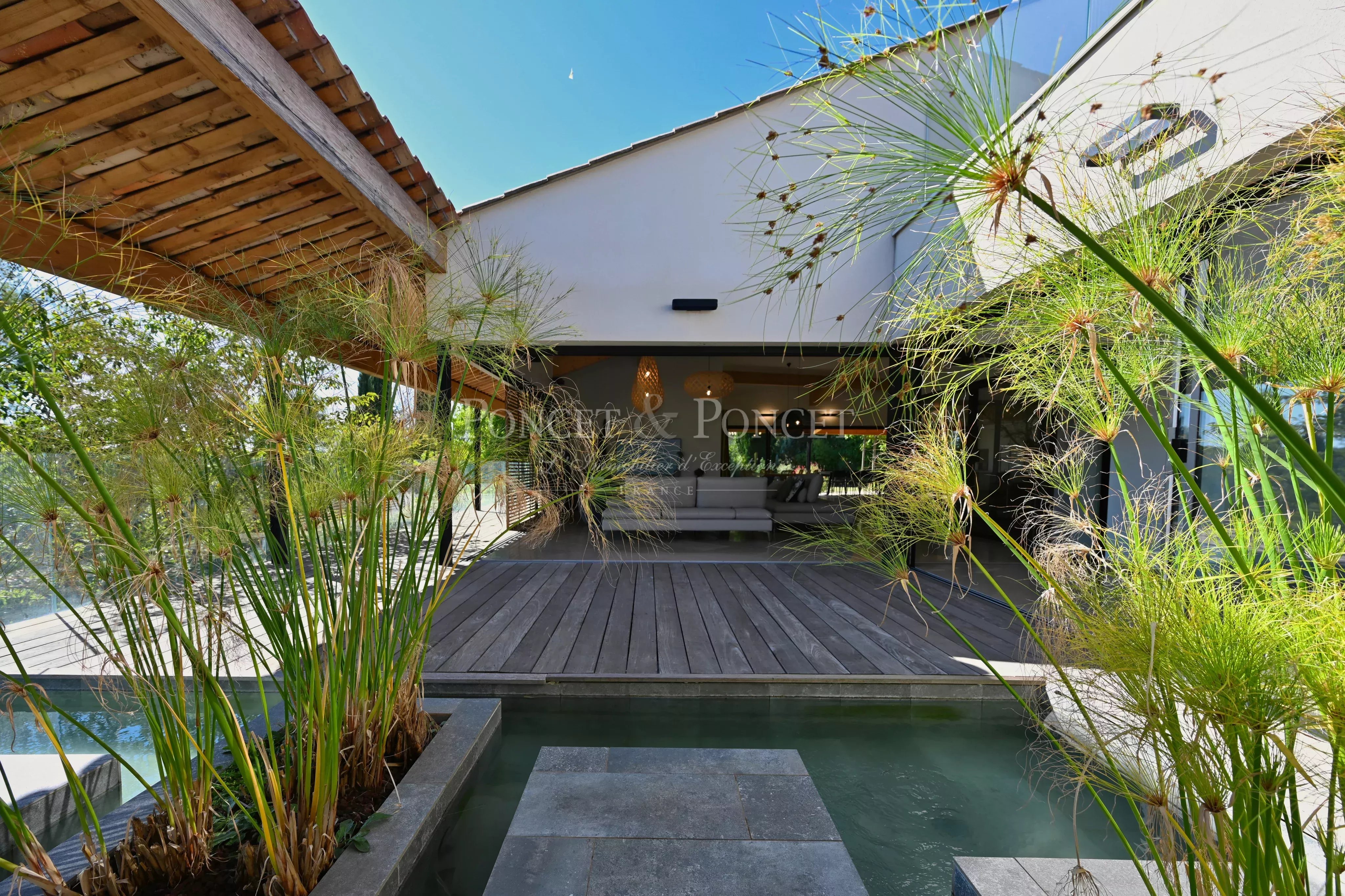 Au rez-de-chaussée, un grand open space réunit salon, salle à manger et cuisine américaine. L’ensemble s’ouvre sur de vastes terrasses et un jardin paysager avec potager, espace de jeux plat et terrain de pétanque. Une cuisine d’été avec salle à manger extérieure prolonge l’espace convivial.