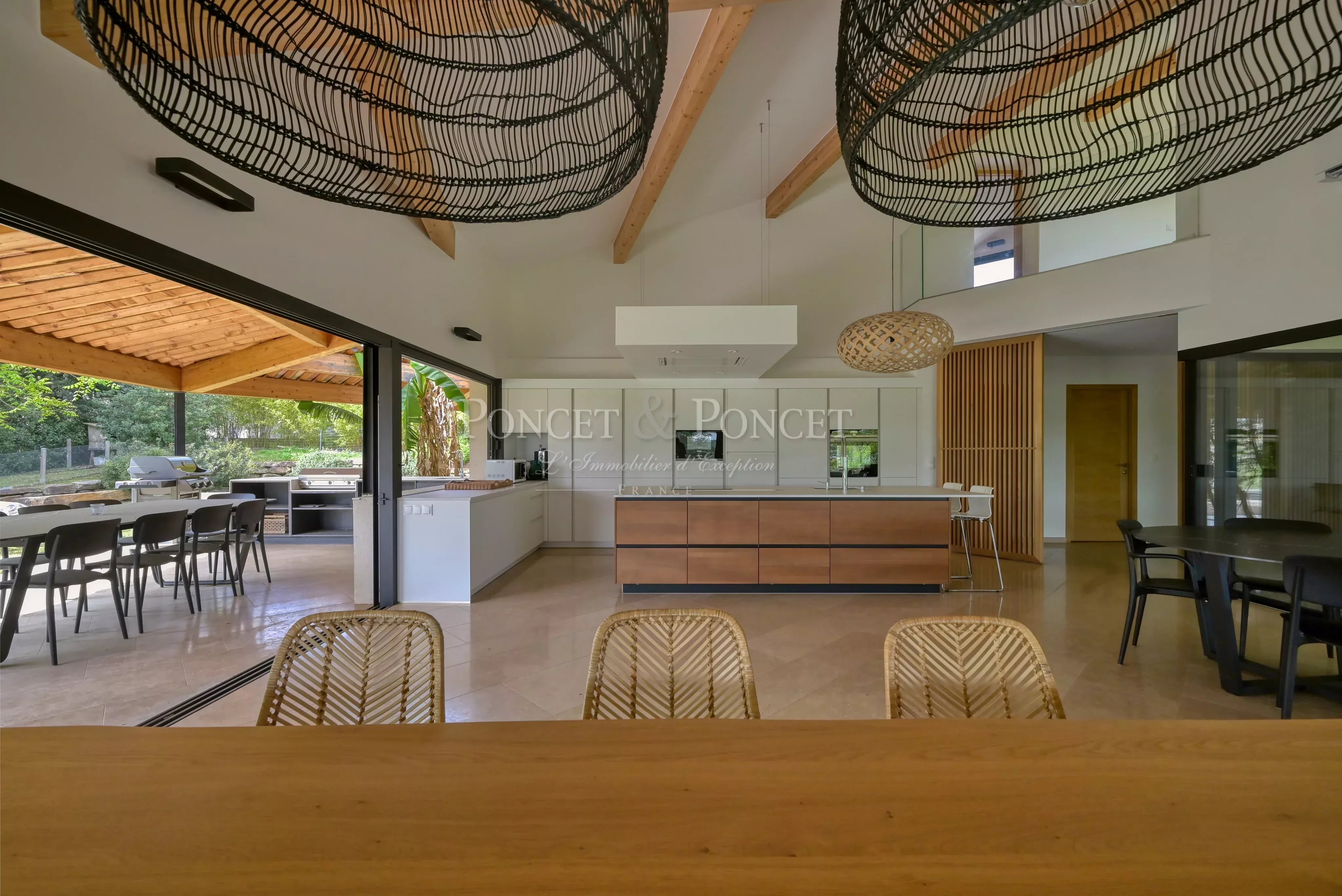 Au rez-de-chaussée, un grand open space réunit salon, salle à manger et cuisine américaine. L’ensemble s’ouvre sur de vastes terrasses et un jardin paysager avec potager, espace de jeux plat et terrain de pétanque. Une cuisine d’été avec salle à manger extérieure prolonge l’espace convivial.