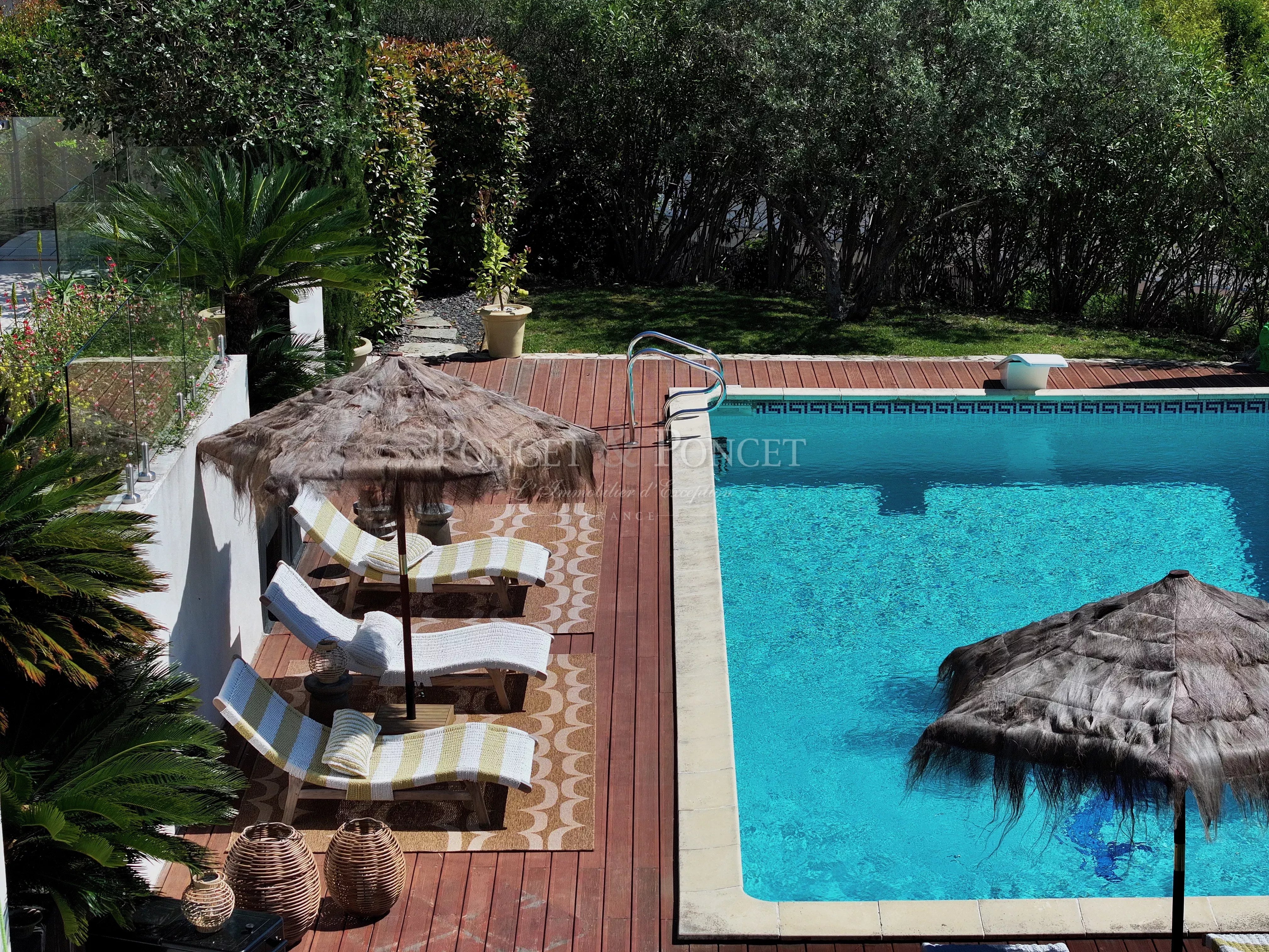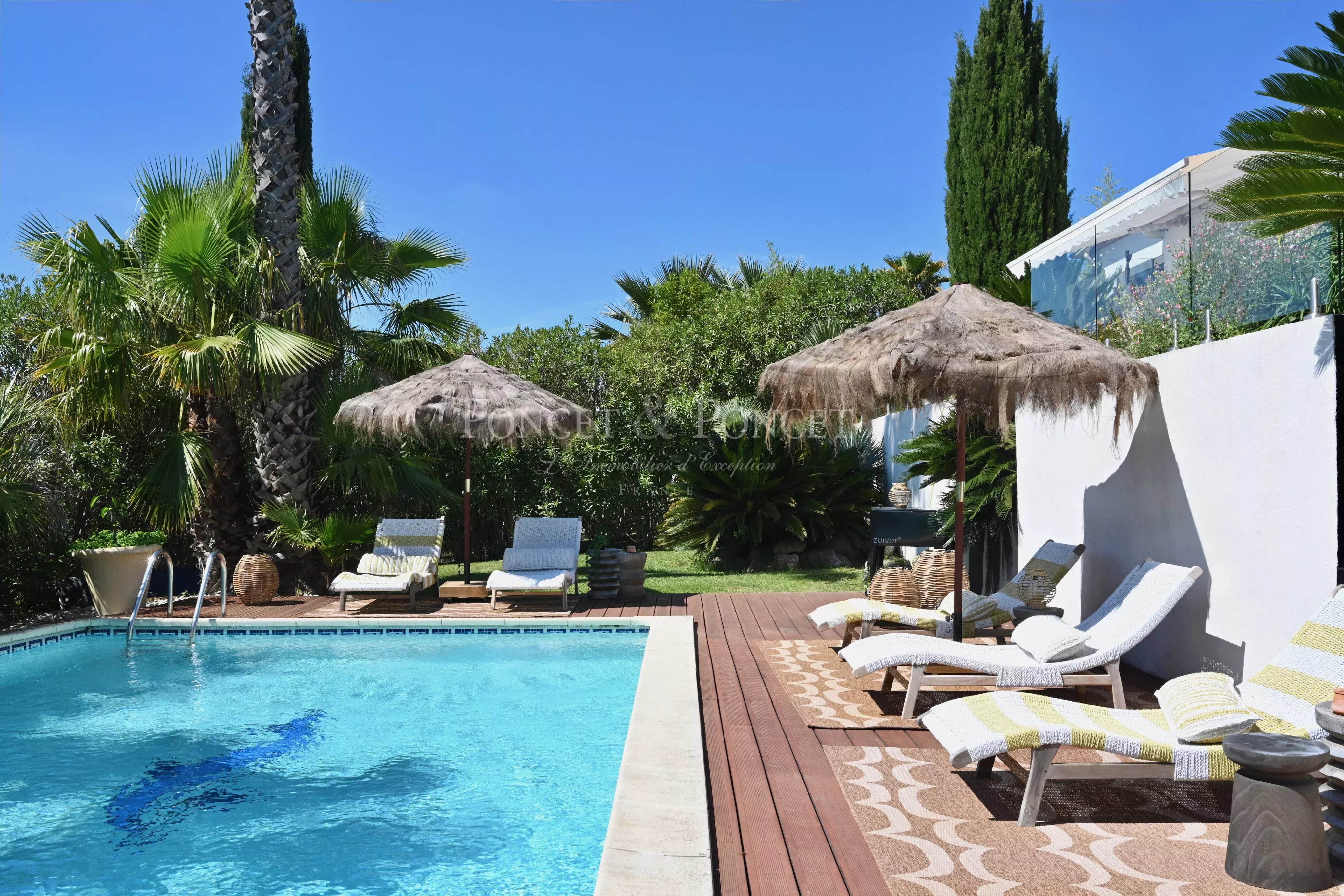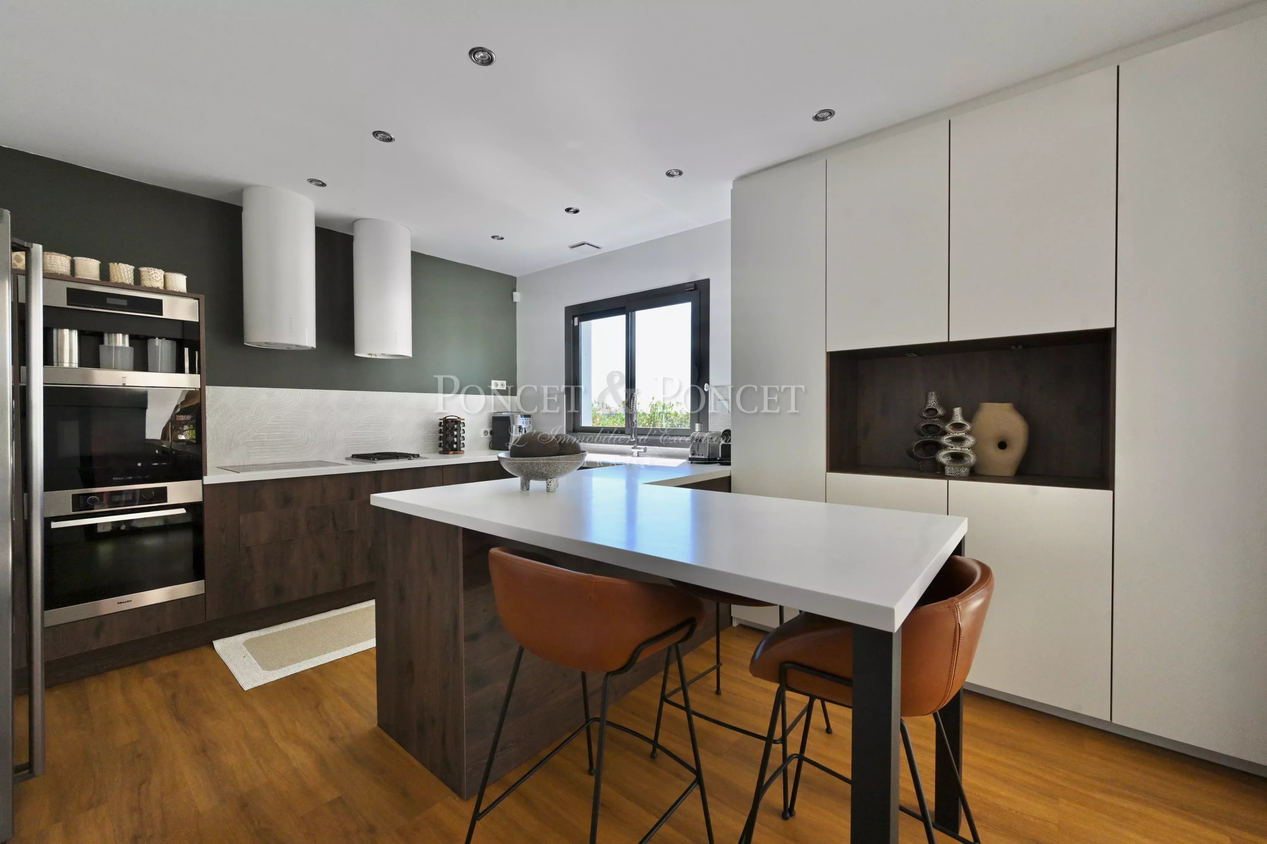 Dès l’entrée, vous serez séduit par la luminosité et la modernité de cette maison. Elle s'ouvre sur un salon spacieux et une salle à manger conviviale, créant ainsi un espace de vie chaleureux, idéal pour recevoir famille et amis. La cuisine américaine entièrement équipée, avec ses électroménagers de haute qualité possède également un back office. Ces espaces sont ouverts par de larges baies sur la grande terrasse extérieure avec une vue imprenable.