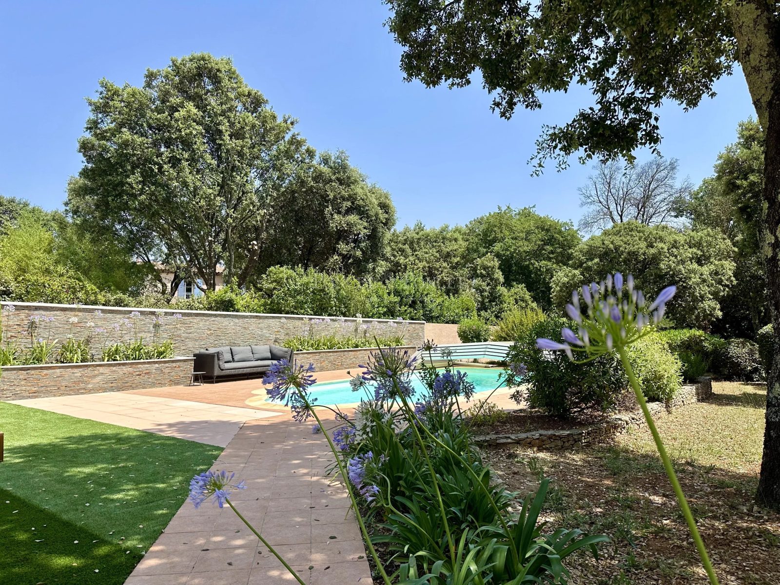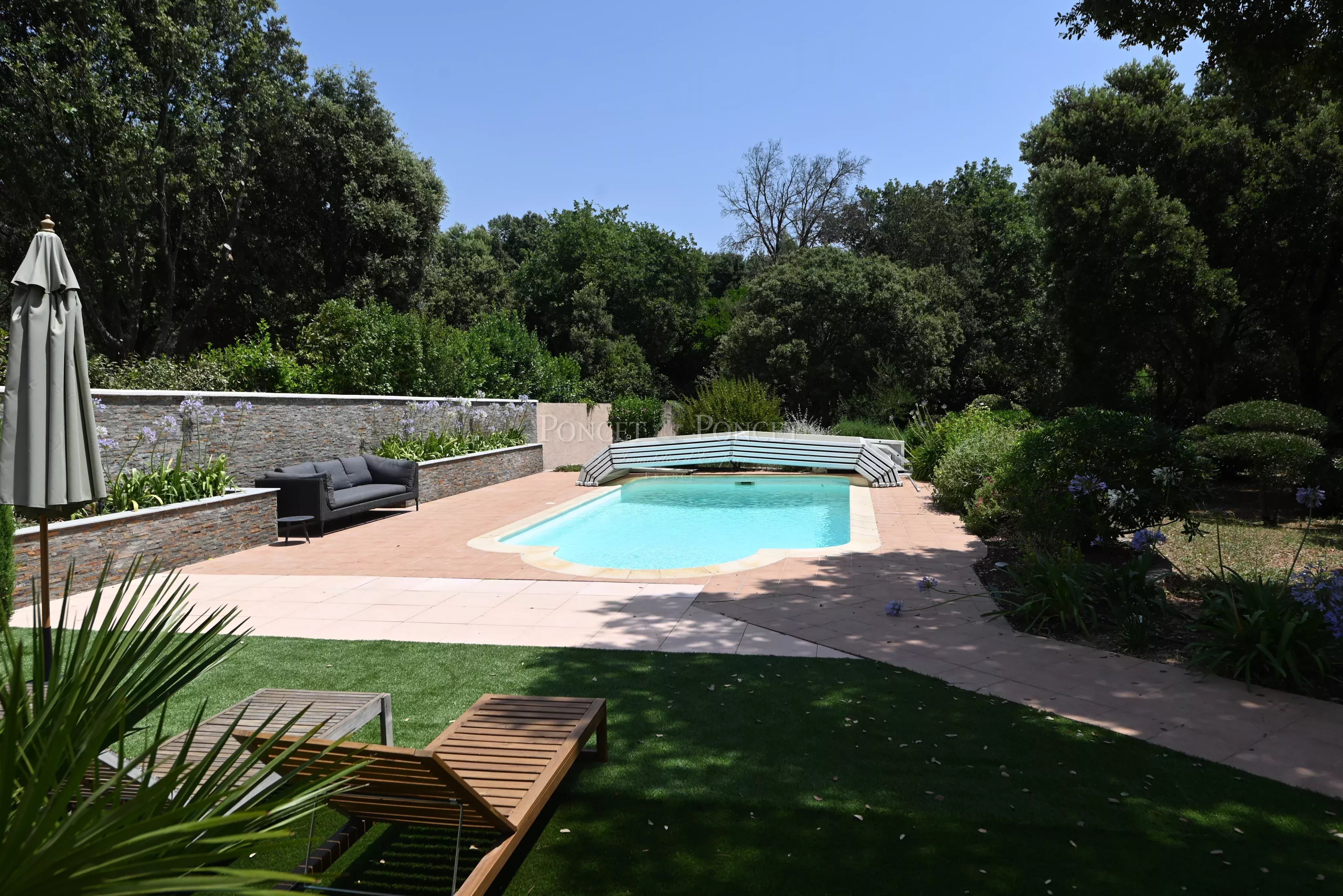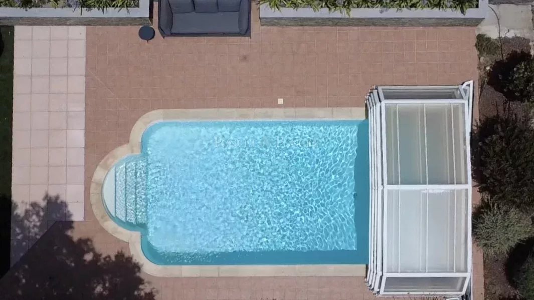 Les extérieurs sont un véritable havre de paix : une piscine (8x6m) aux lignes douces, couvrable par une coque, s’intègre parfaitement dans cet écrin de verdure. Plusieurs terrasses vous permettent de profiter pleinement du soleil ou de l’ombre, selon l’heure du jour.