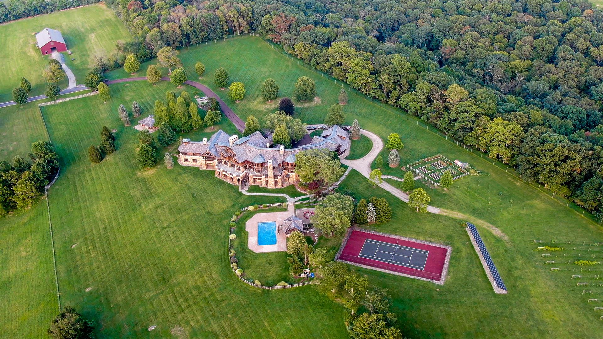 Nestled within 125 acres of rolling hills in Hunterdon County, New Jersey, equidistant between New York City and Philadelphia, Windward Farm offers the perfect marriage of nature and world class craftsmanship. This secluded estate offers gorgeous views of the surrounding mountains and valleys. Every aspect of the property strikes the perfect balance of refined luxury living and natural elegance, offering both an unparalleled home and unlimited opportunity to entertain loved ones and associates, at gatherings both intimate and formal. Custom features are seen throughout, meticulously incorporating the very finest building materials and resulting in a structure with materials incapable of duplication, surrounded by expansive property perfectly situated to maximize the extraordinary views. The main residence perches at the highest point of the property, and stone terraces face breathtaking sunsets. Extending over a quarter of a mile, the custom wide driveway is flanked by river stone and bordered by open fields, beautiful barns and acres of vineyards. Over 18,000 square feet of living space presents a harmonious blend of natural materials throughout all three levels, including massive solid wood beams harvested specifically for the construction. Hand carved front entry doors integrate eight separate wood panels as art meets function. Hardwood and natural stone floors throughout the house, multiple zones of radiant heat, and 10 zones of central air make this home as comfortable as it is beautiful. Custom stone work, millwork, plaster finishes, doors and windows provide a feeling of both quality and substance rarely seen. The center jewel of the home is the Great Room. With soaring ceilings and one of seven massive stone fireplaces, dramatic custom geometric windows, a double-loft and expansive mountain-views, it can easily accommodate 100 plus guests. Stone arches on either side of the Great Room flow into wide galleries ideally suited for the finest art installations. A library with custom built-in cabinetry and another soaring wood burning stone fireplace offers a quiet space for private study, meetings, and contemplation. The open family room adjacent to the beautiful custom chef's kitchen, offers yet another wood burning stone fireplace and built-in surround sound. Step outside the family room onto a covered stone terrace with outdoor dining area, stone fireplace and magnificent westerly views for enjoying extraordinary sunsets as the day ends and the sun kisses the horizon. This terrace extends the entire length of the home and culminates with a second covered area adjacent to the master bedroom suite. In addition to being an extraordinary place to call home, Windward Farm offers a variety of amenities and features found at the finest of resorts and spas. An indoor regulation Squash court, eight person Swedish wet/dry sauna, 1,000 square feet dedicated to gym/yoga space, game room, outdoor tennis court, a five-person jacuzzi and heated 50'x 25' saltwater pool are some of the amenities available to the future owner of this magnificent property. And Windward Farm is, indeed, a farm. The property offers a massive raised bed organic vegetable garden, apiary, fig orchard, and two vineyard areas dedicated to the growing of vinifera of several varieties along with acres of additional fields waiting to be cultivated. Fresh herbs abound, gallons of pure honey are gifted by the millions of worker bees, and farm fresh eggs are plentiful. The vineyards have been designed with space to accommodate large outdoor functions or intimate vineyard dinners. In addition to two renovated historic barns, the property offers a newly constructed 7,200SF clear span pole barn with 18-foot ceilings, a 20,000-kilowatt solar panel system, and a separately housed commercial generator with 4,000 gal-tank and refueling station. After touring Windward Farm, you will understand that for the fortunate buyer, this property provides an incomparable lifestyle only achieved by few, and an opportunity to continue the legacy of the property with your own creativity and vision. A Christie's International Real Estate Signature Program property.